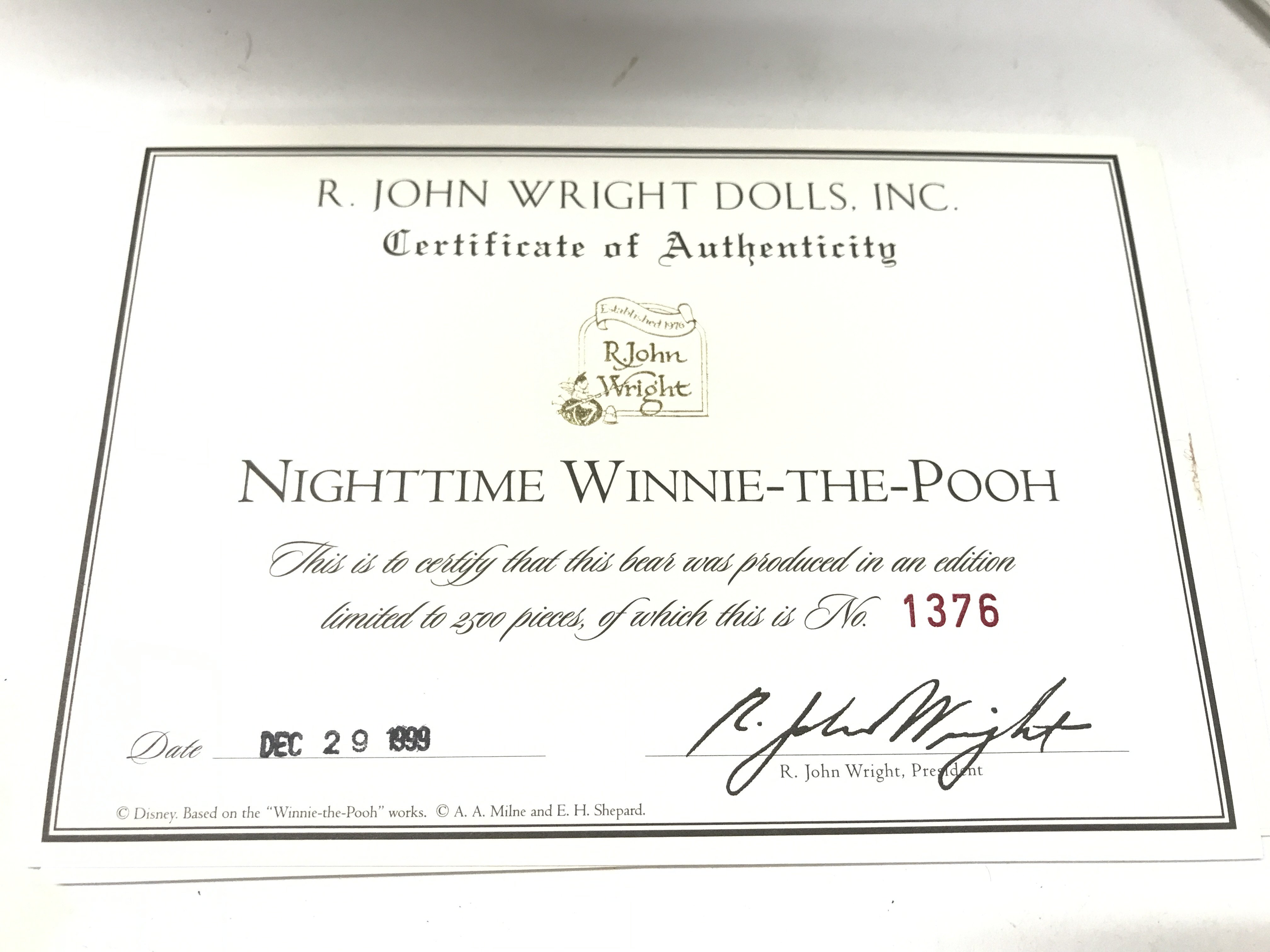 A Boxed R.John Wright Dolls Winnie The Pooh Nighttime. With Certificate.