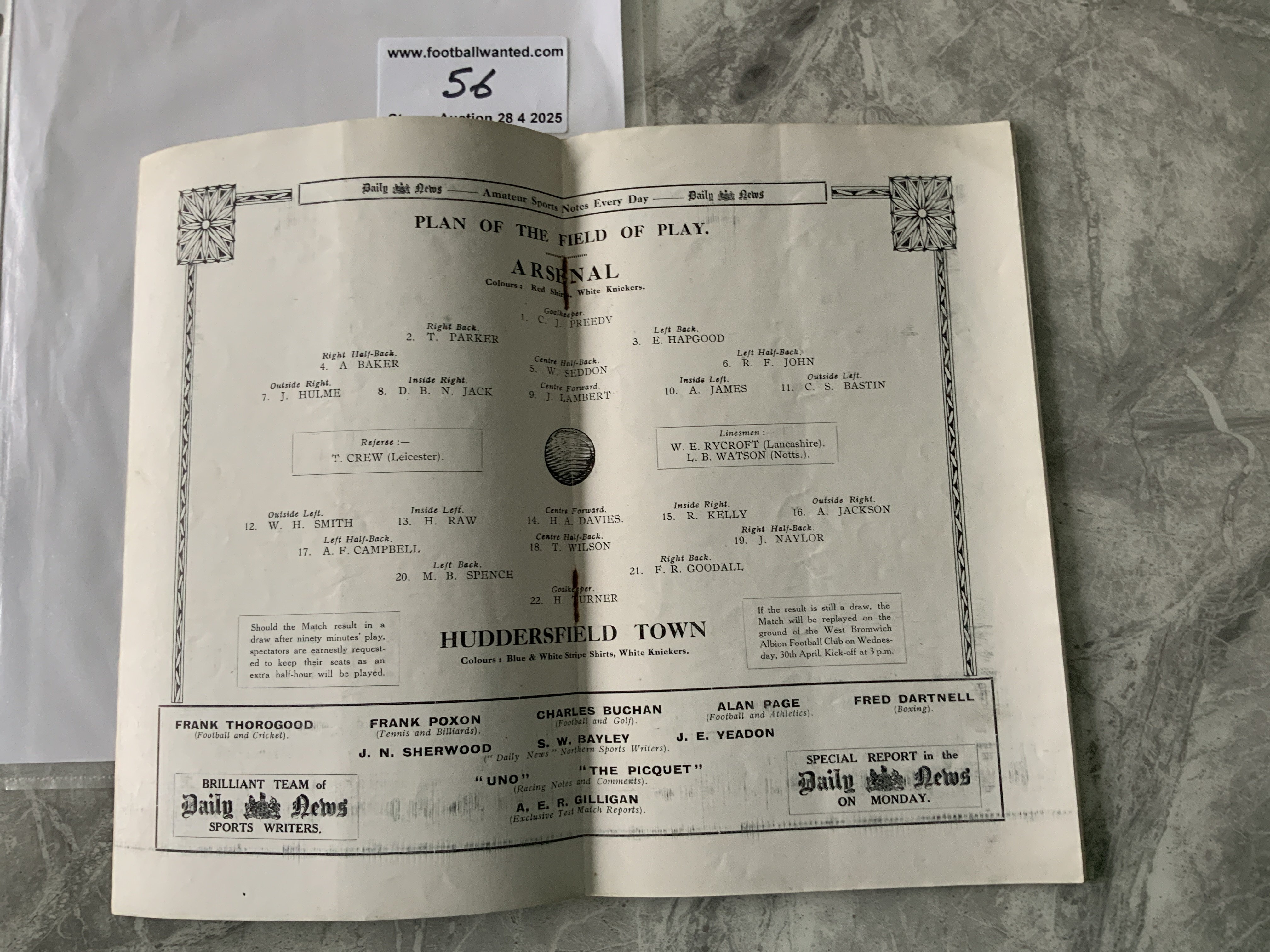 1930 FA Cup Final Football Programme: Arsenal v Huddersfield in very good condition with no team changes. Small fold in corner and very good considering no restoration has been carried out.