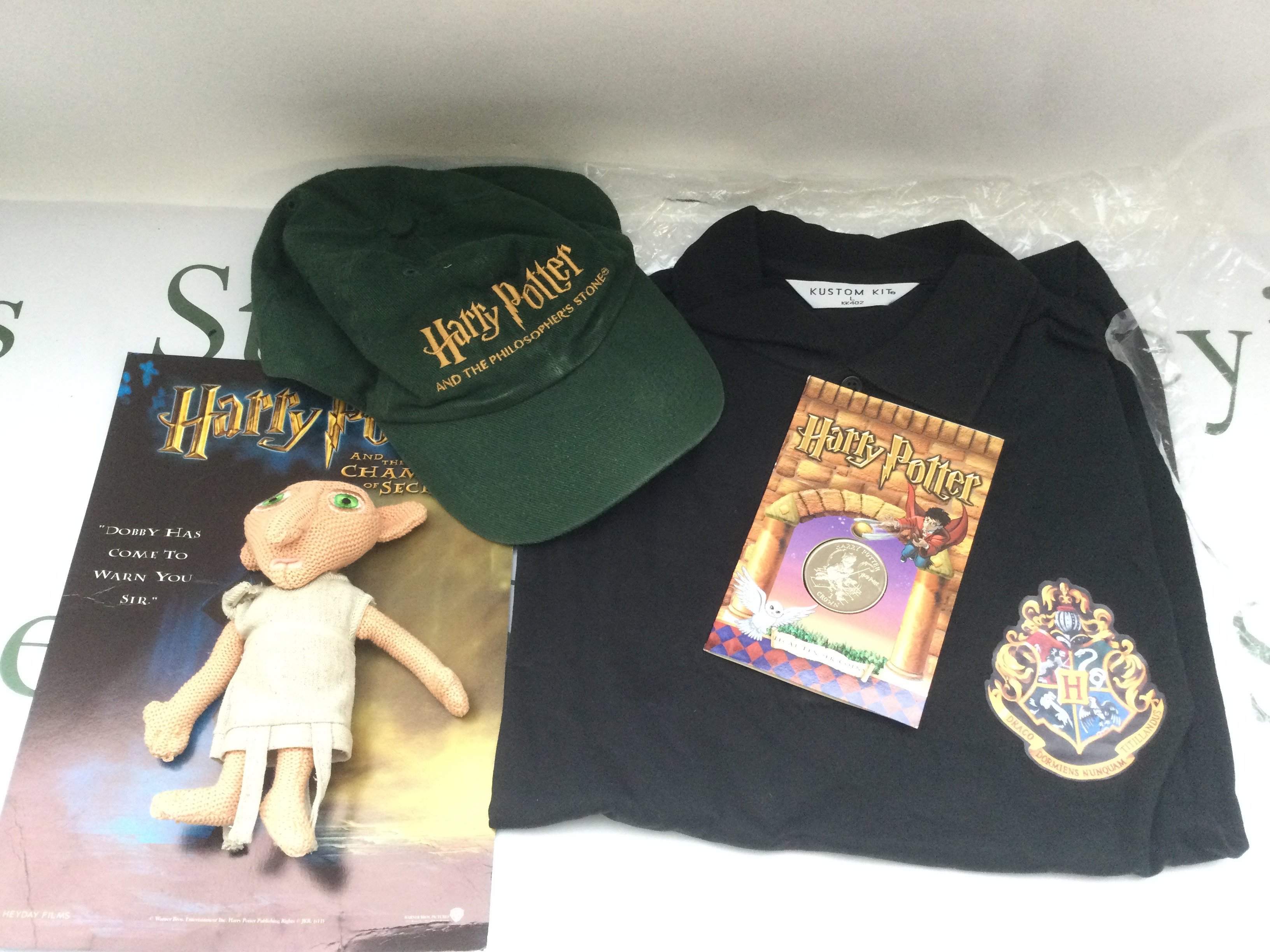 A collection of Harry Potter related items comprising a carded Dobby figure which was only available at the premiere party, coin, cap and polo shirt.