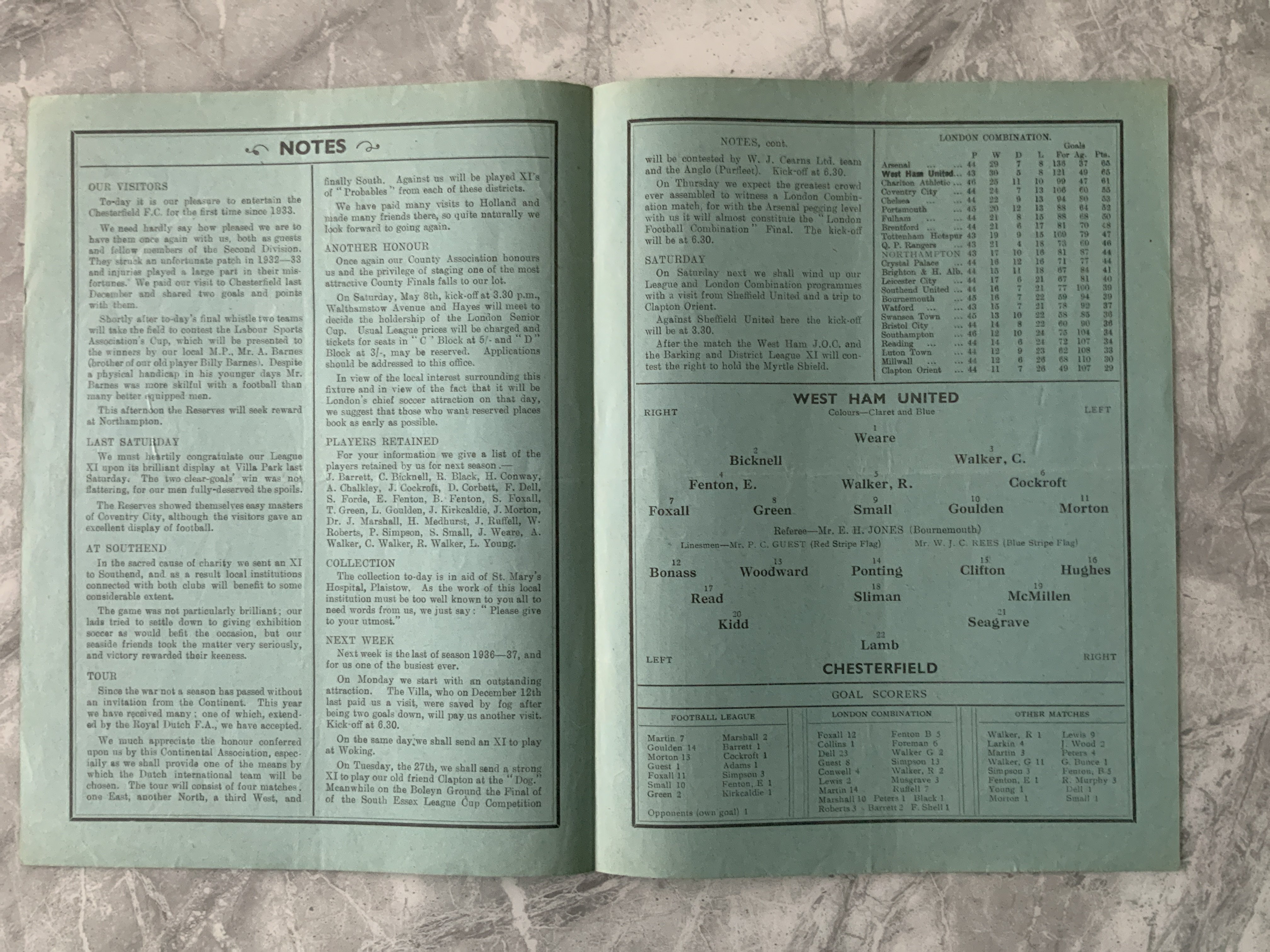 36/37 West Ham v Chesterfield Football Programme: Division Two match in very good condition with no team changes.