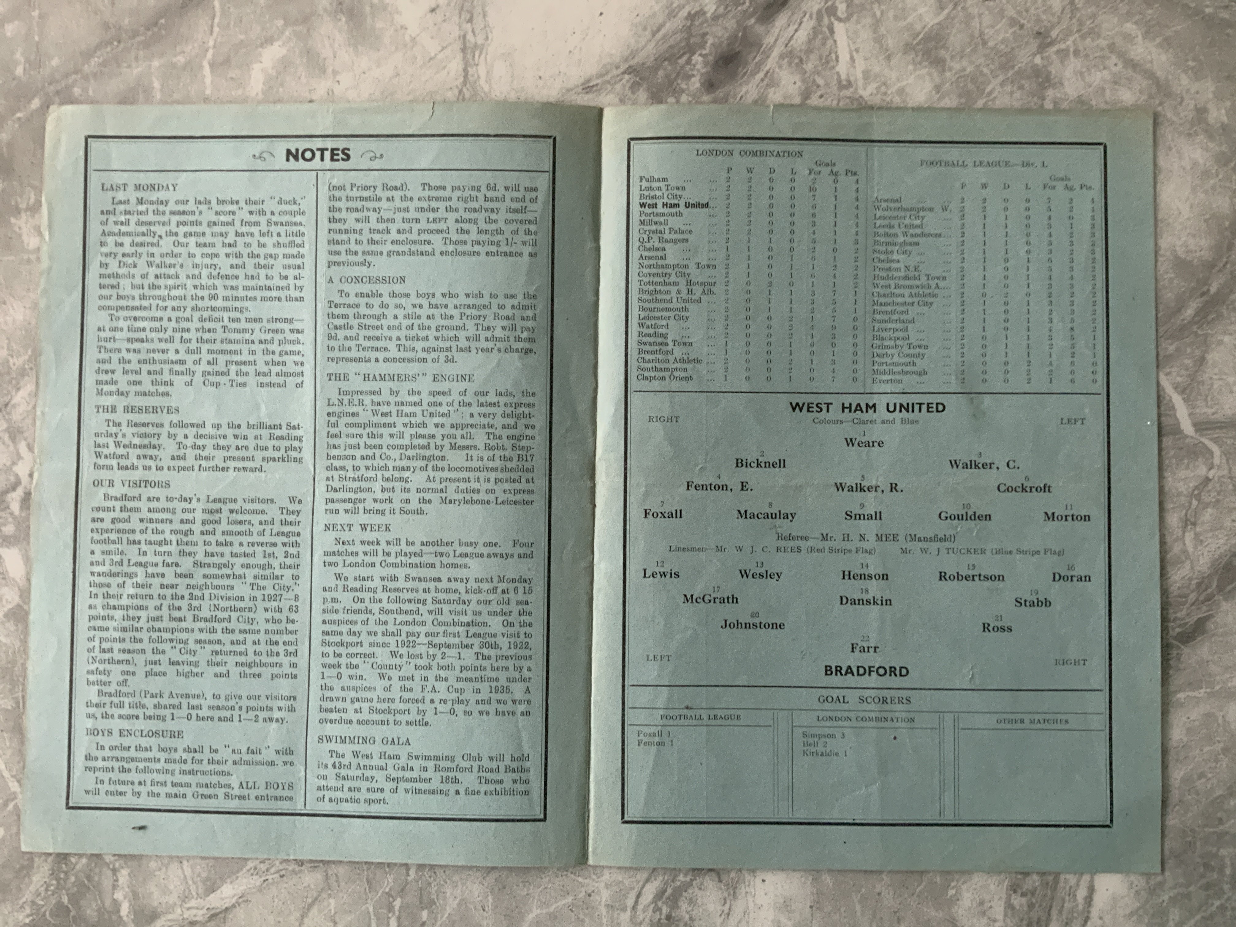 37/38 West Ham v Bradford Park Avenue Football Programme: Division Two match in very good condition with no team changes.