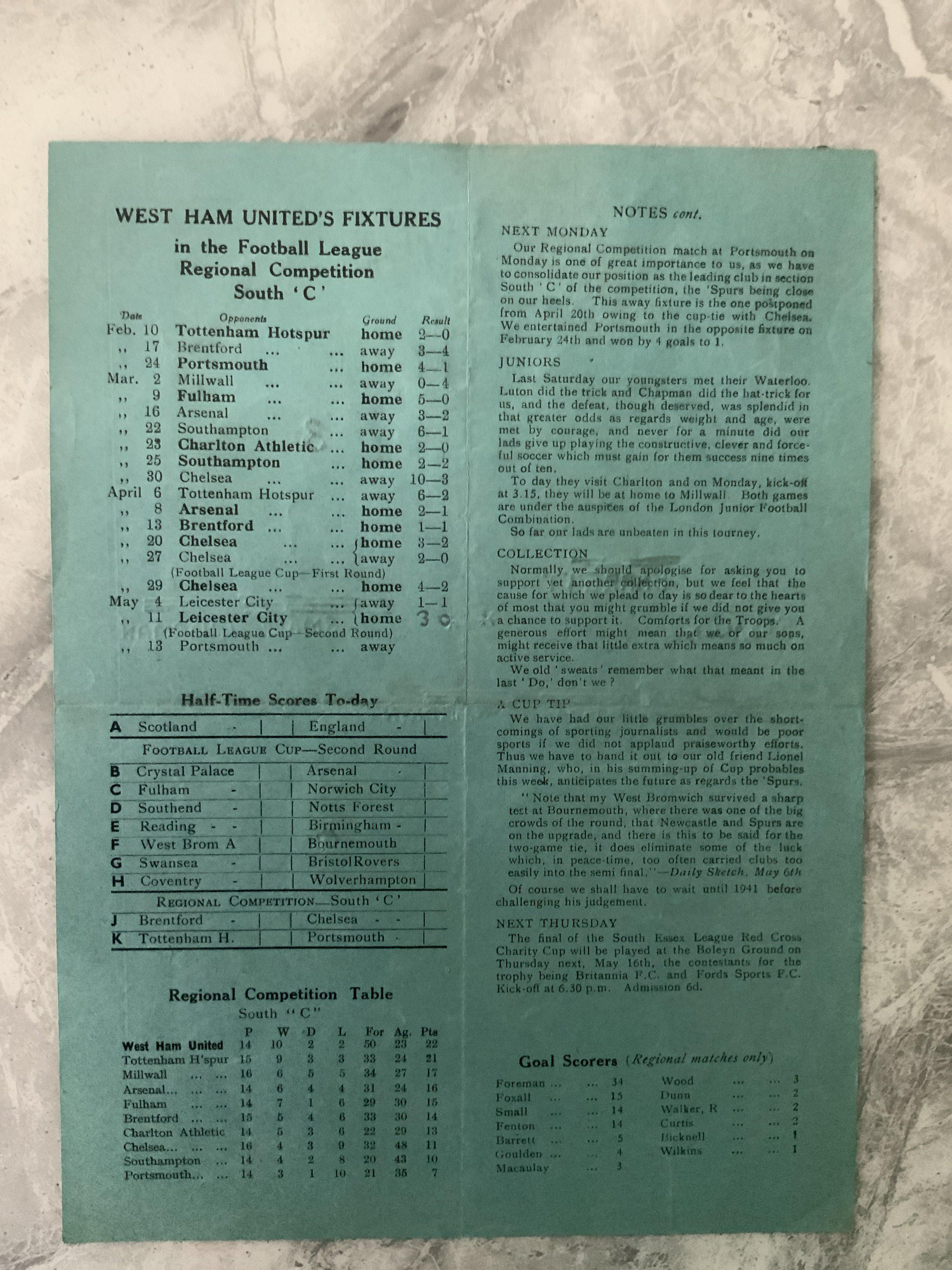 39/40 West Ham v Leicester City Football Programme: Football League Cup match in very good condition with pencilled team changes and score. Single sheet dated 11 5 1940.