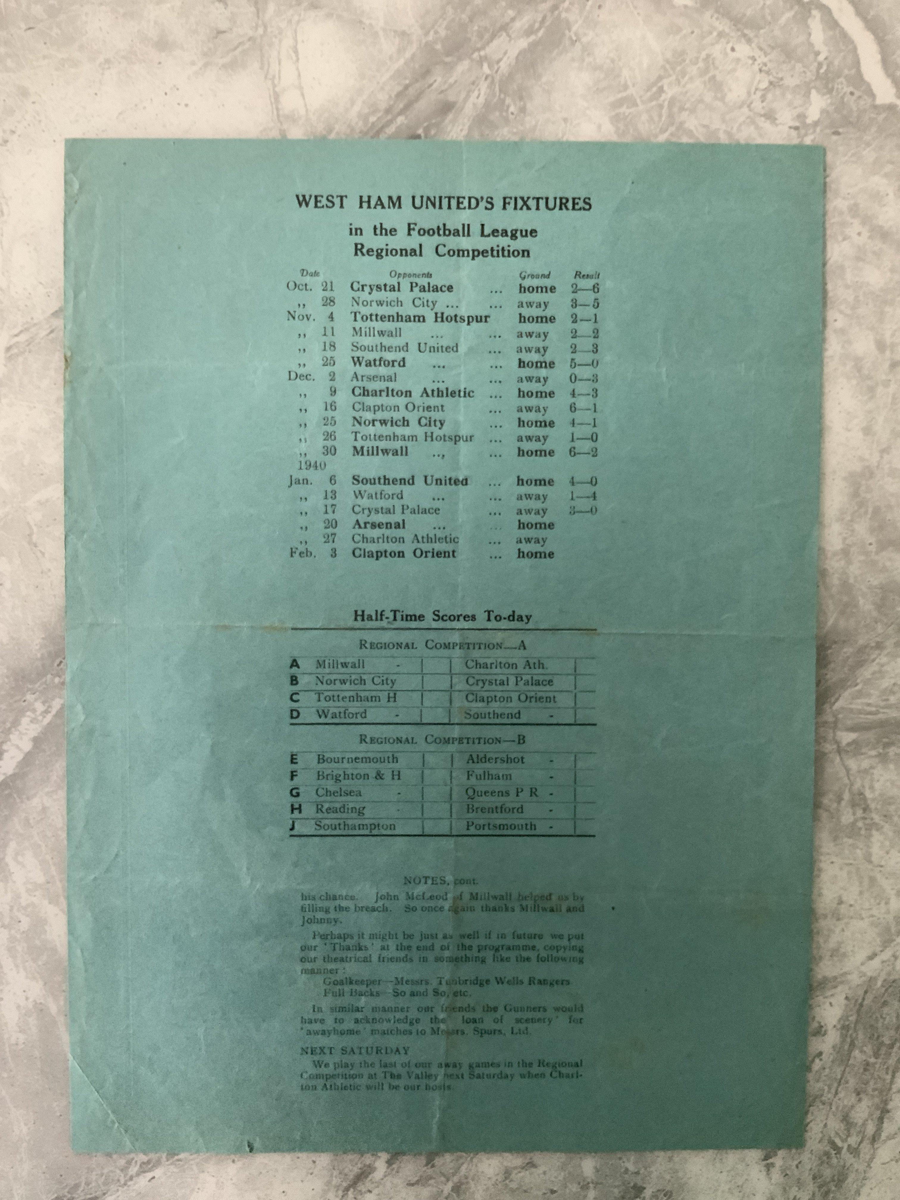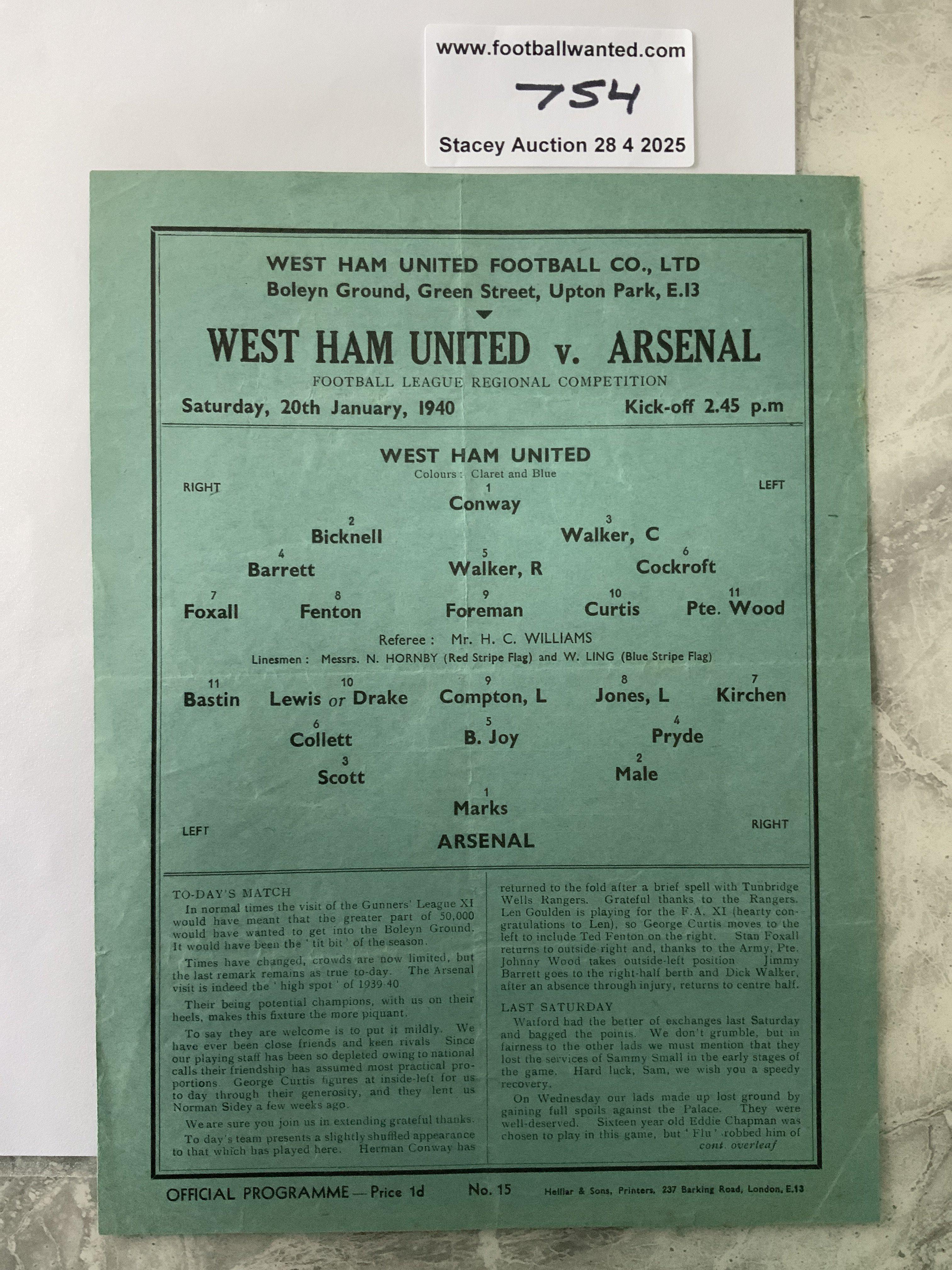 39/40 West Ham v Arsenal Football Programme: Football League match in very good condition with no team changes. Single sheet dated 20 1 1940.