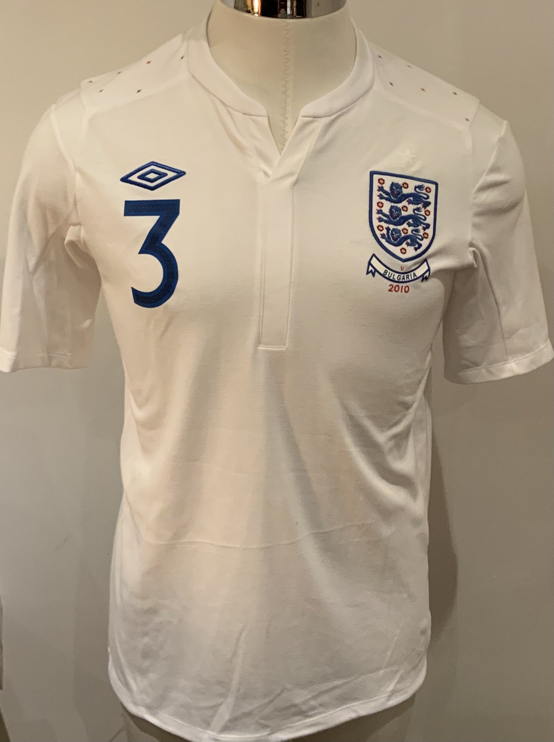 England 2010 Match Worn Football Shirt: White short sleeve shirt with A Cole 3 to rear. Worn in the match v Bulgaria on 3 September 2010.