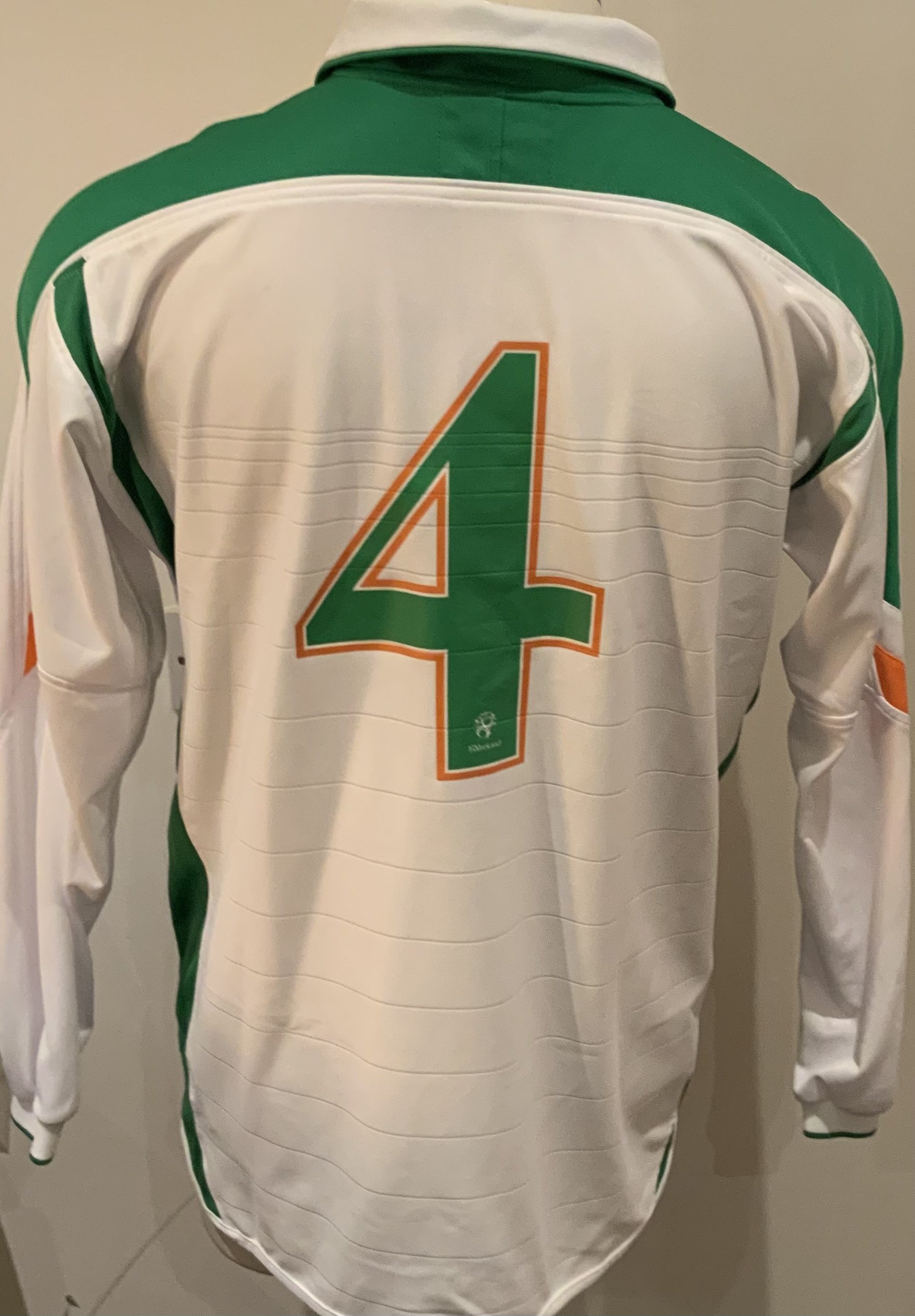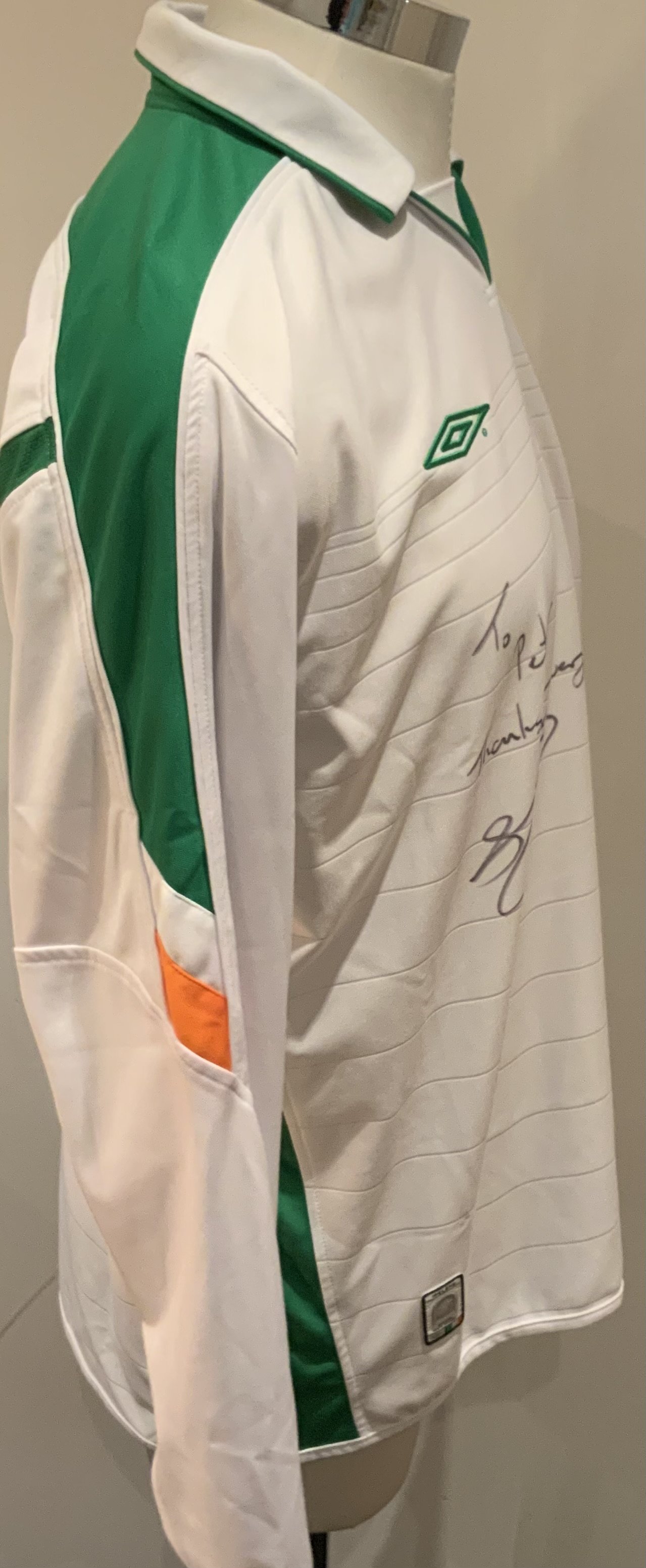 Republic of Ireland Football Shirt: White long sleeve shirt. Number 4 and signed to front with dedication by Stephen Kelly. Not believed to be match worn but given by Kelly to our source.