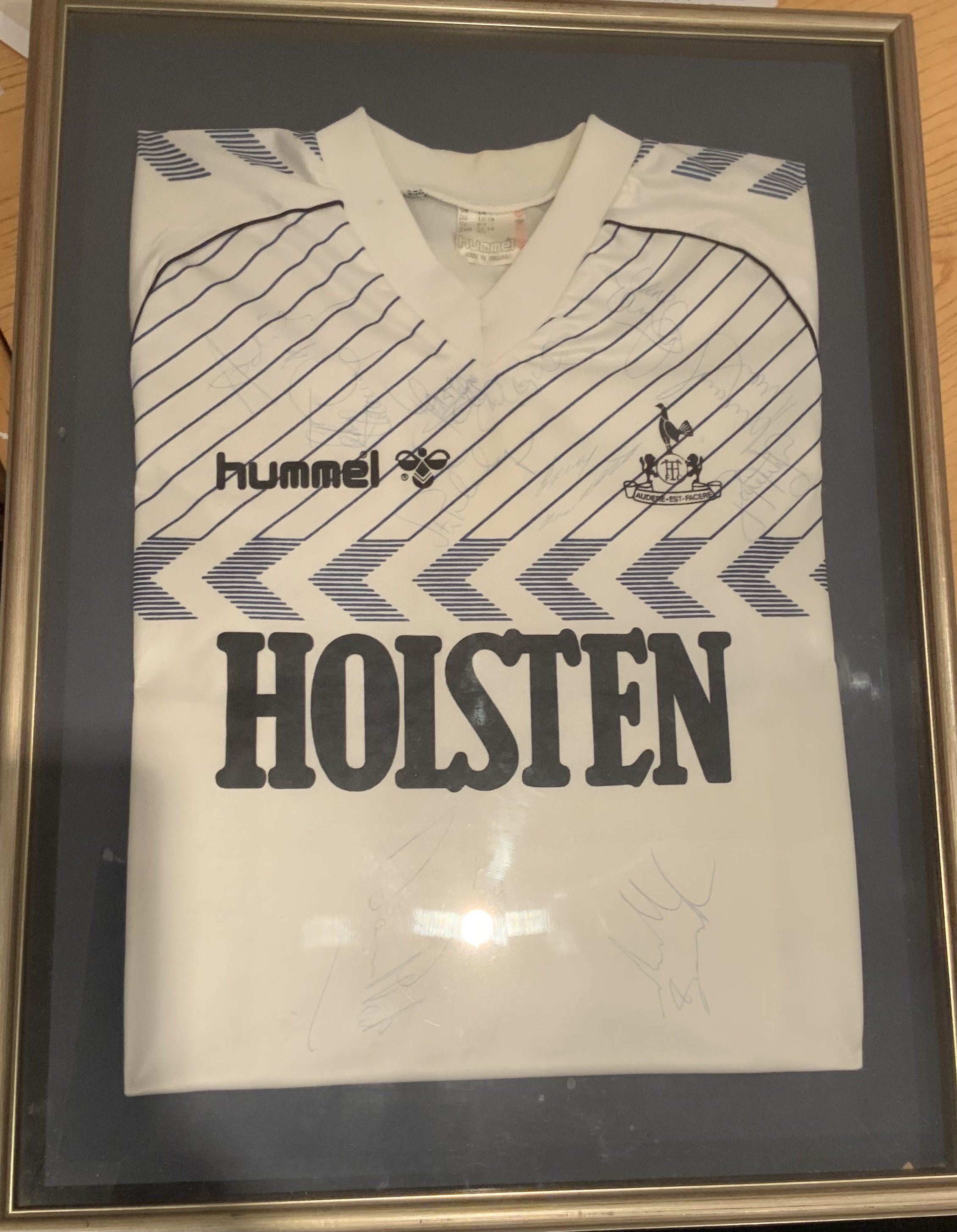 Tottenham 1986 - 1987 Framed Signed Football Shirt: Squad signed to original large Hummel Holsten shirt including Ardiles, Mabbutt and David Pleat. Frame measures approximately 24 inches by 19 inches. Not for posting.