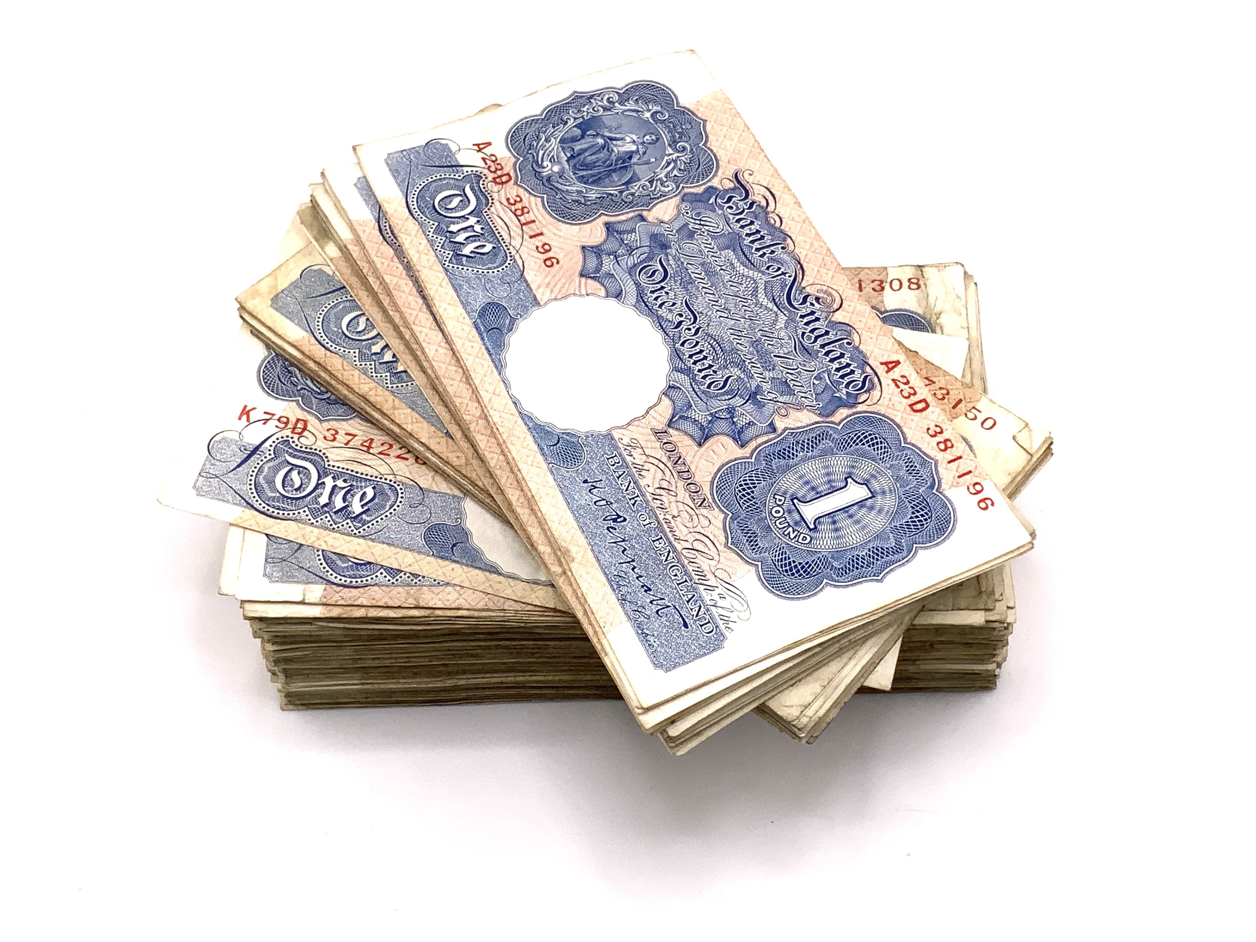 156 Bank of England One Pound 1 Chief Cashier K O Peppiatt Banknotes, 1940-1948. Varied condition and serial numbers. Note: in todays money 156 from the Mid 40s equates to approximately 5500.