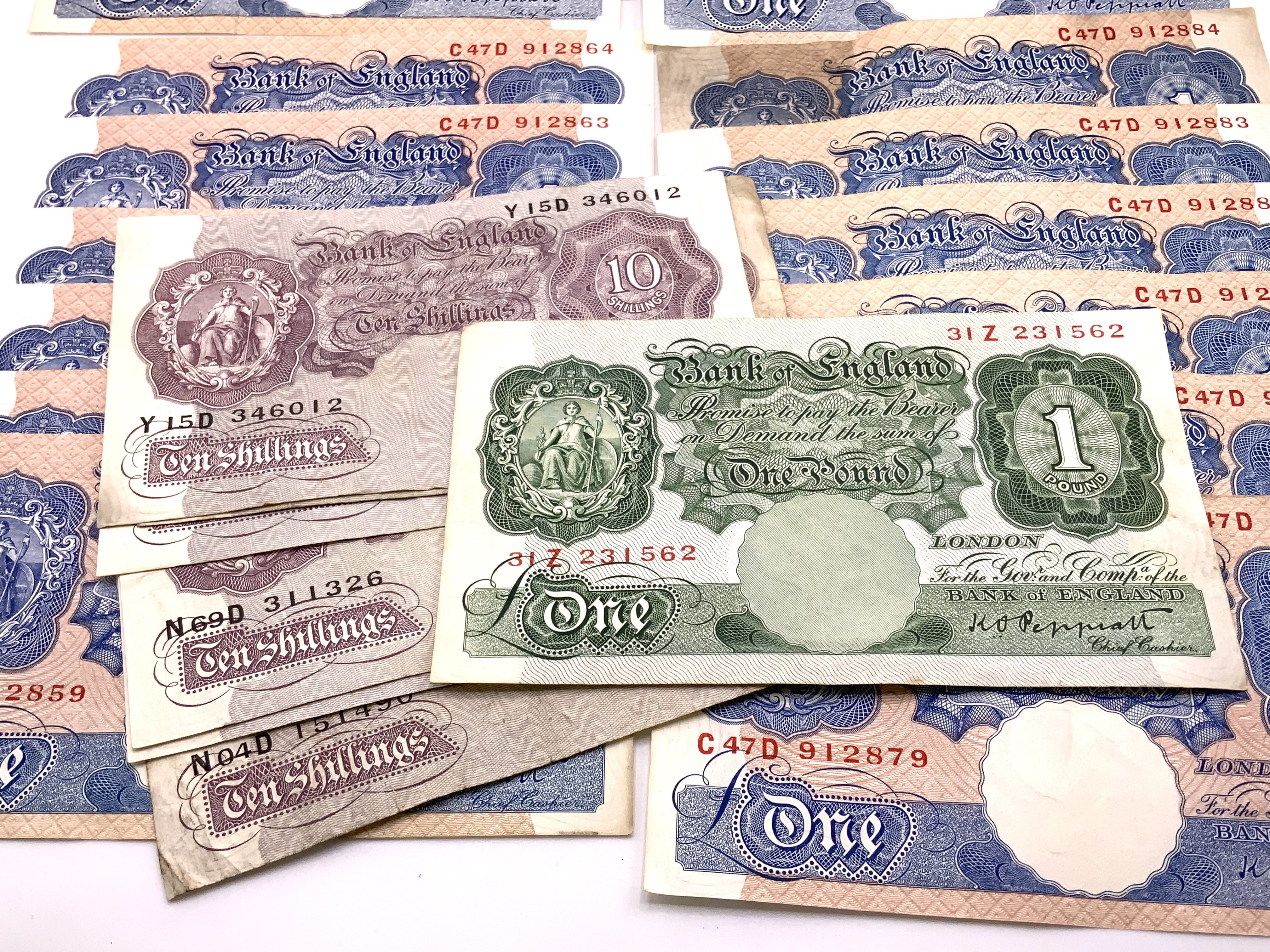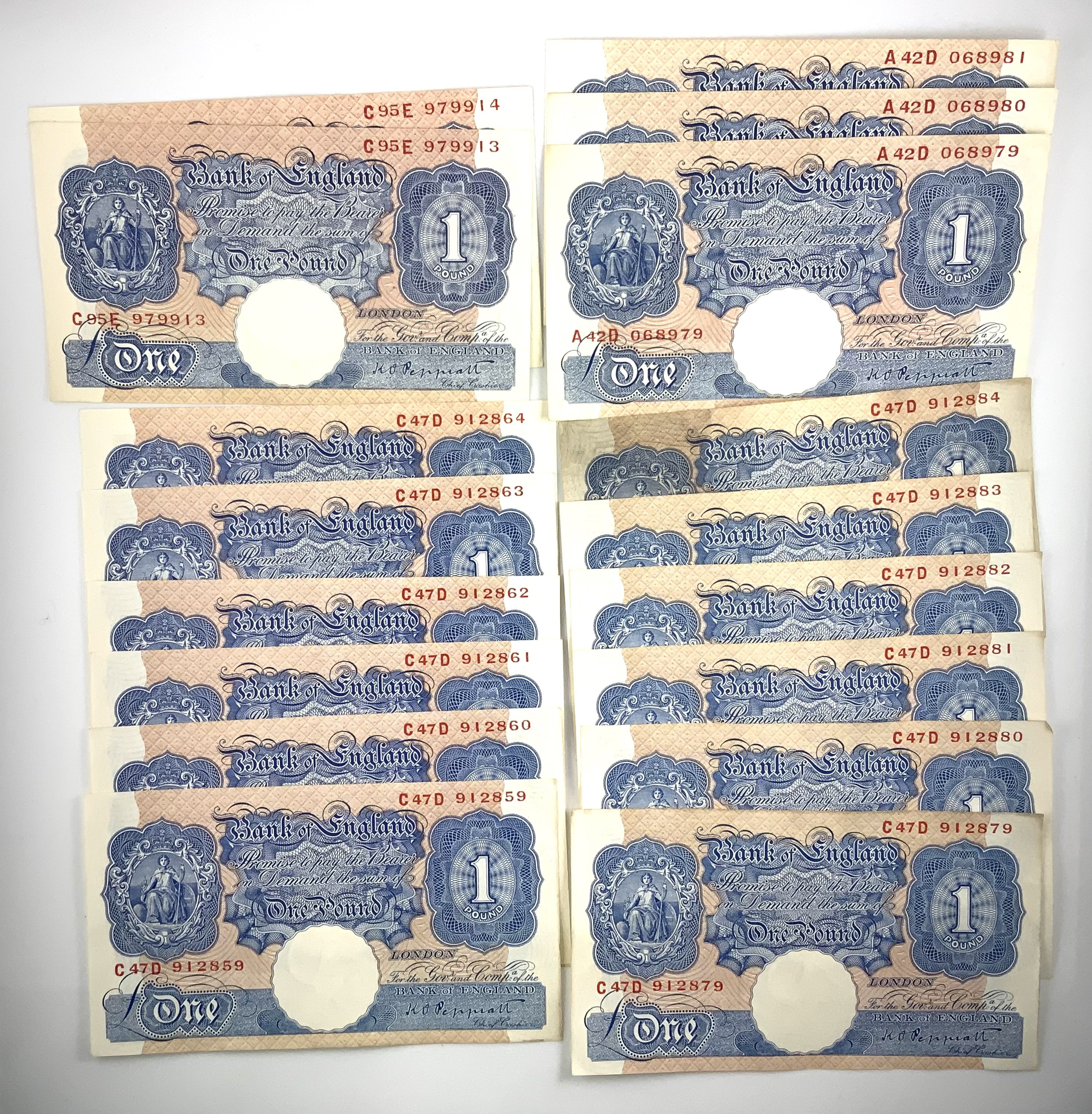18 Bank of England One Pound 1 Chief Cashier K O Peppiatt Banknotes, 1940-48, mostly UNC. Consecutive runs include. C47D912879-884, C47D912859-864, A42D068979-981, C95E979913-4. Together with Peppiatt 1 note, 6 Peppiatt Ten Shillingsnotes}