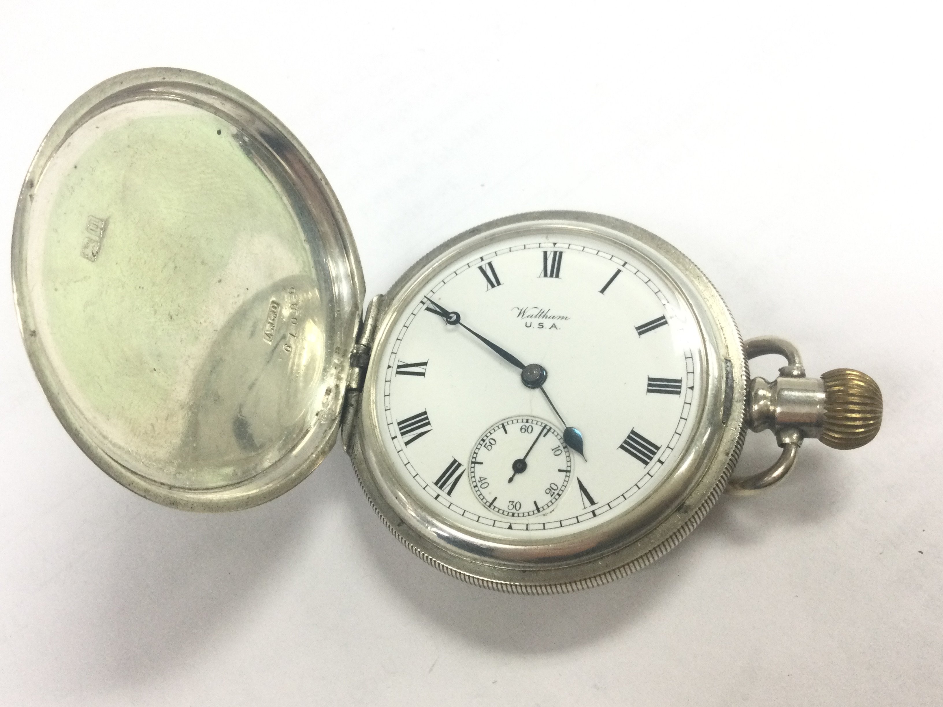 A Waltham silver full hunter pocket watch , seen working. Postage category A