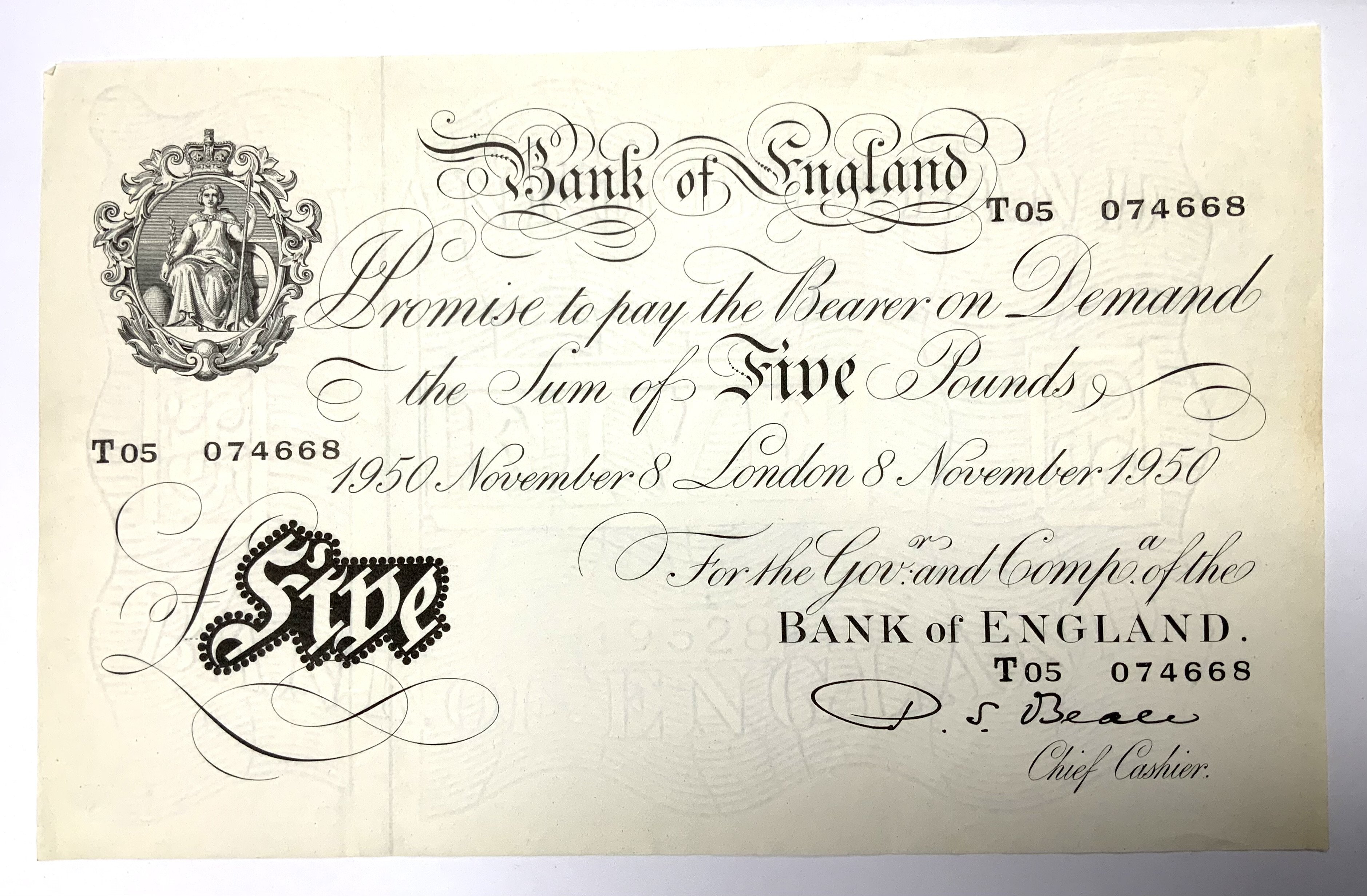 Bank of England (T05 074668) Beale, White 5 banknote, 8th November 1950, corner folding, UNC