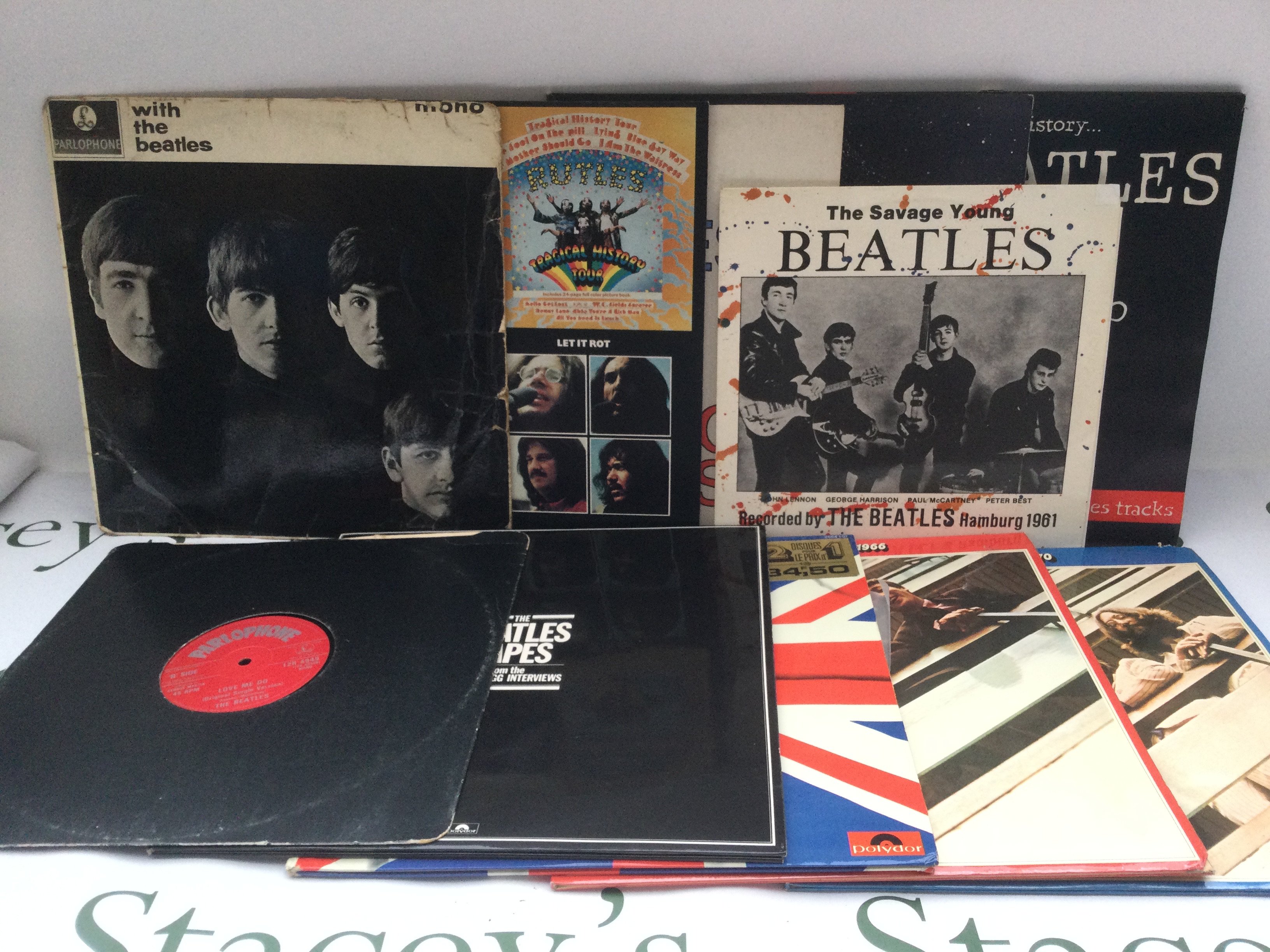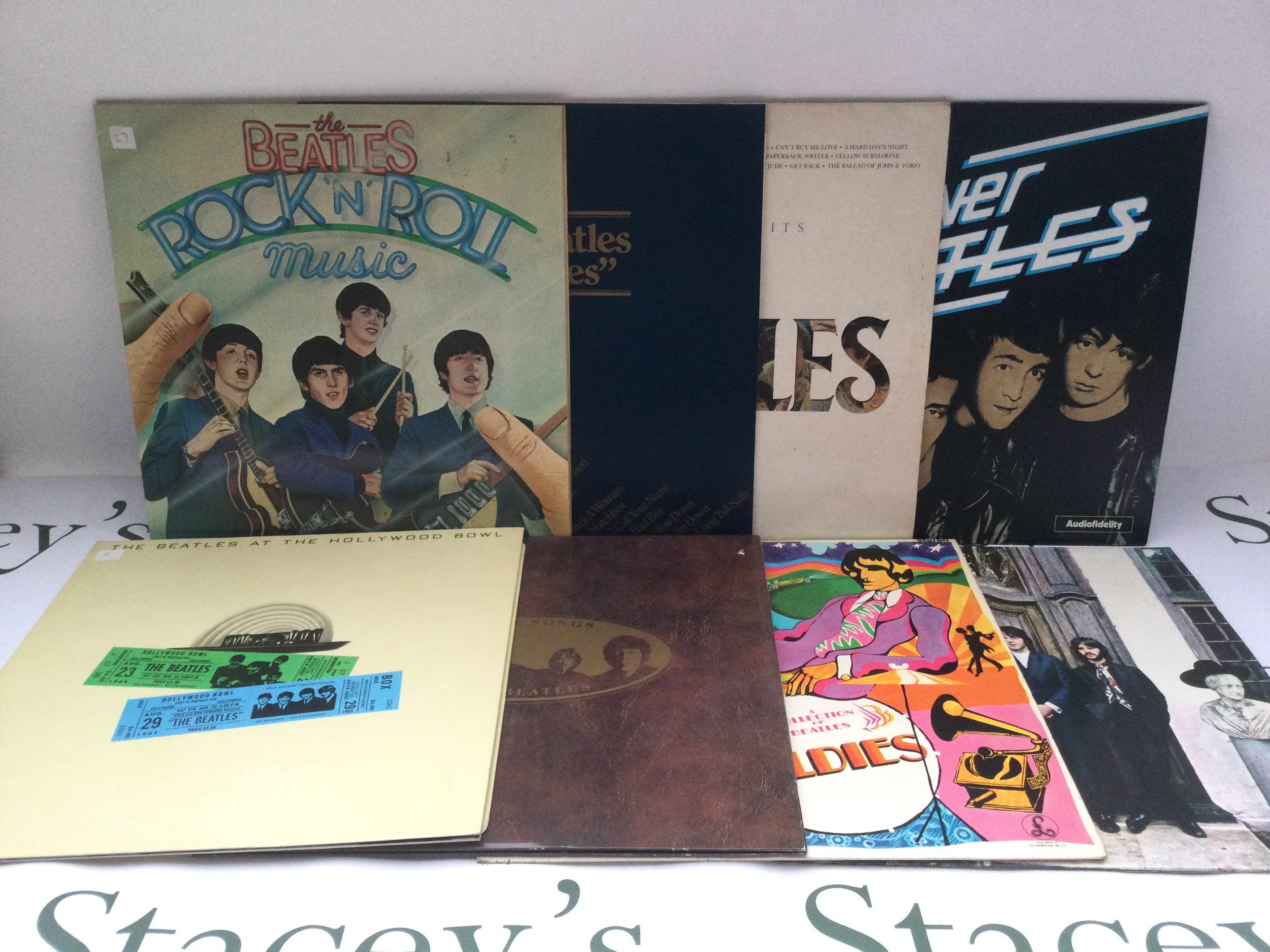 A record case of Beatles and LPs comprising mainly compilations including 'Rock n Roll Music', 'Hey Jude', 'At The Hollywood Bowl' and others.