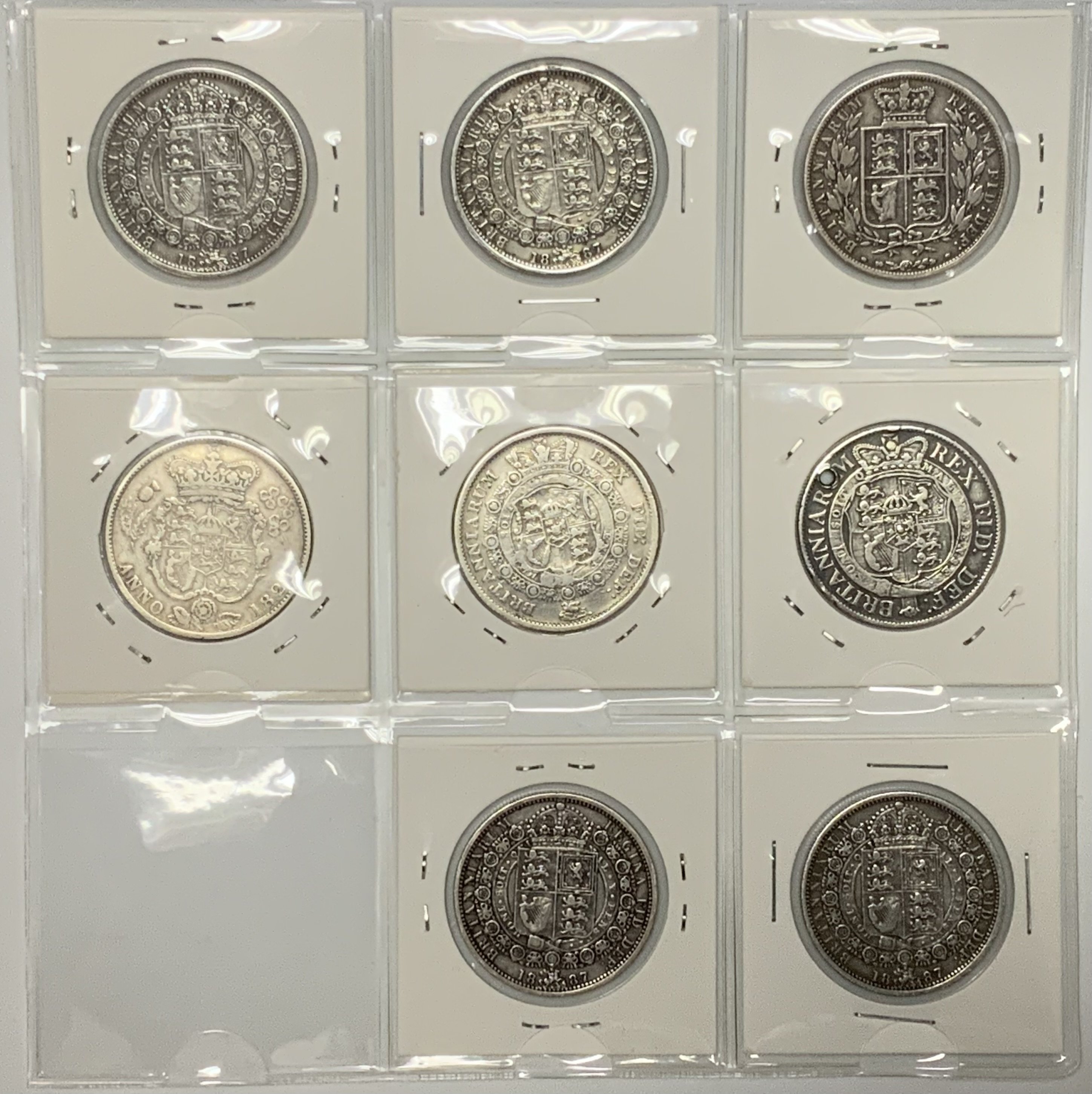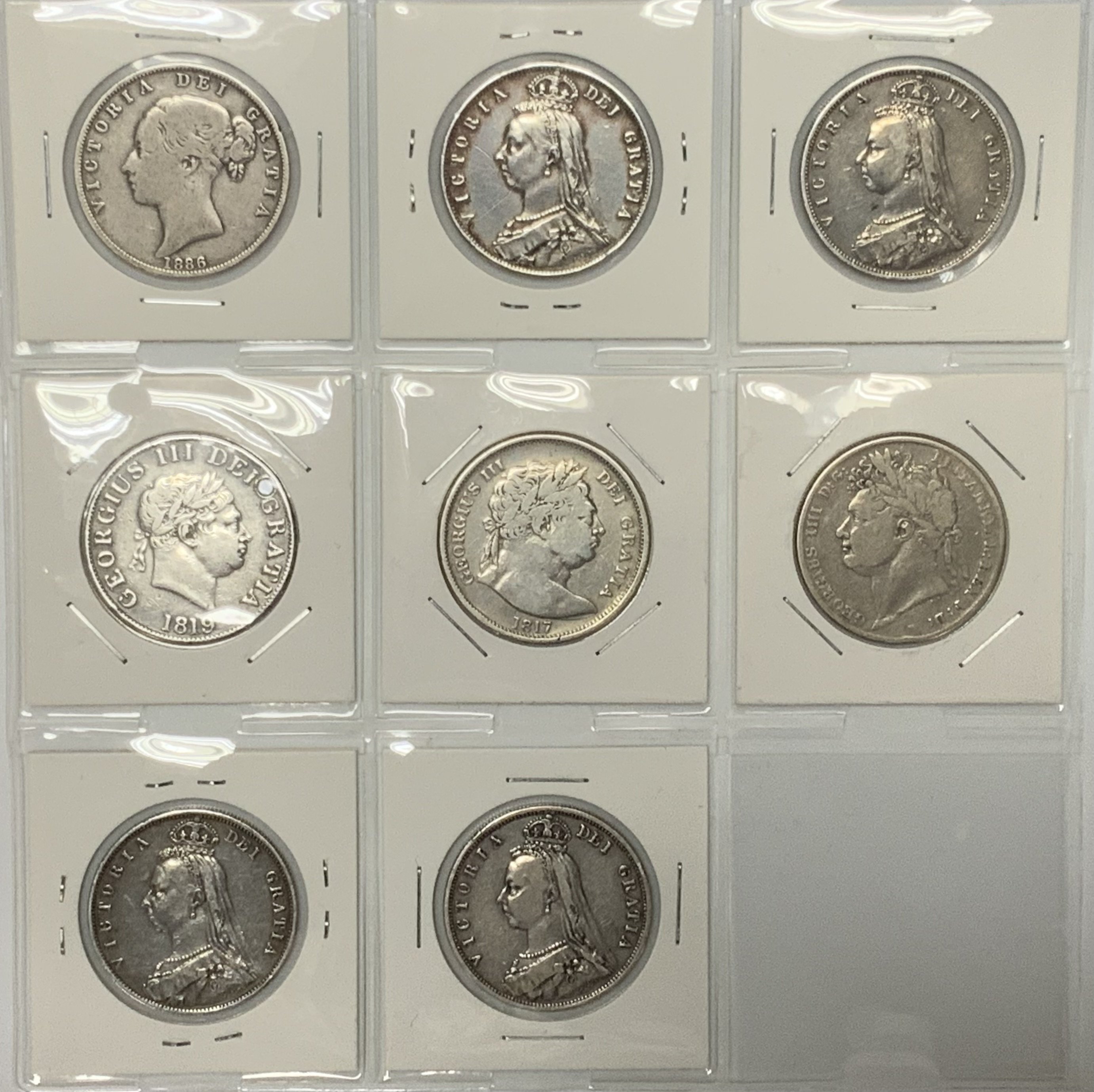 8 British Silver Half Crowns. George III Bullhead 1817, 1818 George IV 1821, Victoria 1886, 1887 (4)
