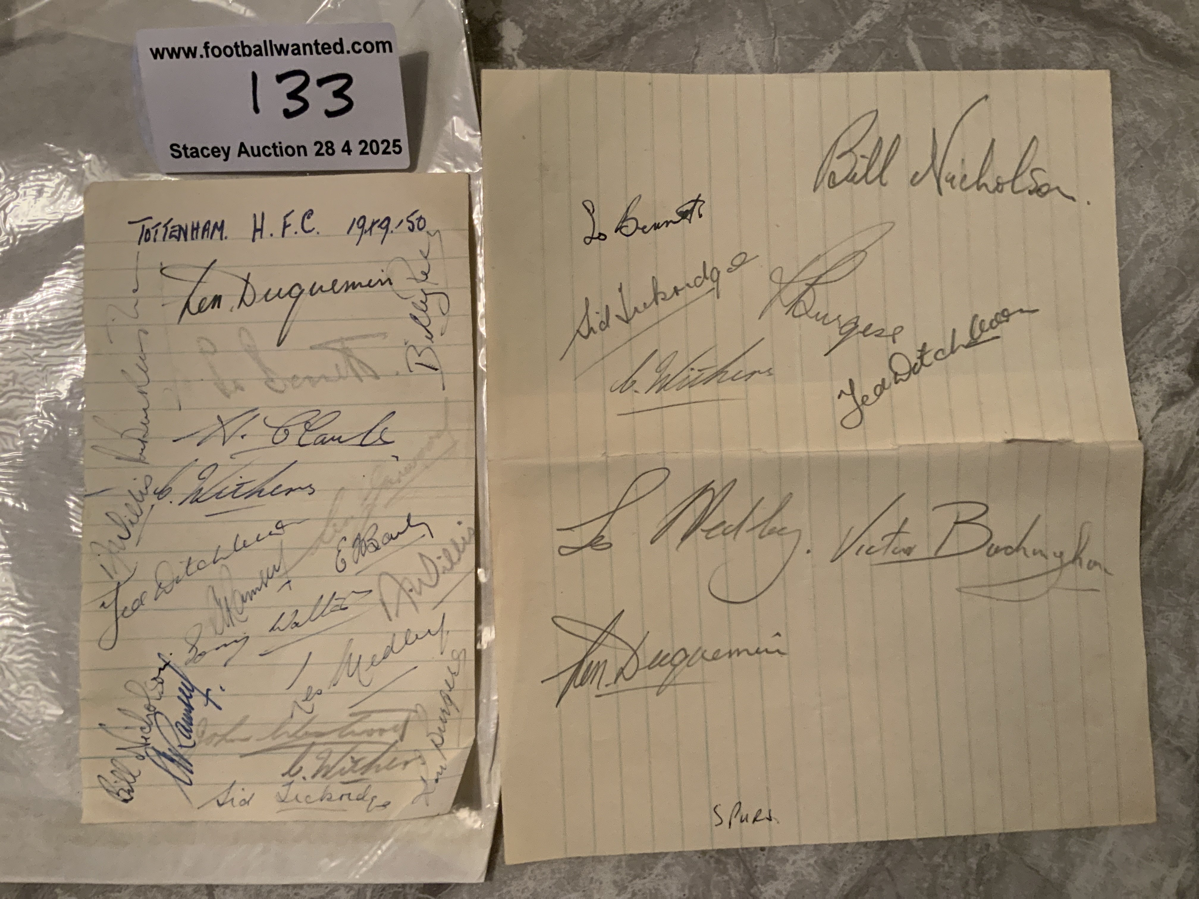 Tottenham Champions 49/50 Football Autographs: Second division champions page signed by 20 including Duqueman Clarke Ditchburn Ramsey Nicholson with a couple of duplicates. C/W page from 48/49 signed by 9 including Buckingham Ditchburn Nicholson Withers Medley and Tickridge