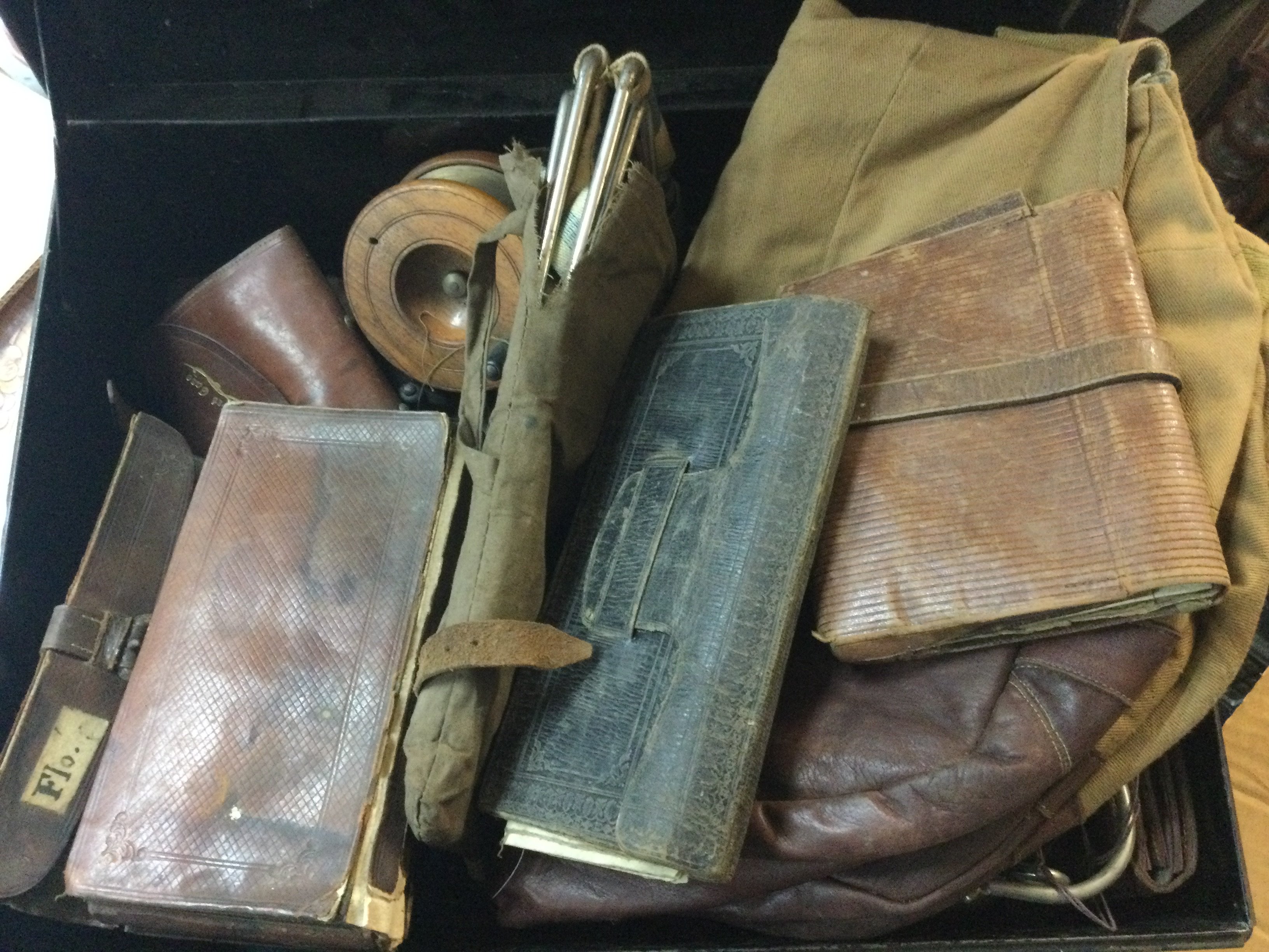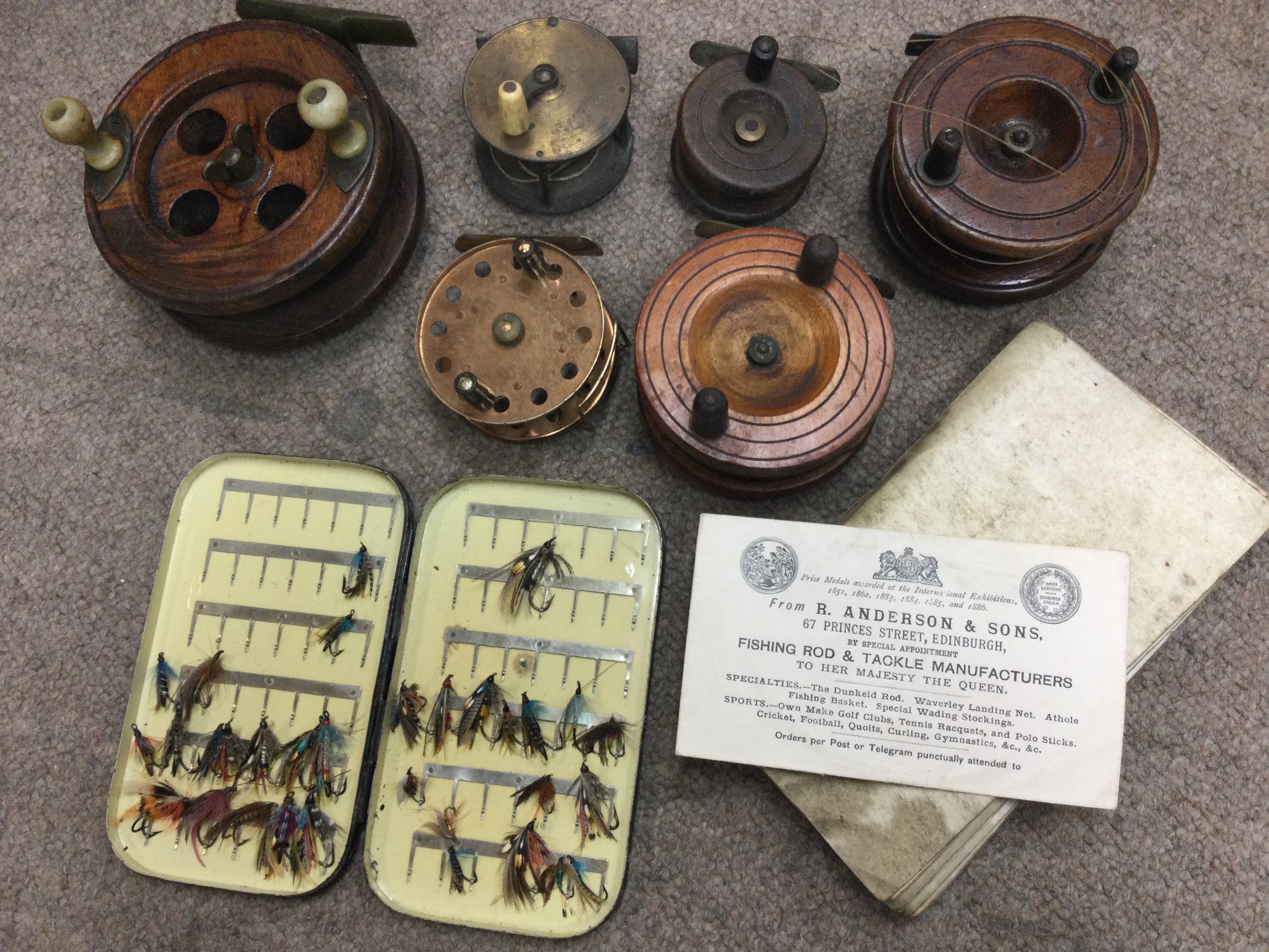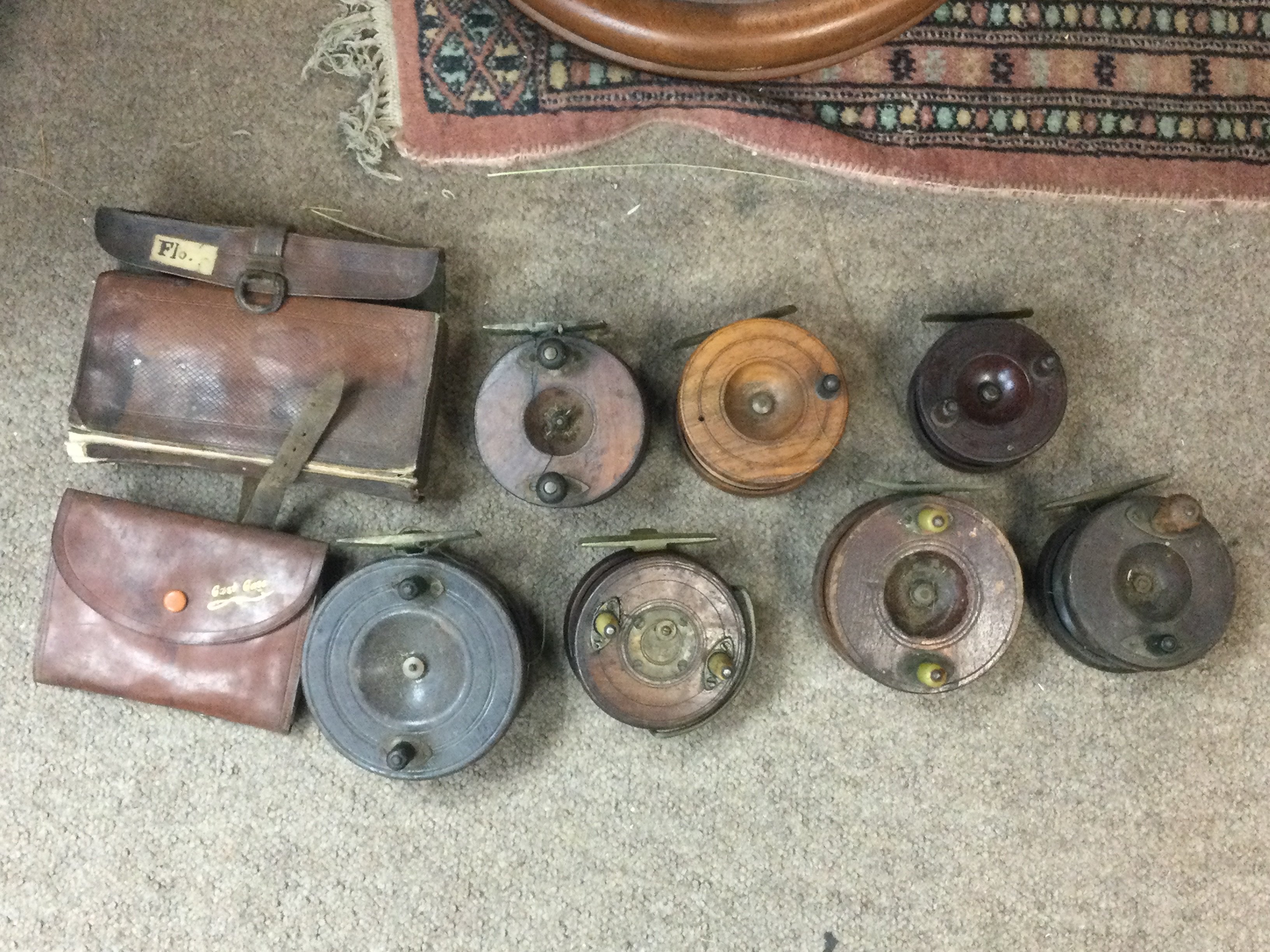 A collection of vintage fishing gear including early 20th century starback reels, cast wallets etc. Postage cat B