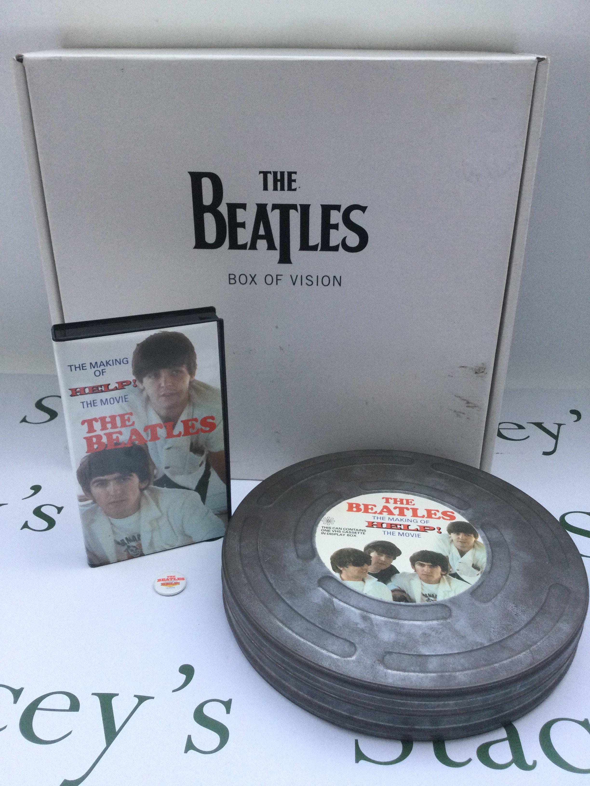 An unopened Beatles Box Of Vision CD storage box and The Making Of Help! VHS housed in a film reel can (2).