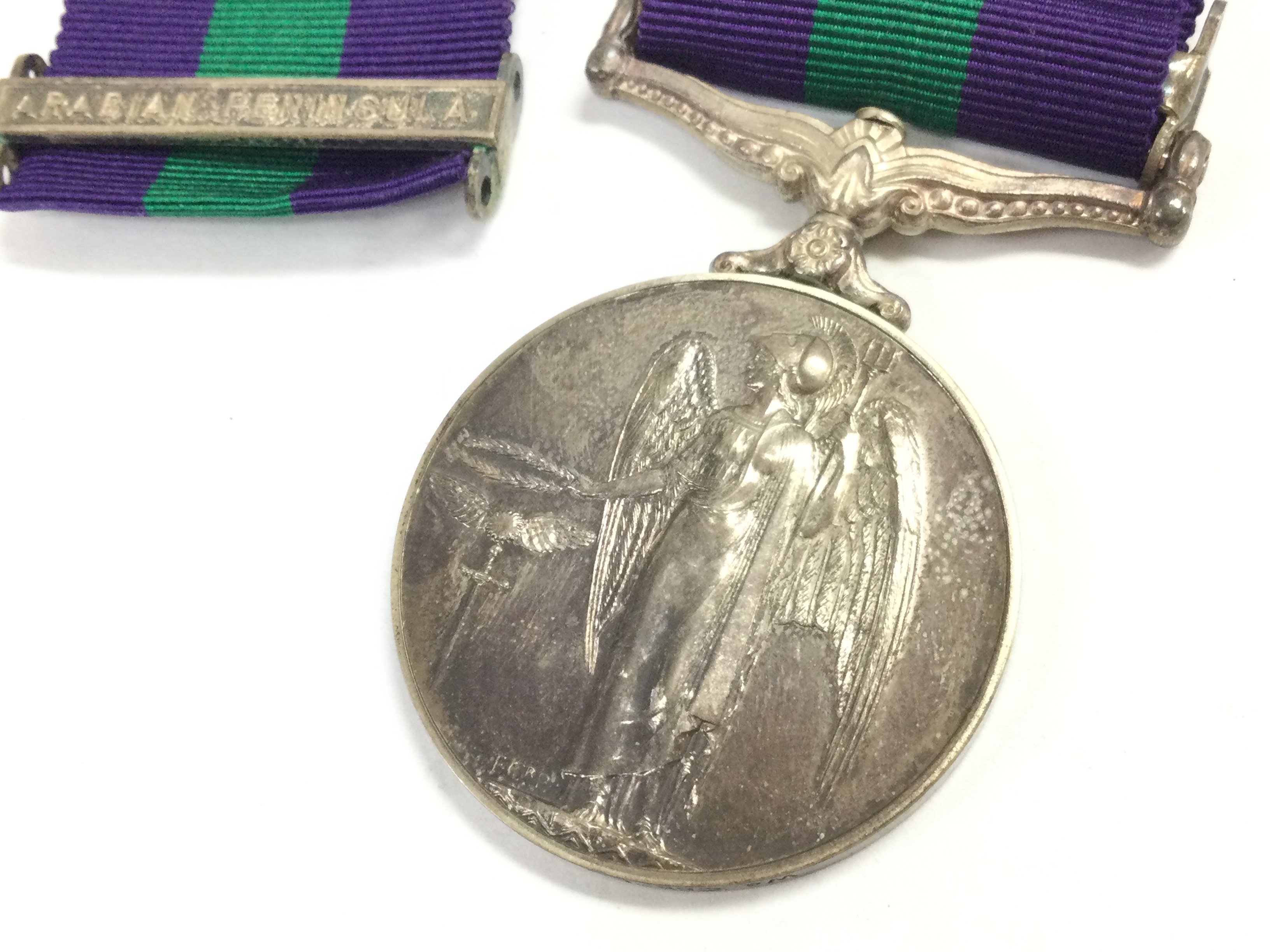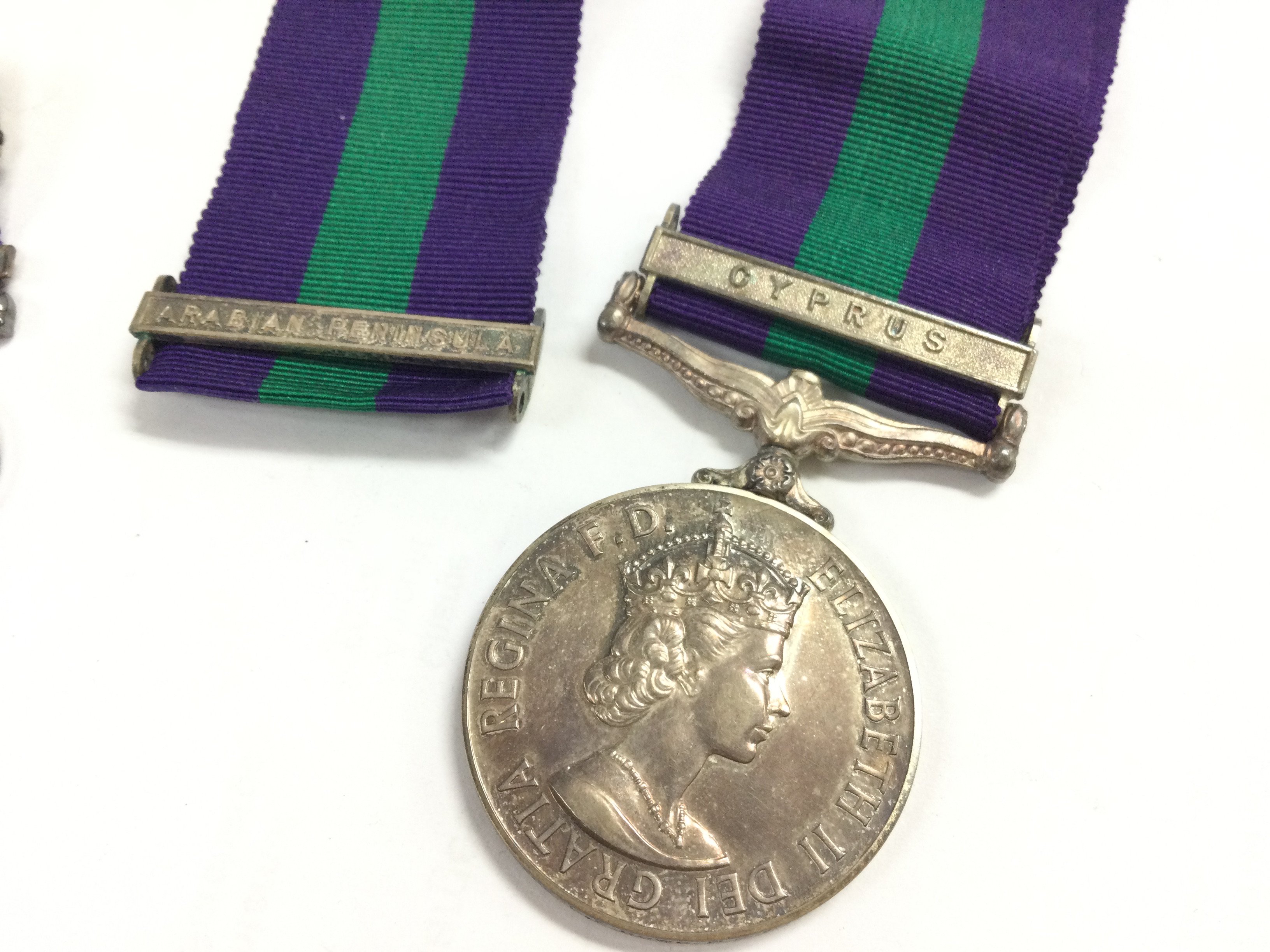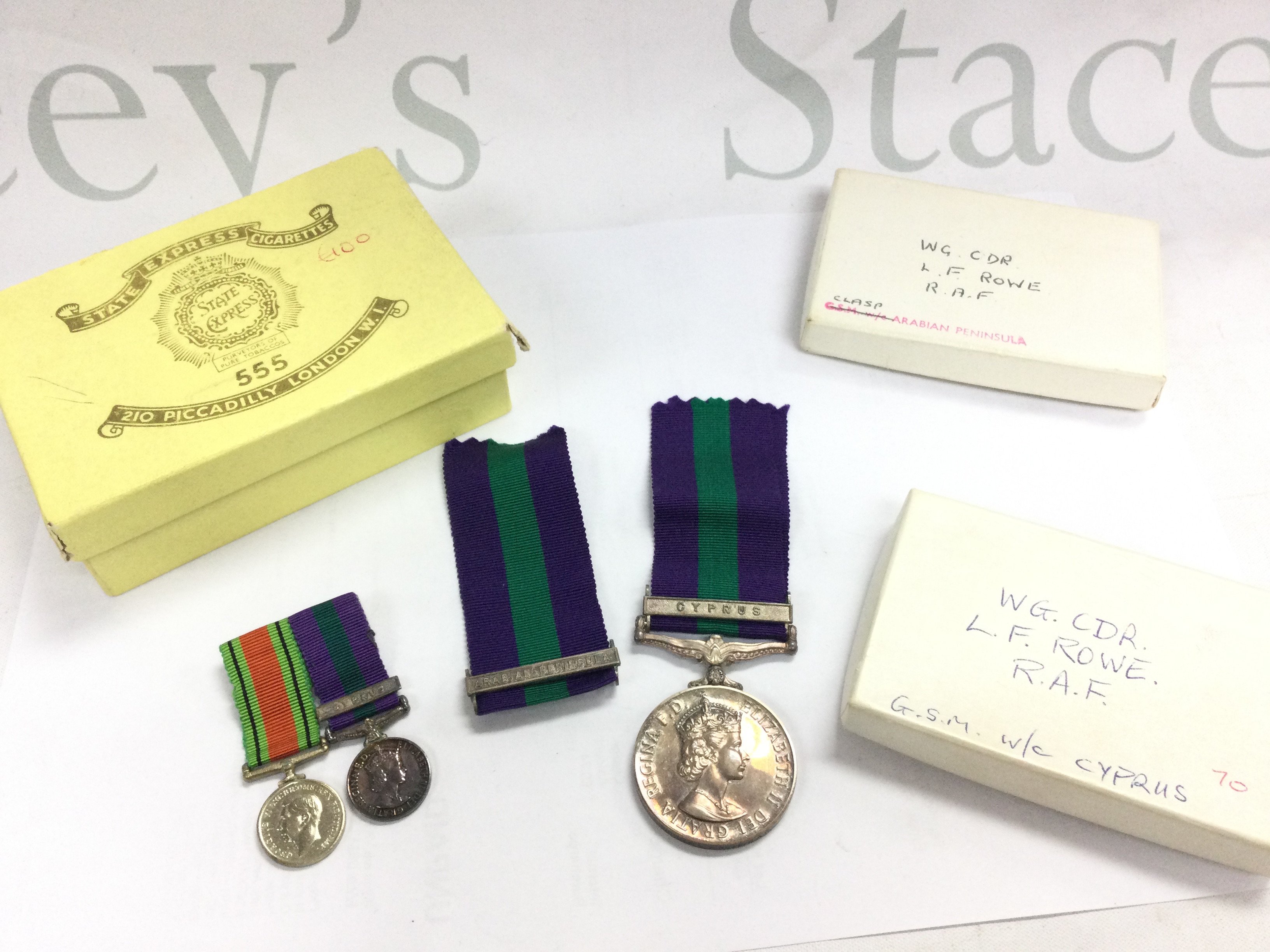 An Elizabeth II General Service Cyprus medal presented to Wg Cdr L.F.Rowe. R.A.F, Arabian Peninsula bar with strap and two miniatures. Postage category B