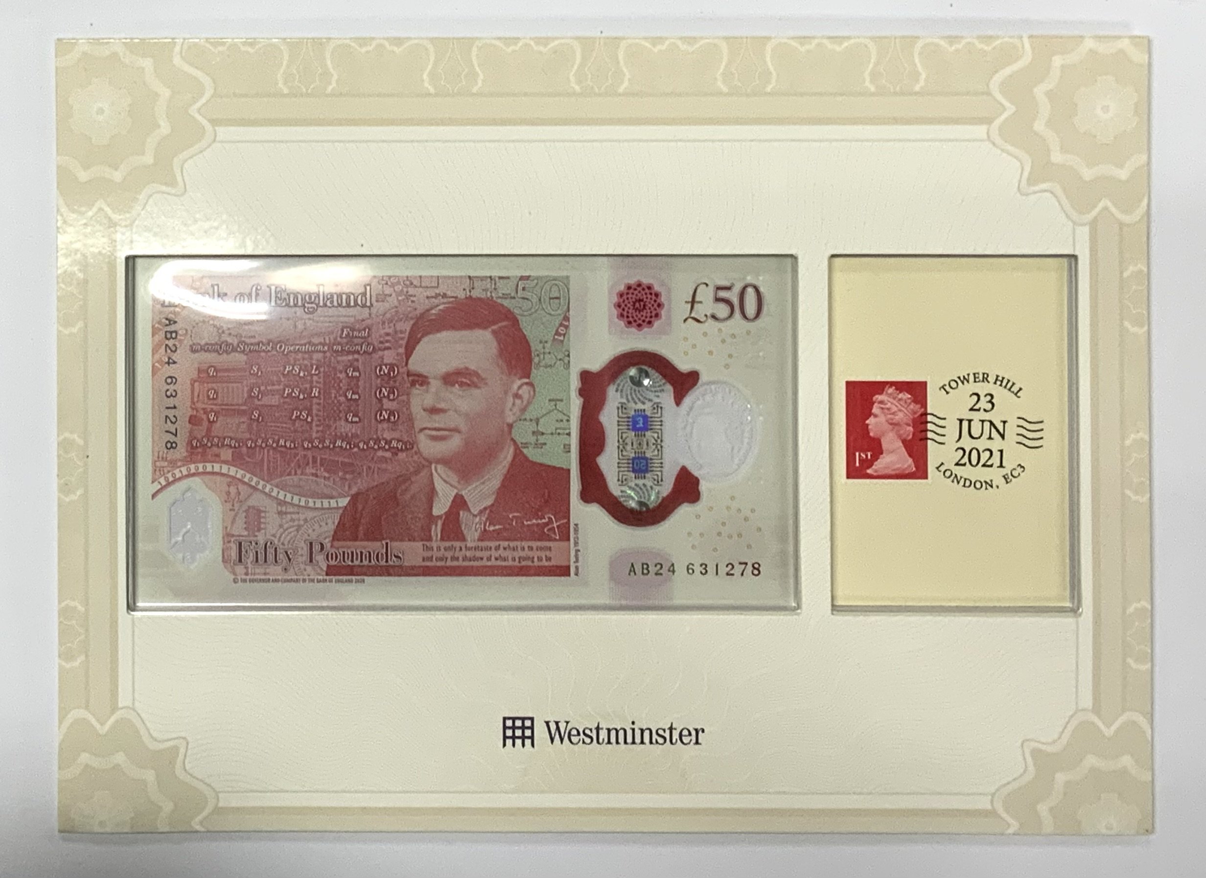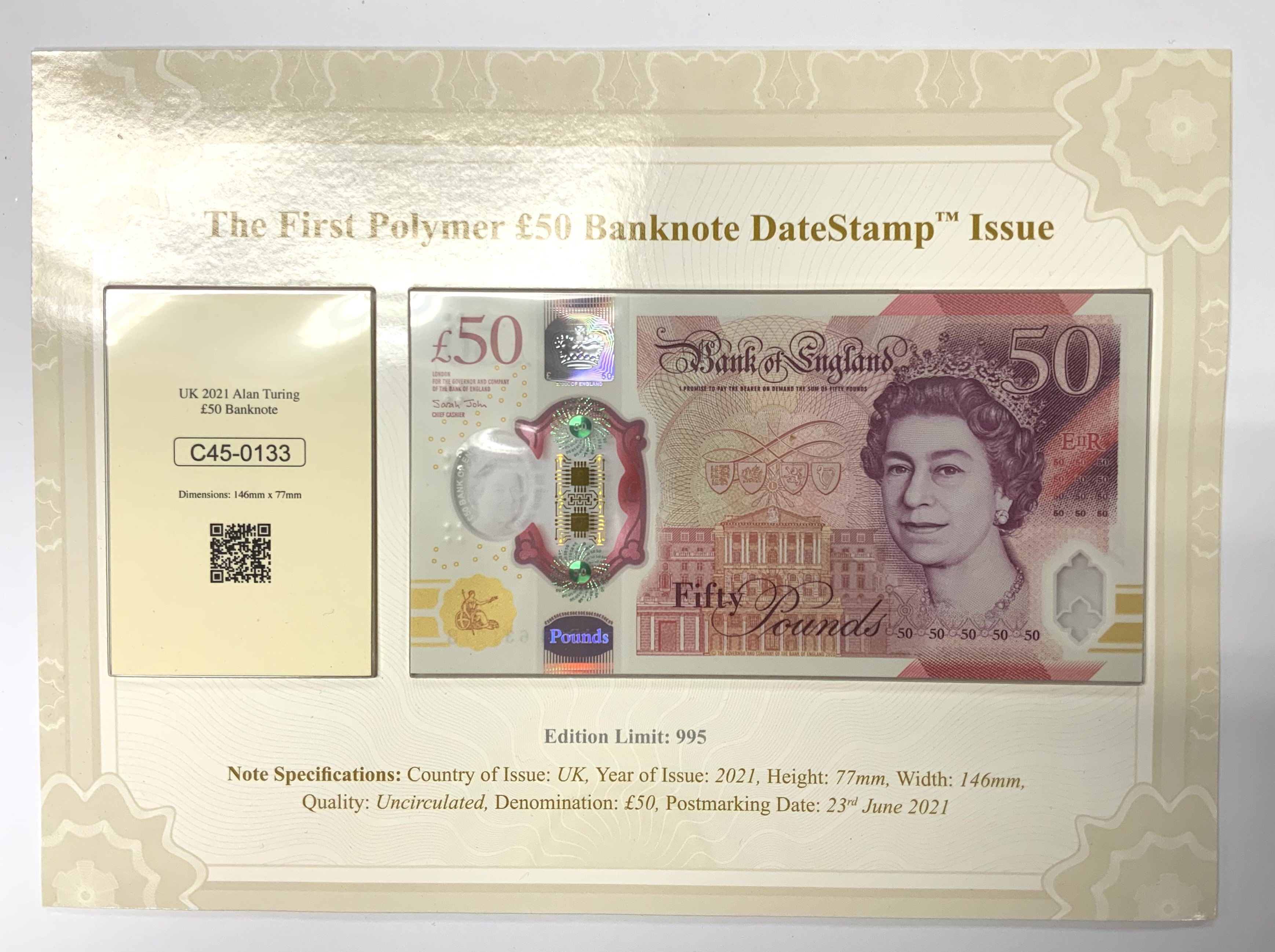 Date stamp sealed, First issue Alan Turing Polymer QE2 50 Banknote, uncirculated serial number AB24 631278.