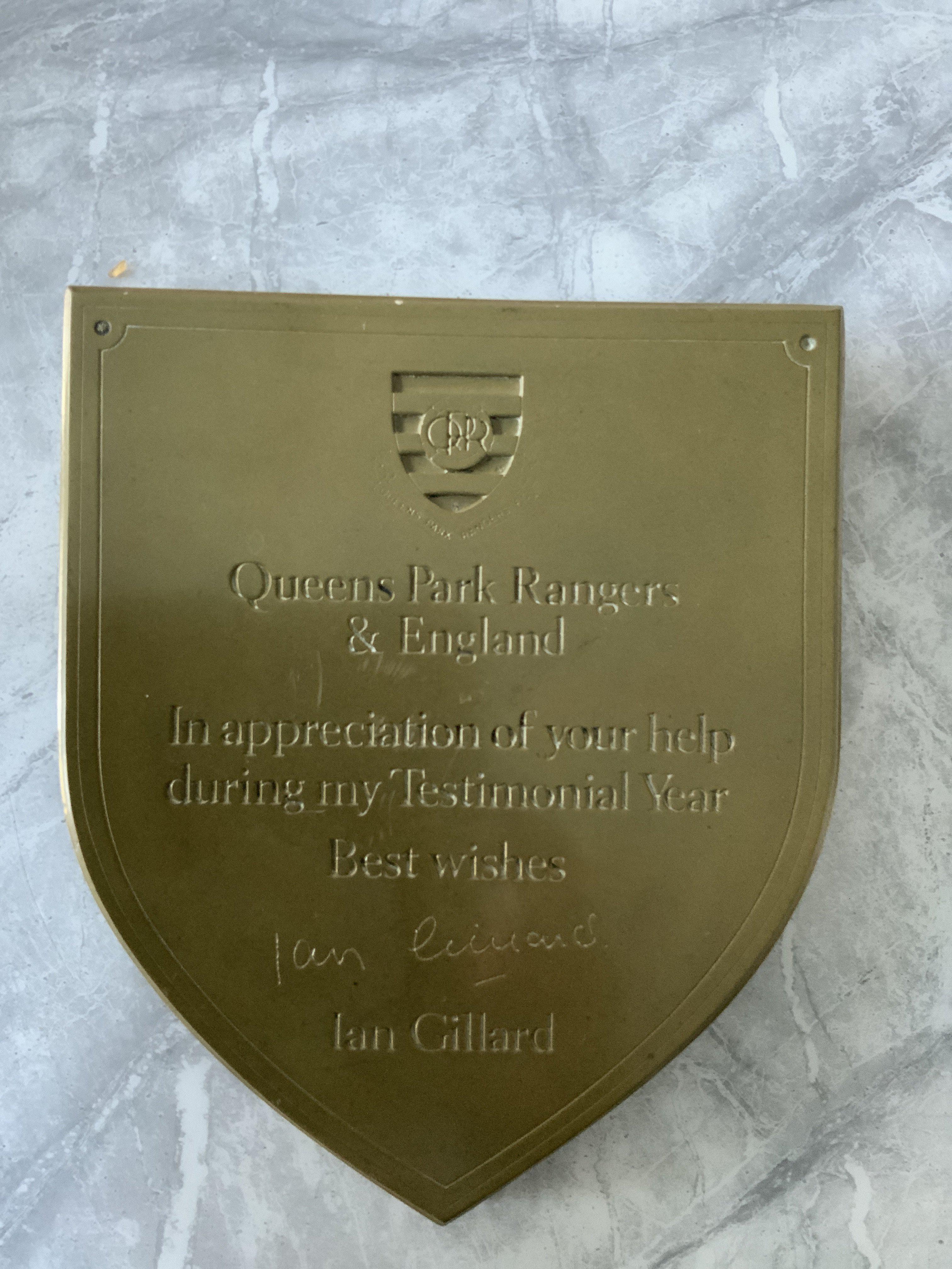 Ian Gillard QPR Testimonial Football Plaque: Heavy bronze looking plaque which states under QPR badge. Queens Park Rangers + England In appreciation of your help during my testimonial year best wishes Ian Gillard. Awarded to players and general helpers.