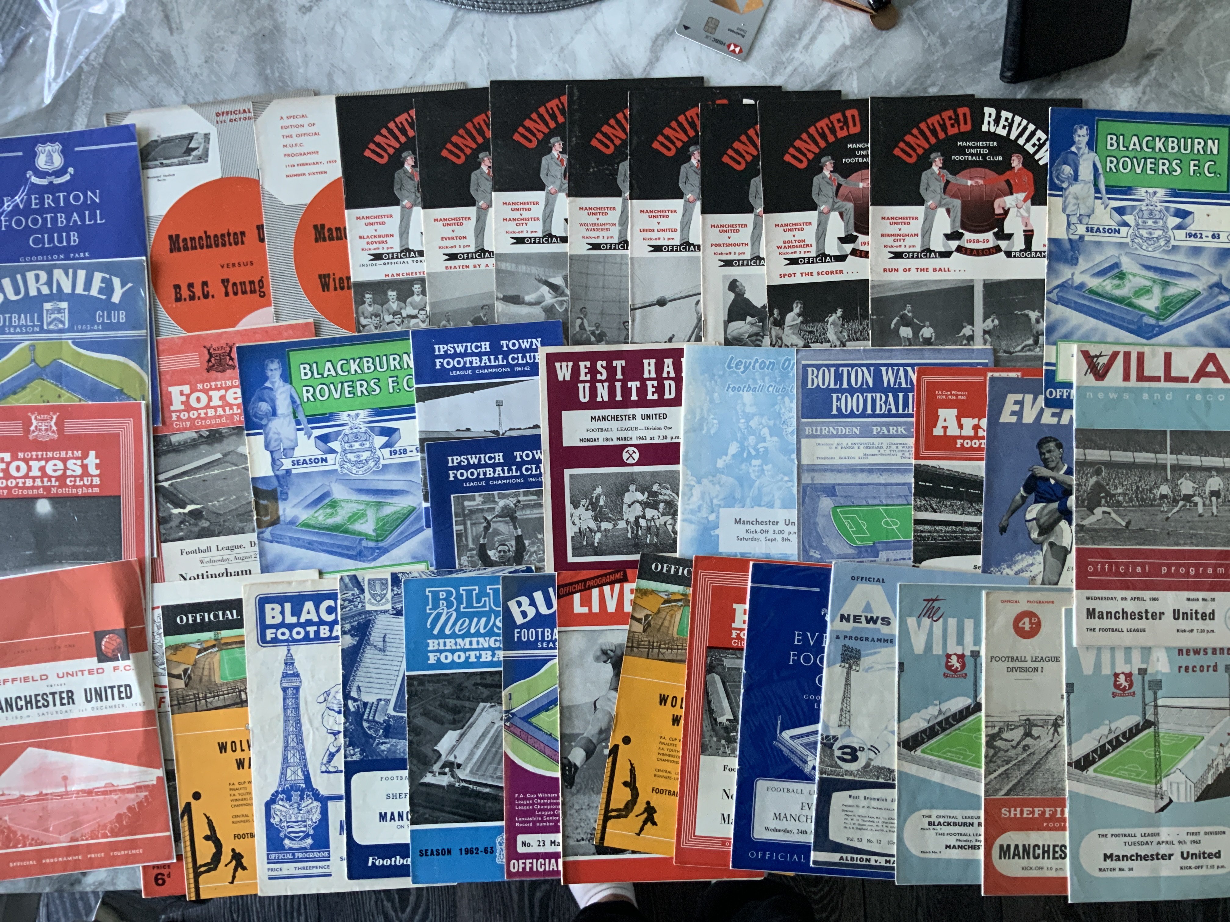Manchester United Football Programmes: 10 homes from 58/59 and a further 29 aways which are mainly early 60s. Excellent. (39)