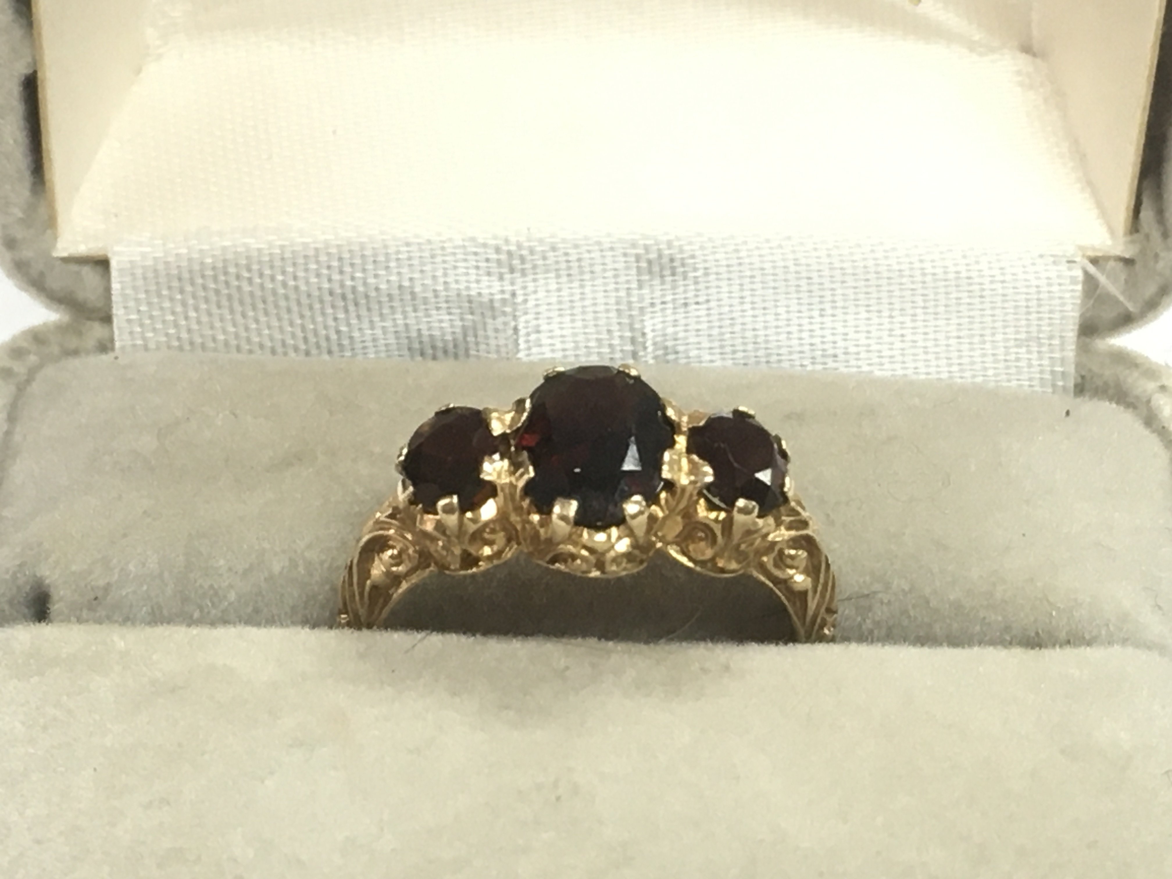 A 9 carat gold Edwardian three stone garnet ring, 3g. Size N Postage category A