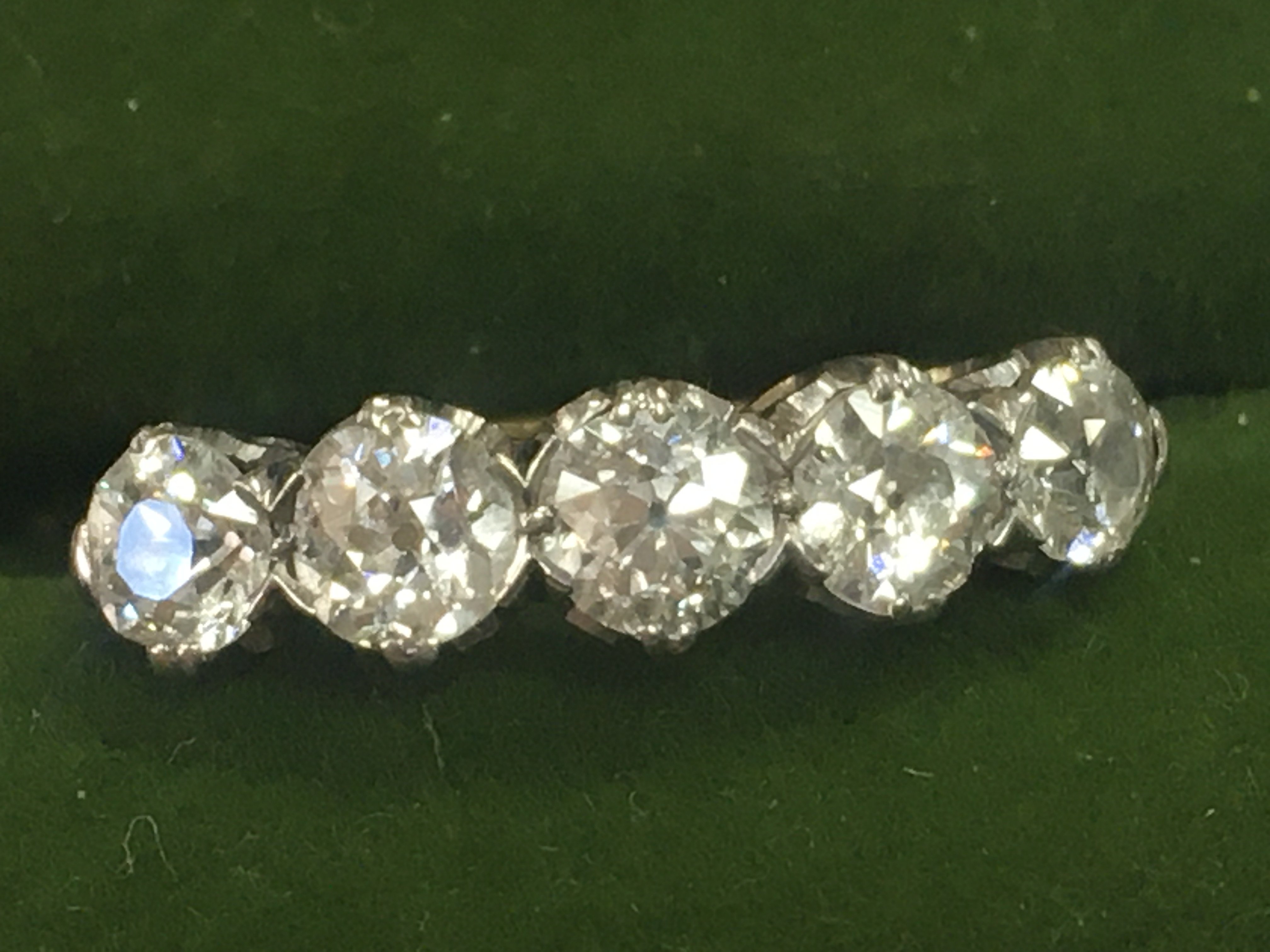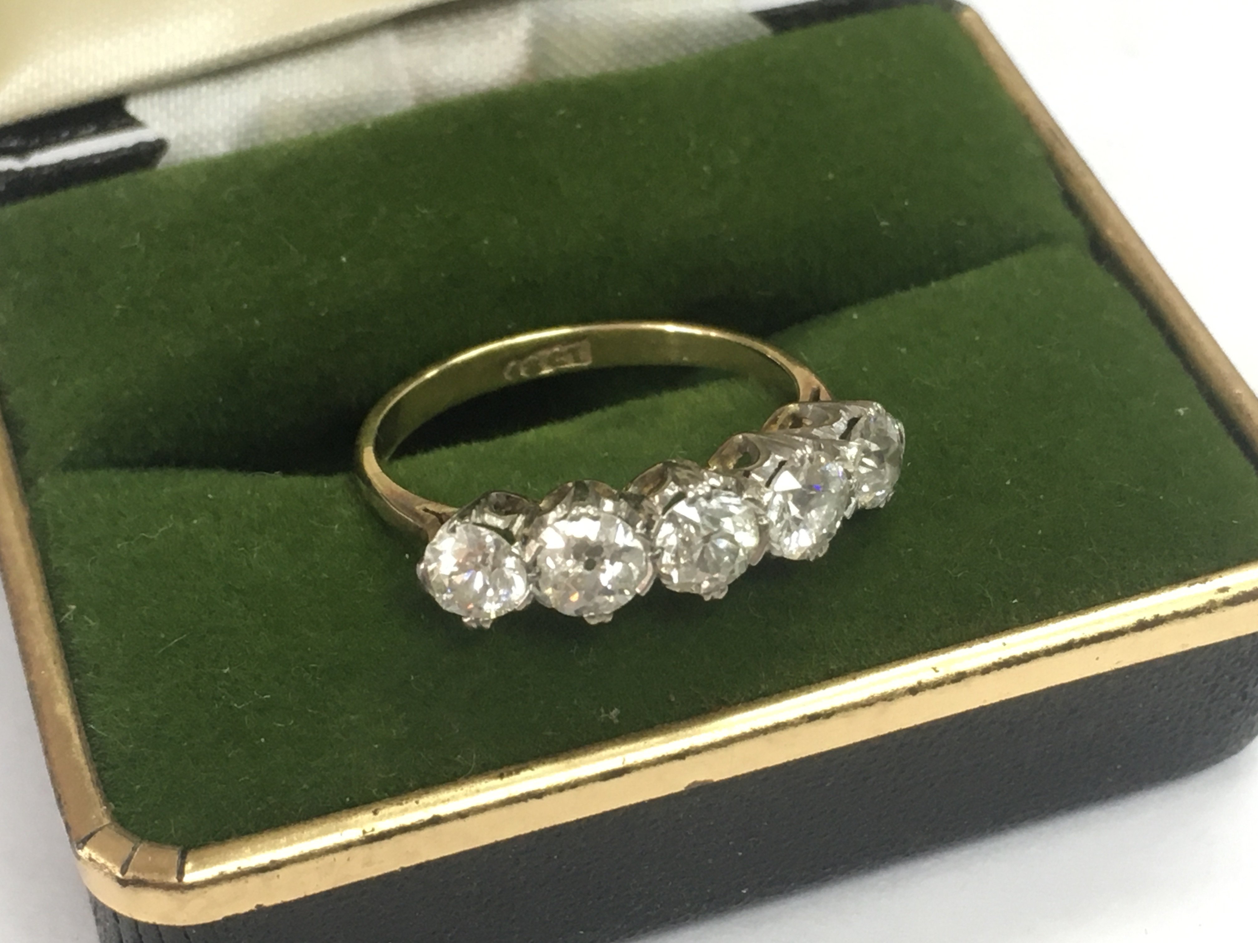 An 18ct gold five stone old brilliant cut ring with approximately 1.4/1.5ct diamonds. Total weight 3.3G. Size P. Postage category A