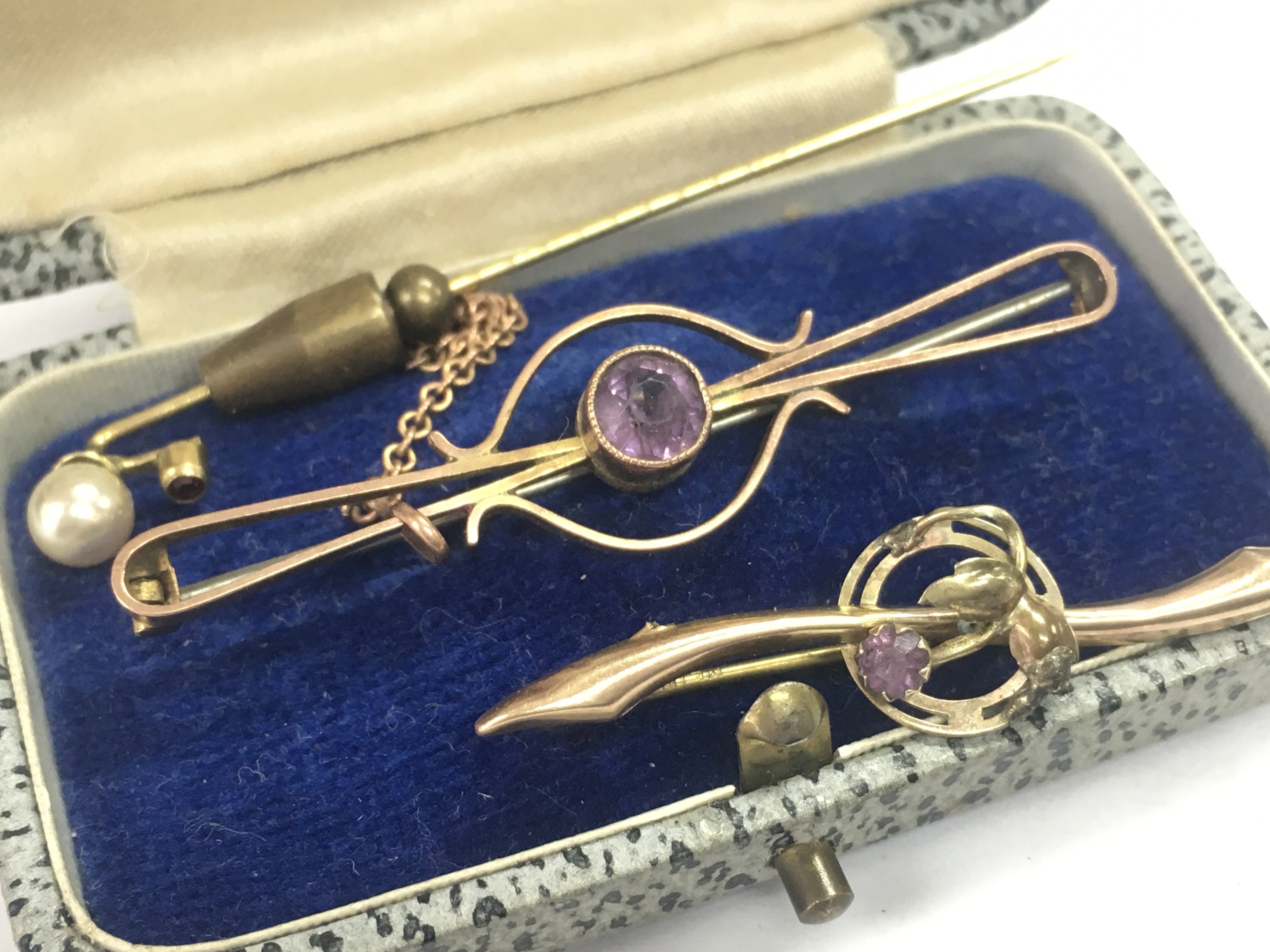 9ct gold brooches and a cultured Pearl gold stick pin , 5.8g total weight. Postage category A