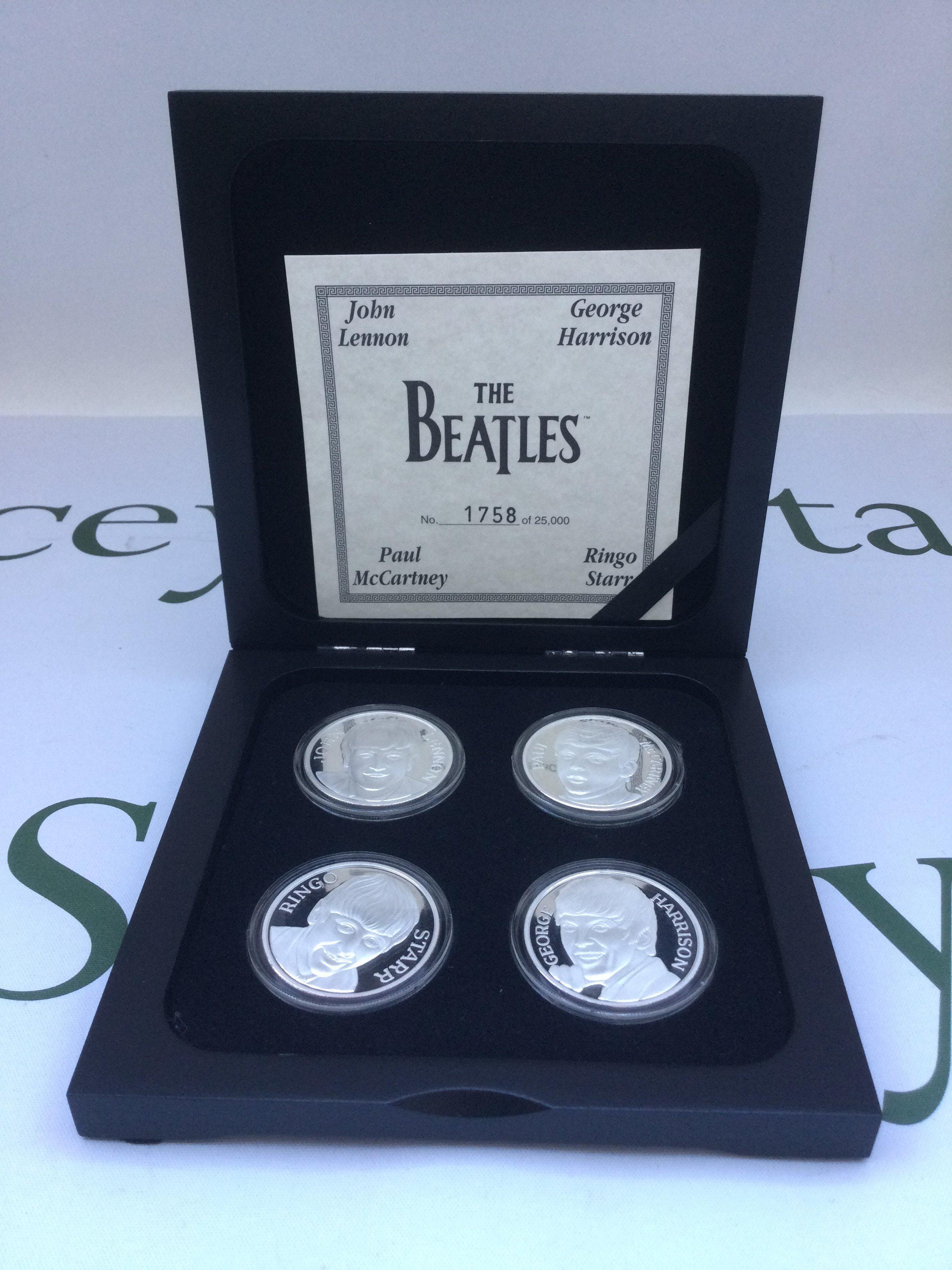 A cased limited edition set of four silver 1oz coins of The Beatles.