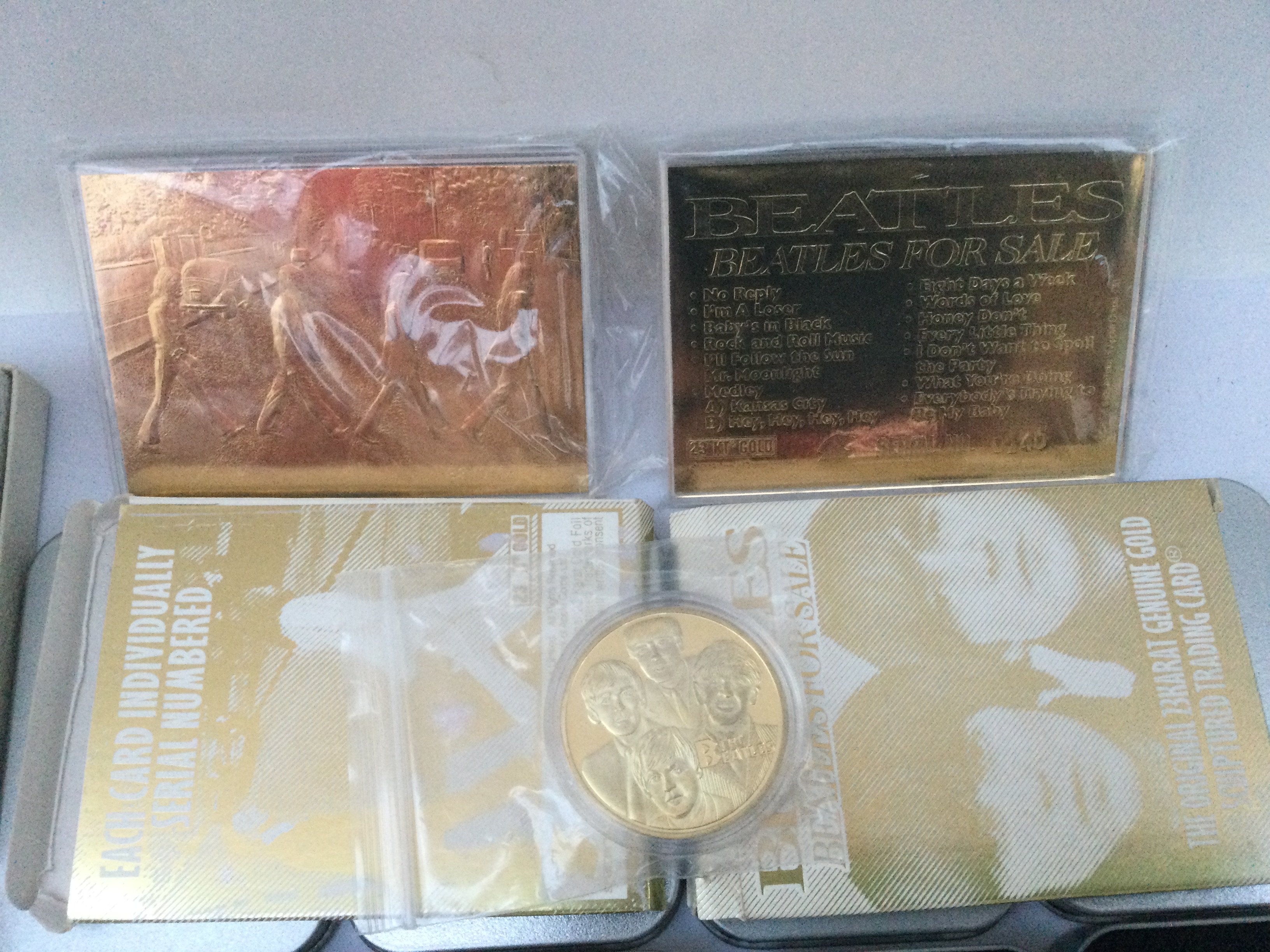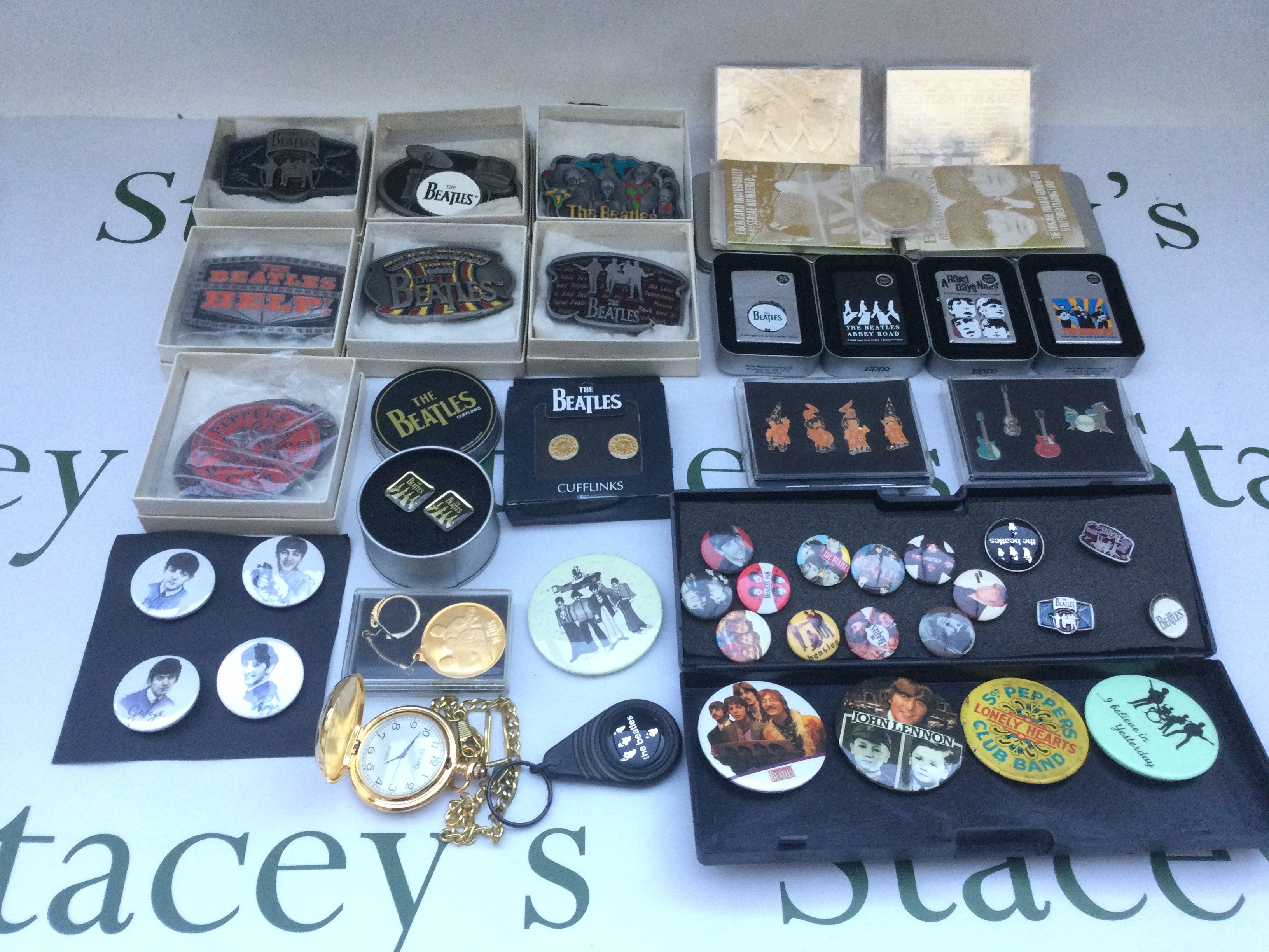 A collection of Beatles memorabilia comprising two 23kt gold trading cards, four zippo lighters, various badges, belt buckles, cufflinks etc.
