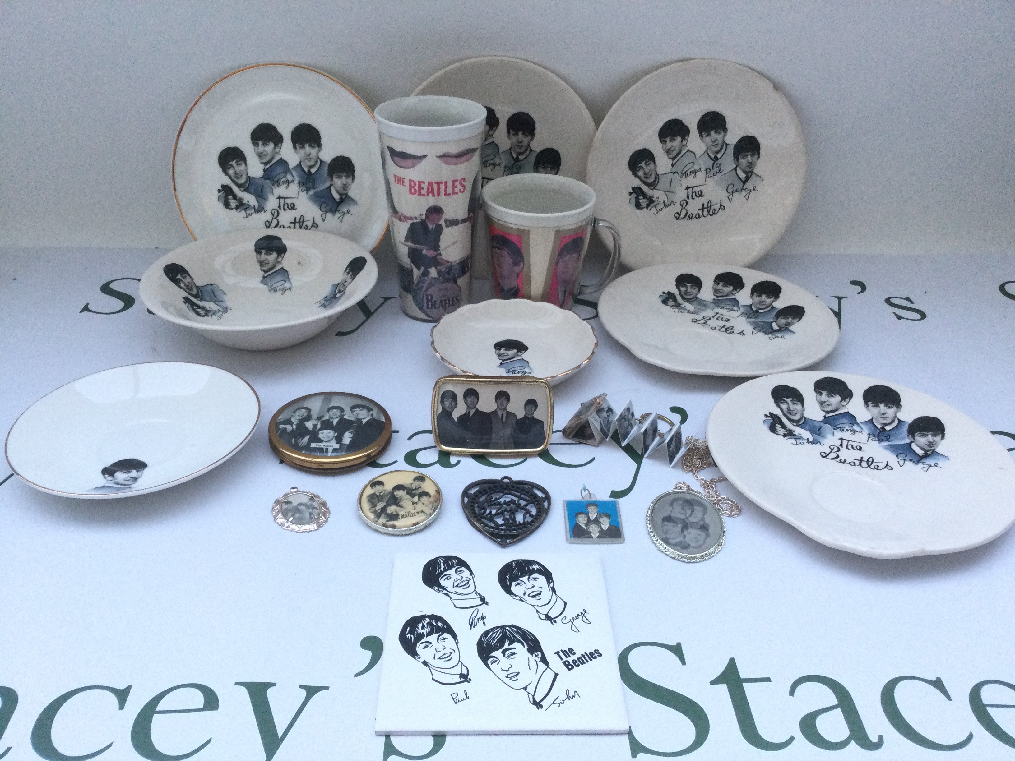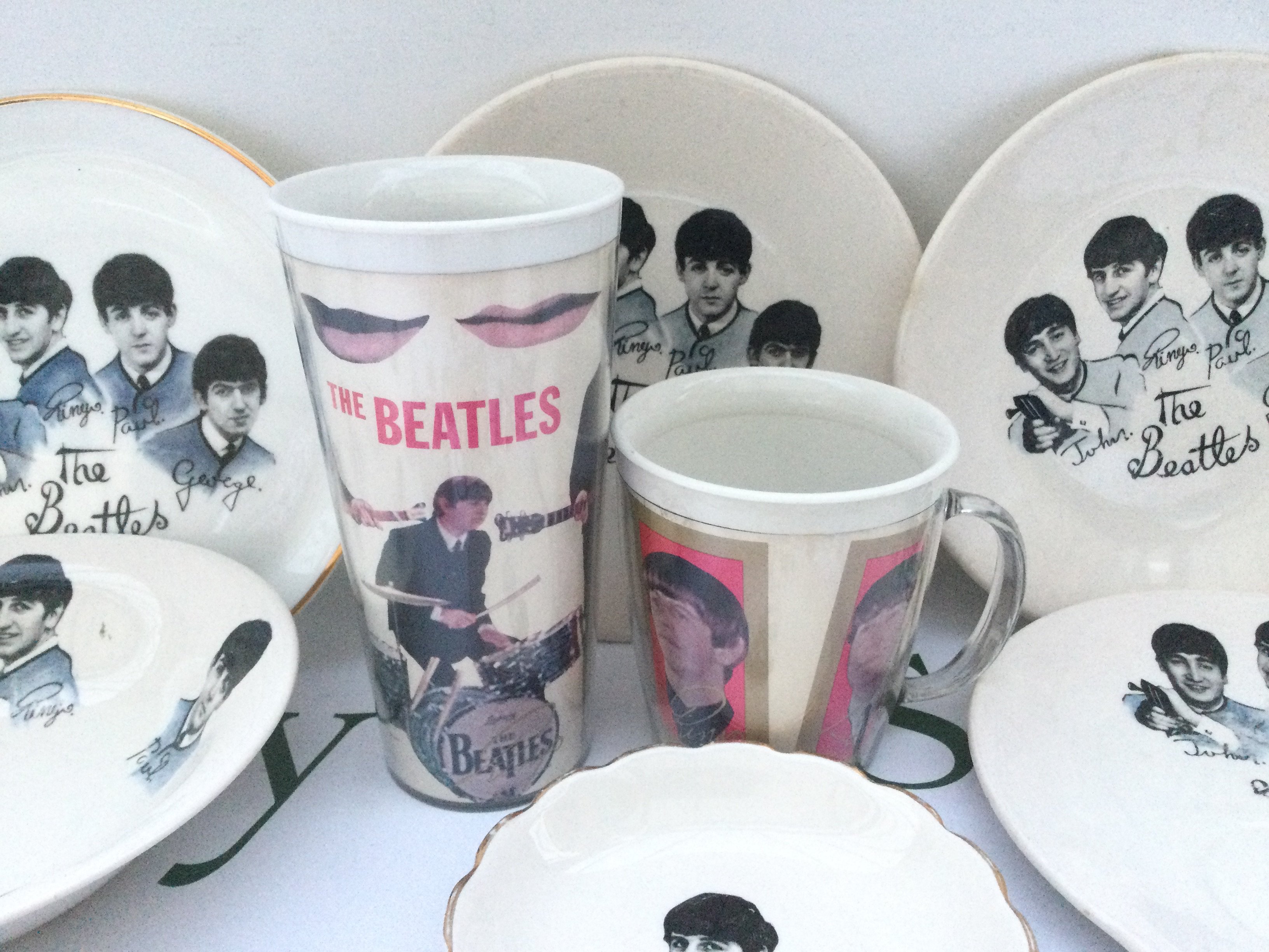 A collection of mainly 1960s Beatles memorabilia comprising a NEMS plastic beaker, NEMS cup, plates, tile etc.