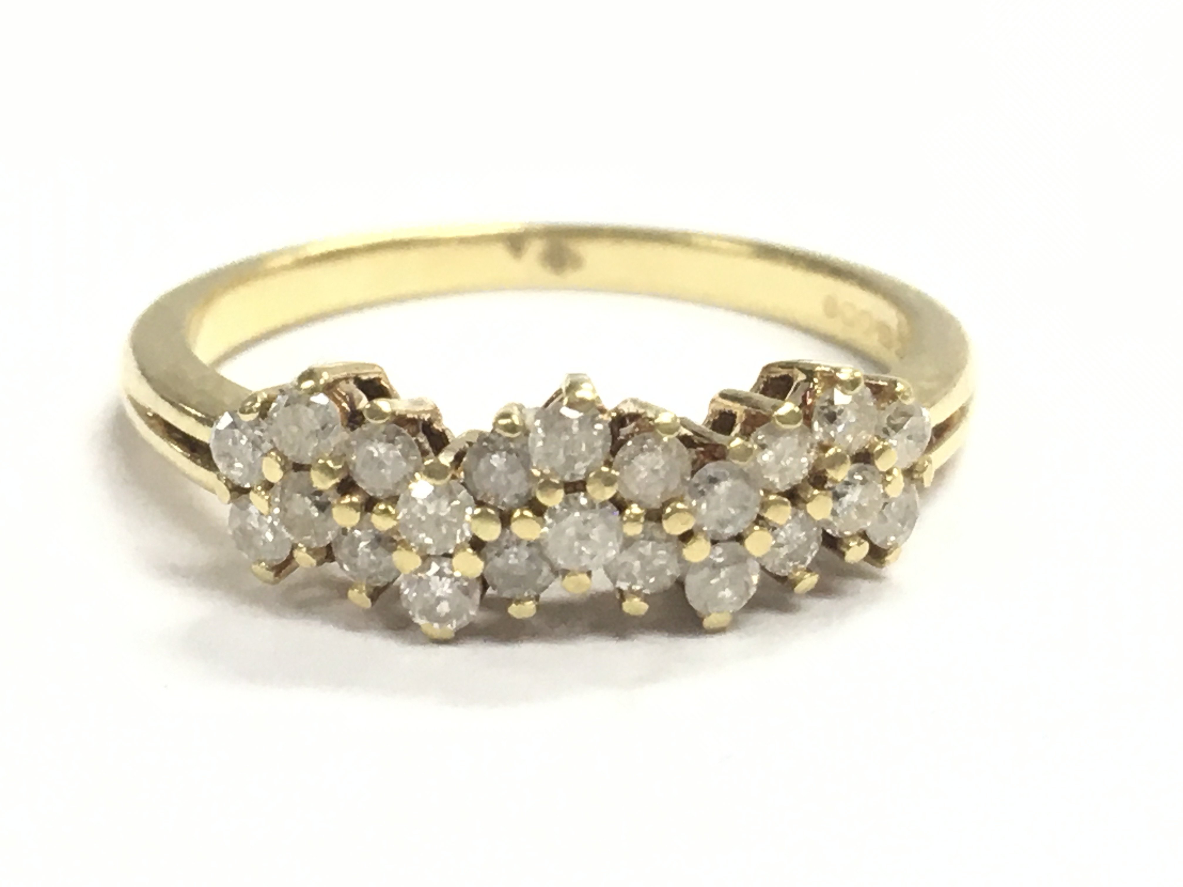 An 18ct gold diamond cluster band ring, 2.58g total weight. Size L. Postage category A