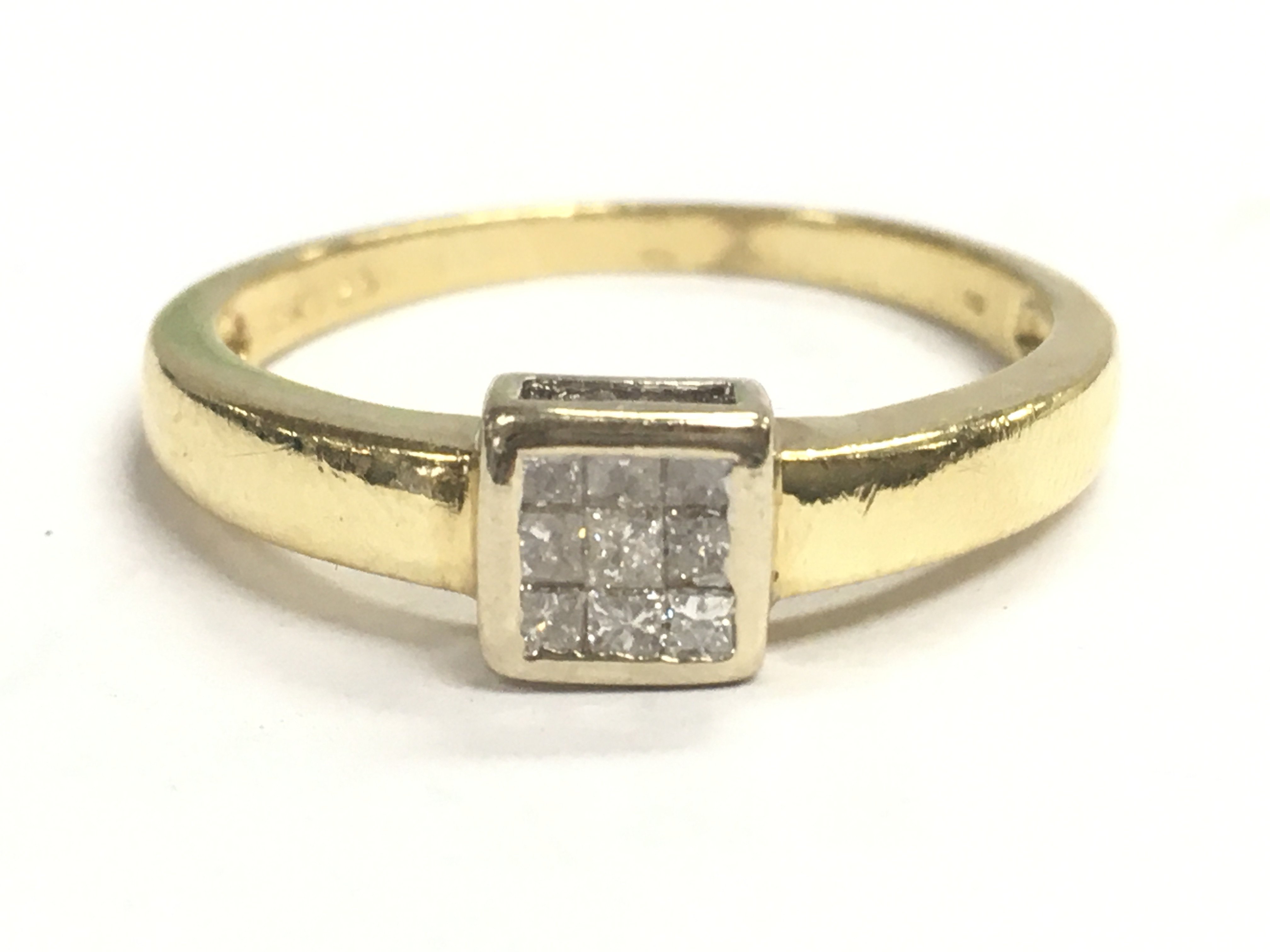 An 18ct gold princess cut diamond ring , 3.9g , size T. Postage category A