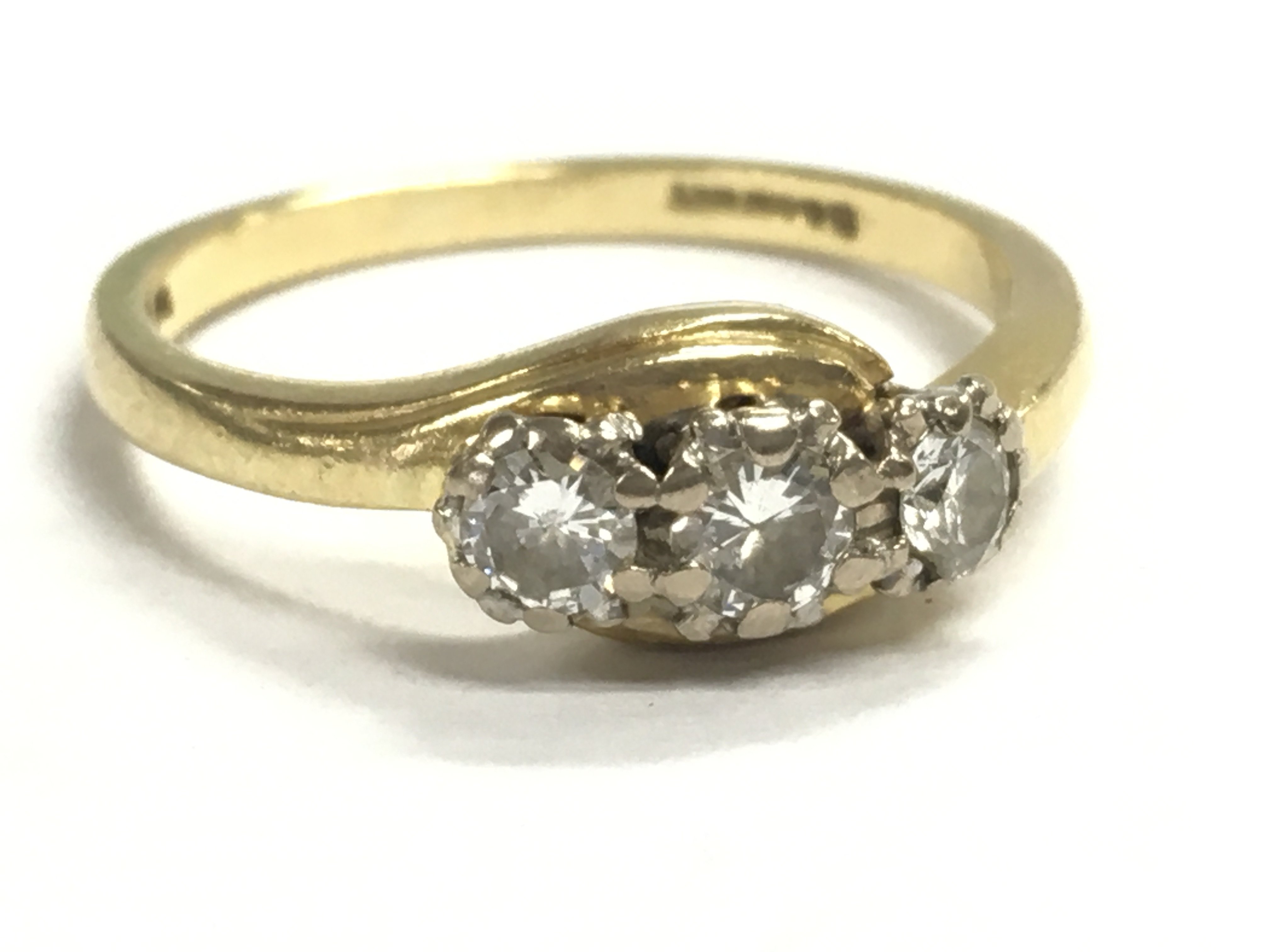 An 18ct gold three stone diamond ring, size N/O. 4g total weight. Postage category A