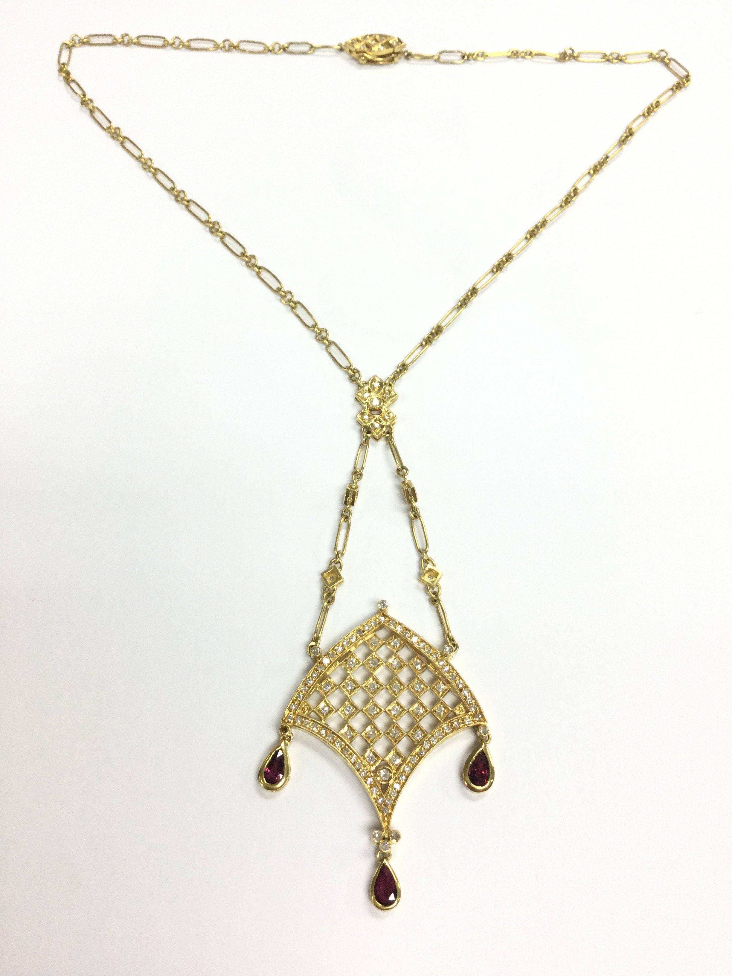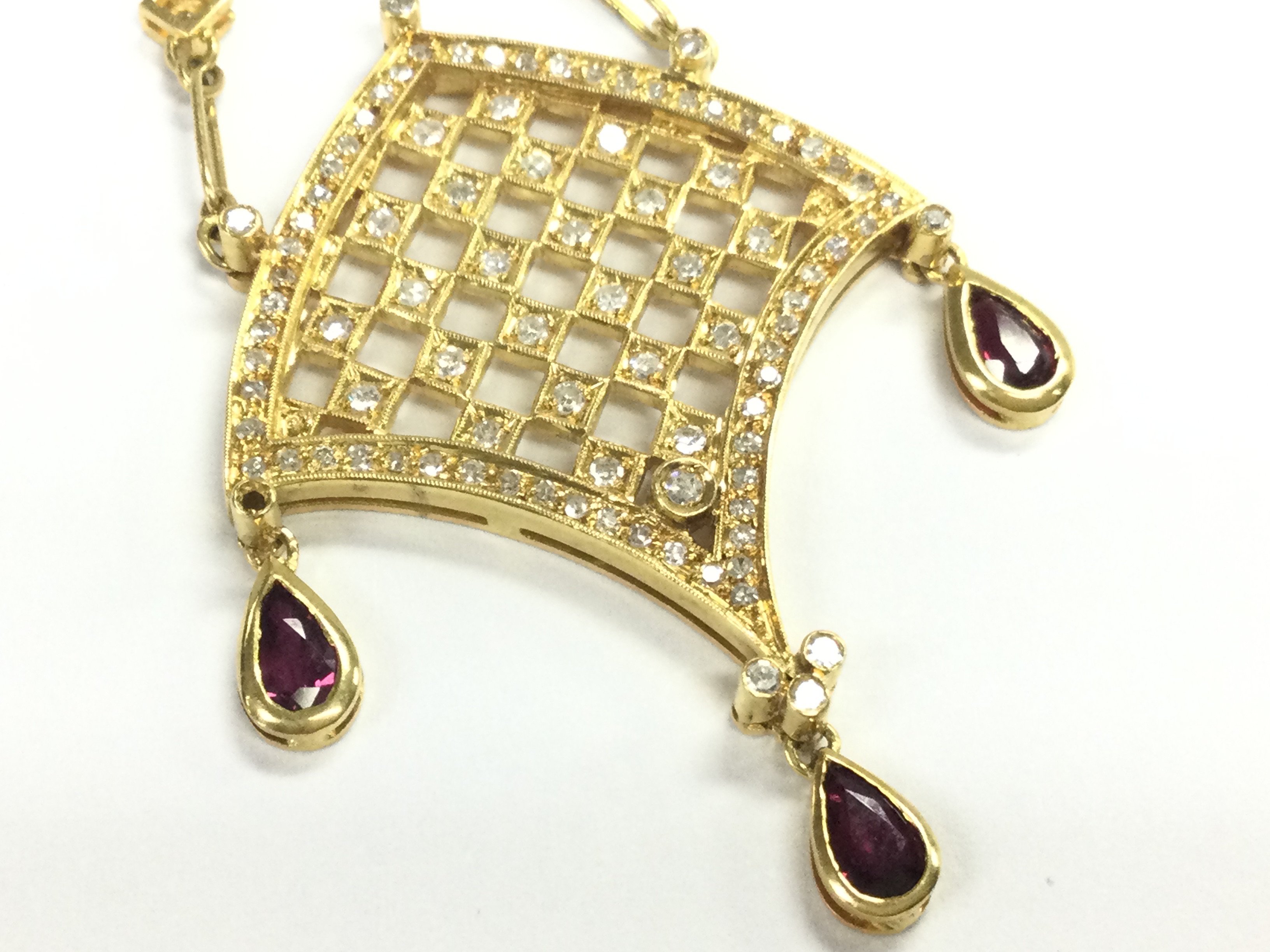 An 18ct gold diamond and ruby set Art Nouveau style choker necklace, total weight 20.2g.postage category A
