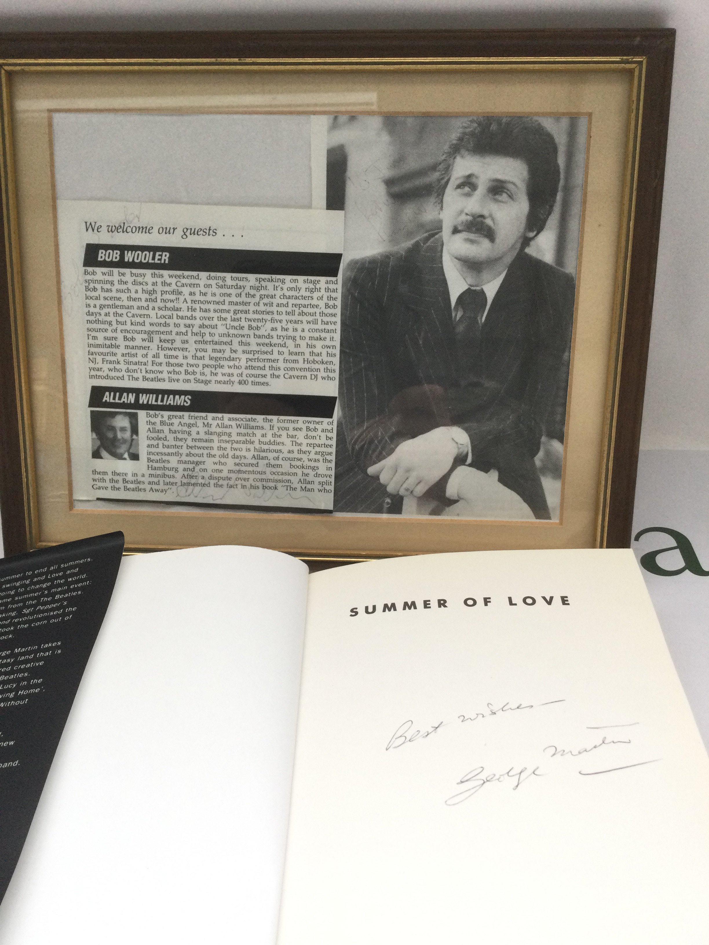 A signed George Martin 'Summer Of Love' hardback book plus a separate framed magazine page signed by Bob Wooler and Allan Williams plus Pete Best's autograph, sadly faded.