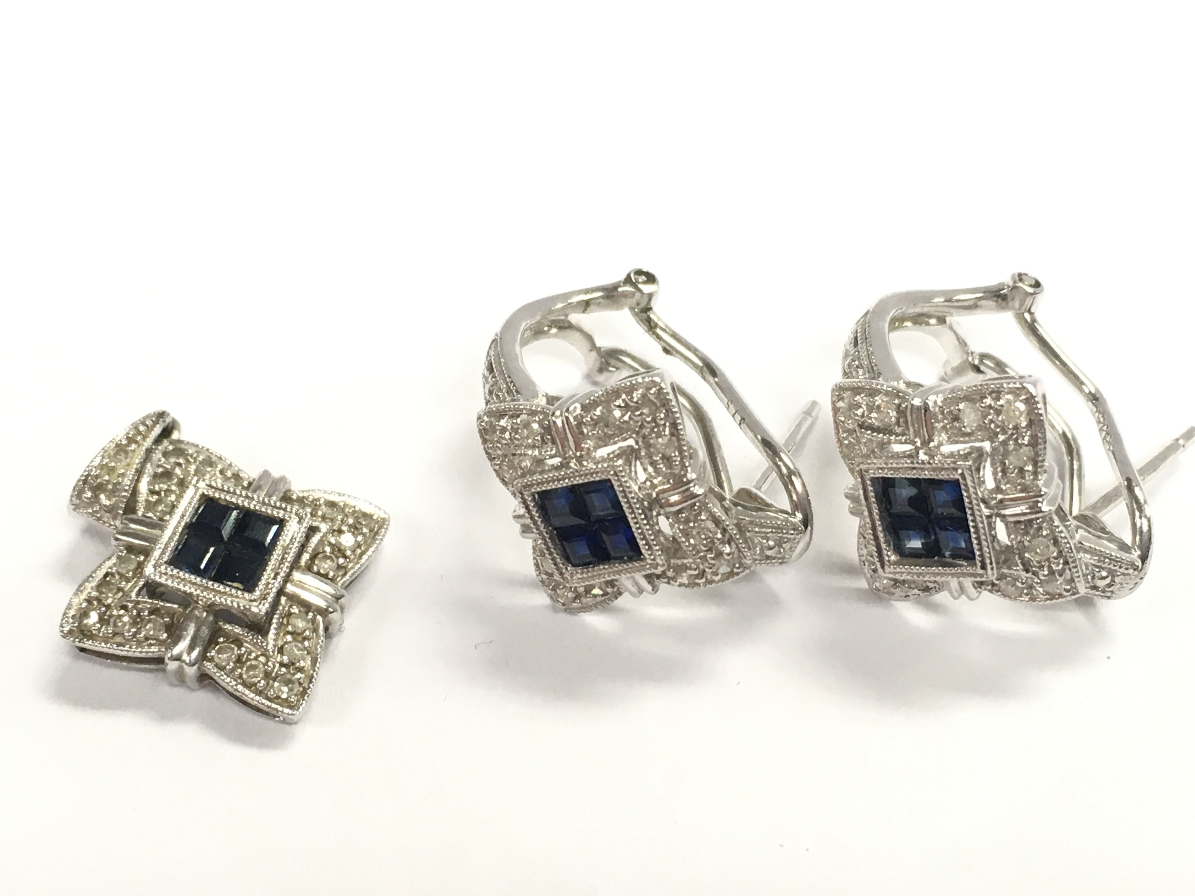 A 9ct white gold sapphire and diamond cluster stud pair of earrings and a pendant, total weight 6.4g. Postage category A
