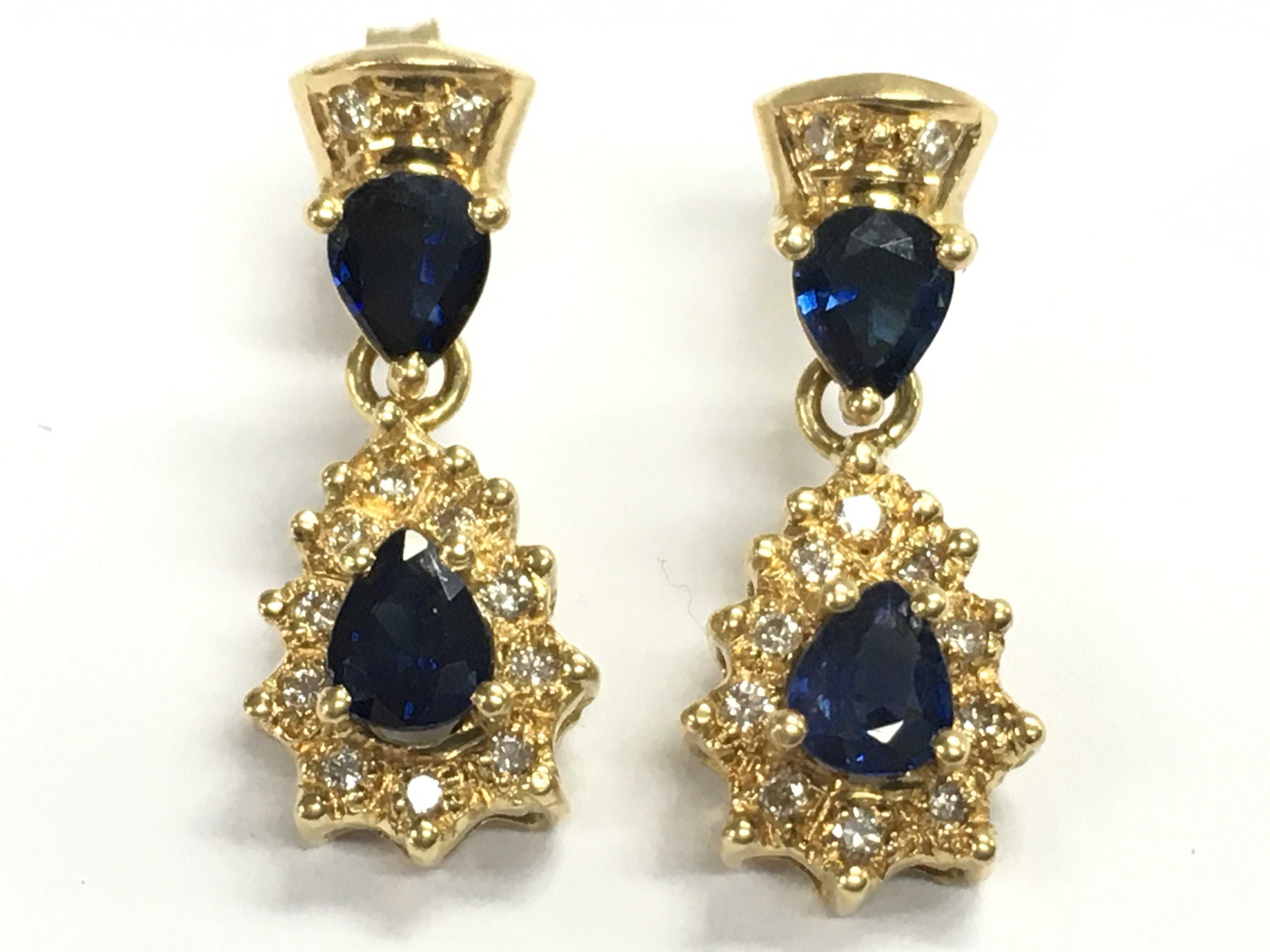 A pair of 18ct gold sapphire and diamond drop earrings Total weight 5.1g Postage category A