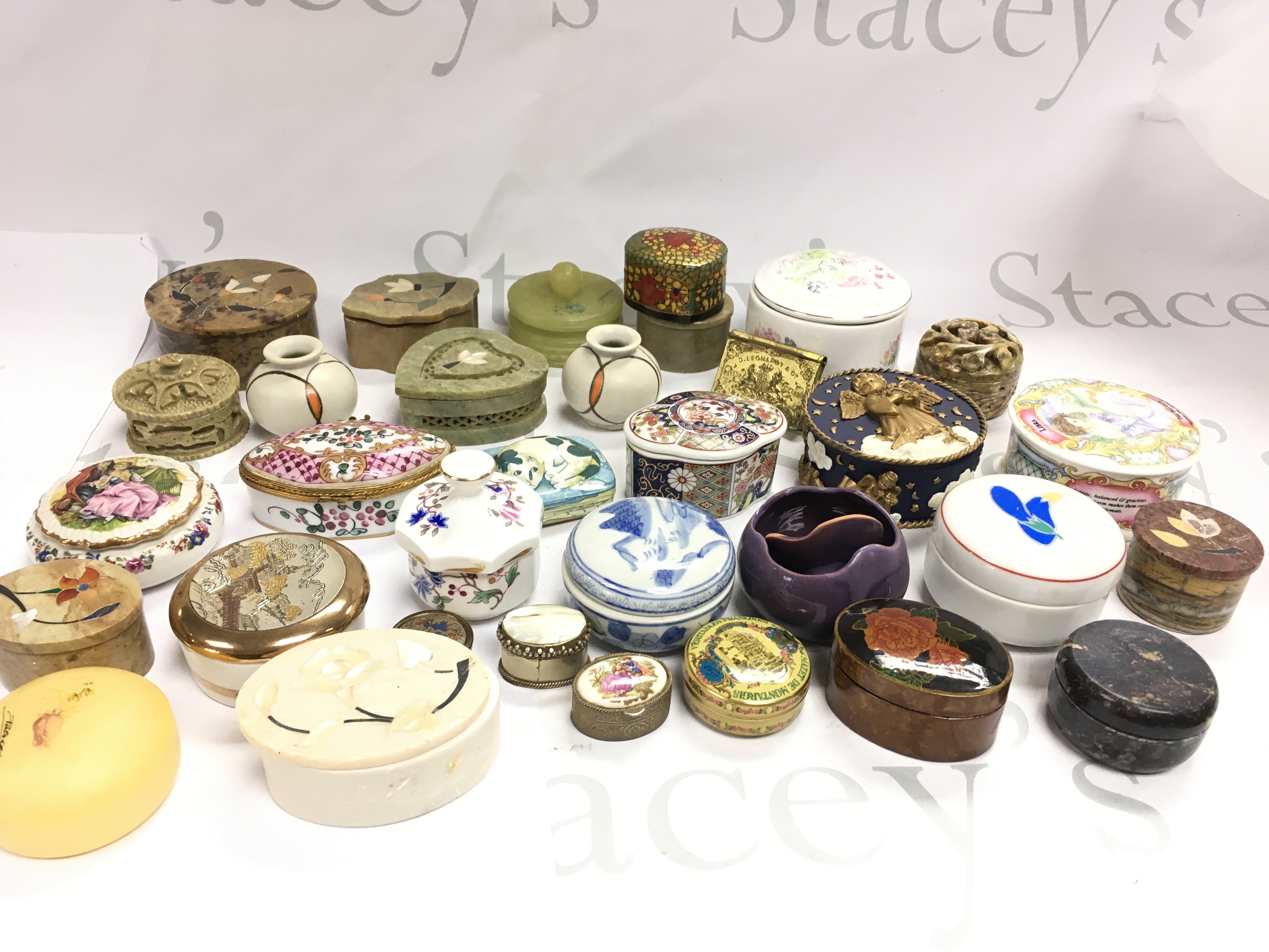 A collection of various pill boxes and small pots including oriental examples, Alabastros, Wren, Soapstone etc. this lot cannot be posted