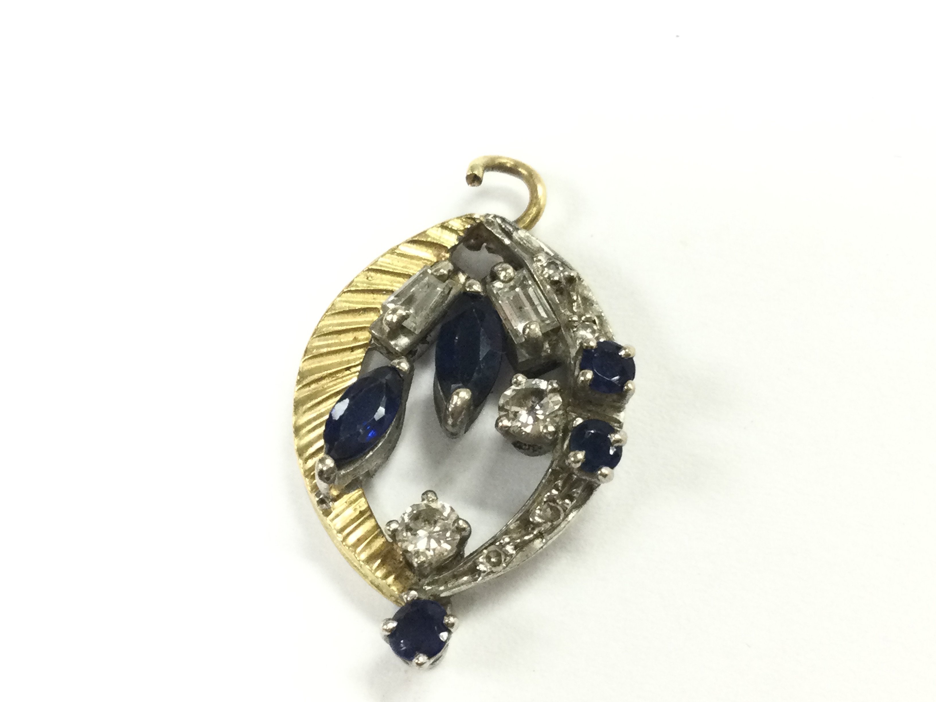 An unmarked high carat white and yellow gold pendant set with diamonds and sapphires. 3.2g . Postage category A