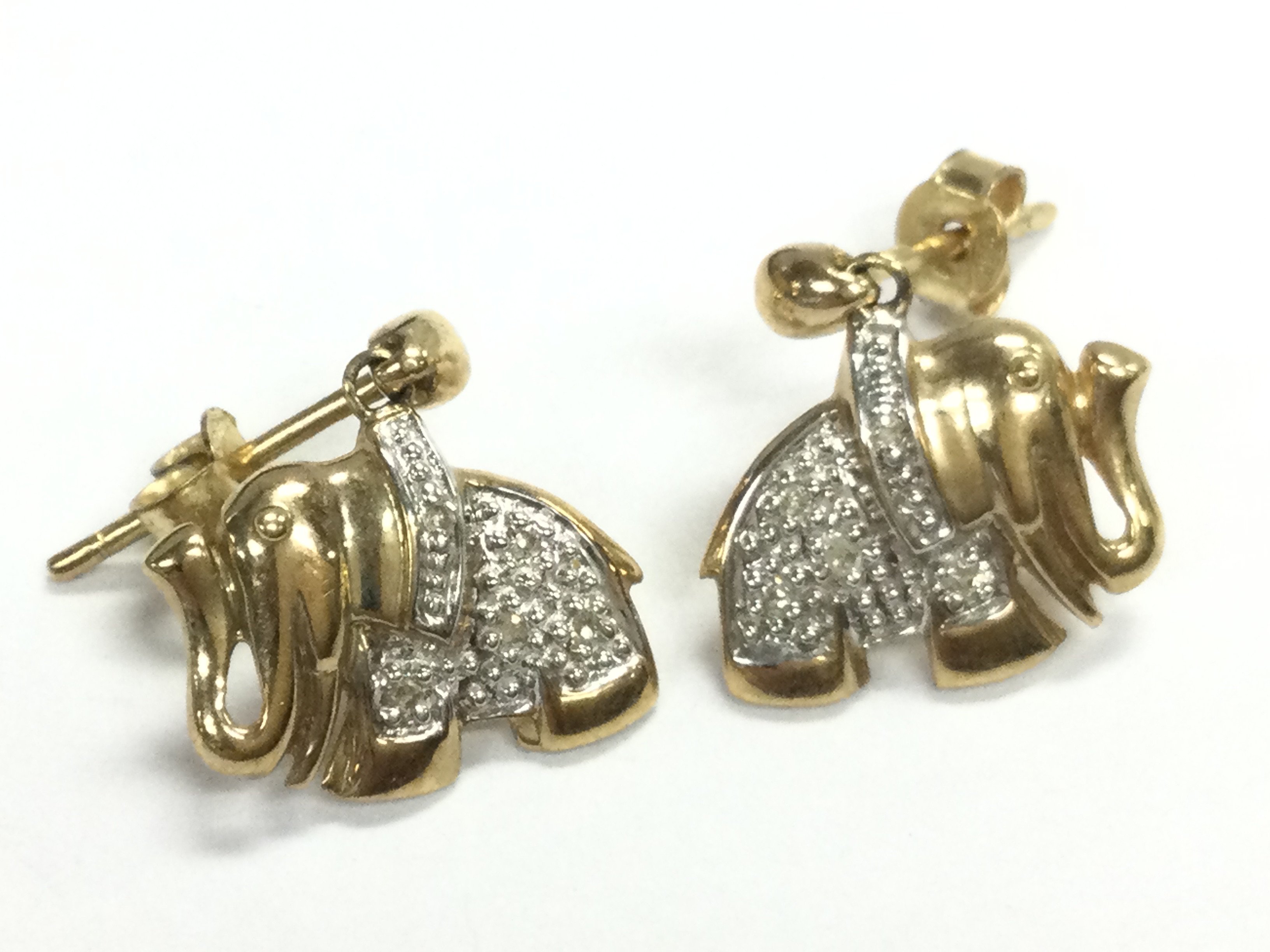 A 9ct gold diamond elephant drop earrings. Total weight 1.9g postage category A