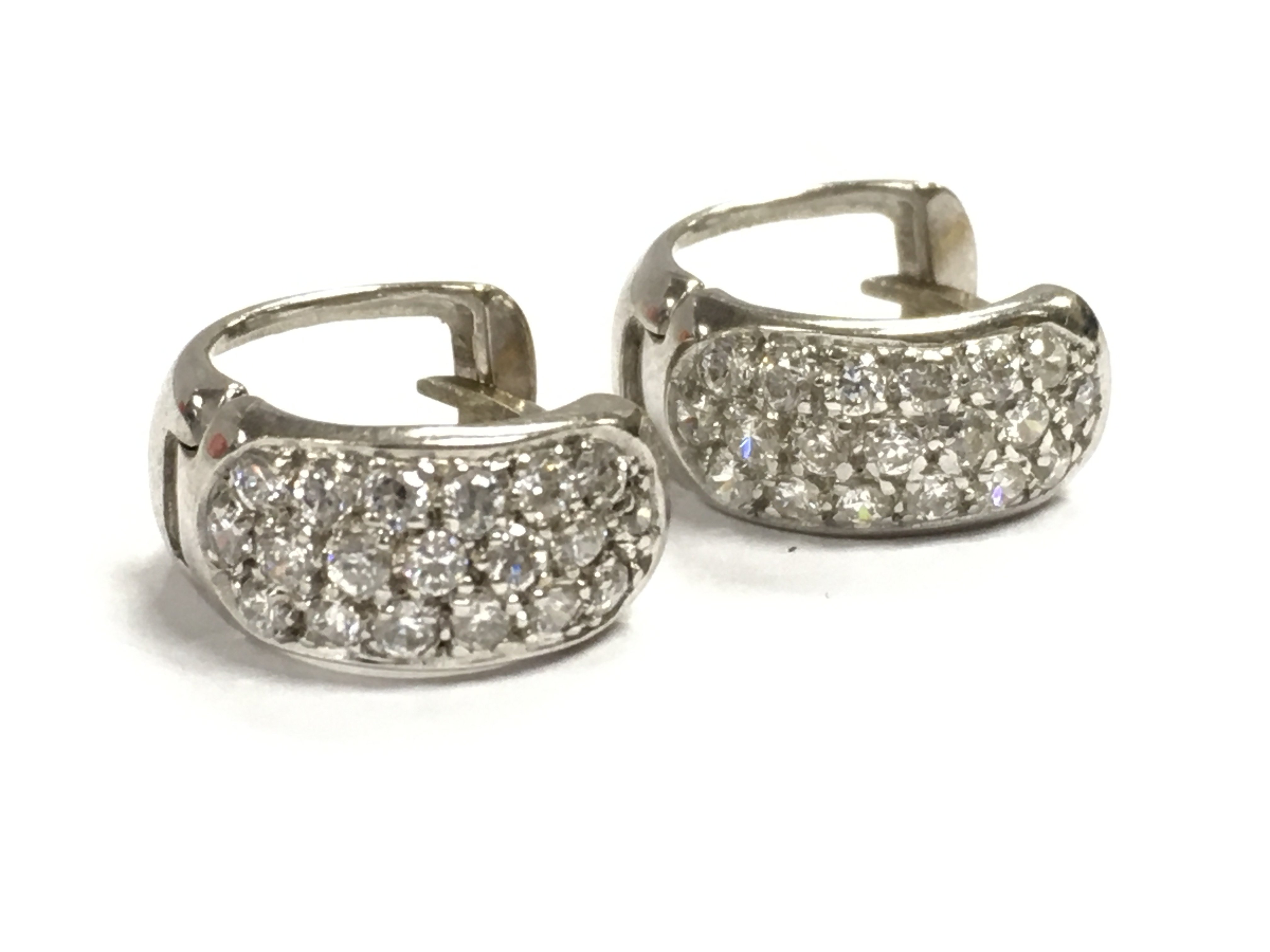 An unmarked pair of 14ct White gold diamond stone set hoops , total weight 3.8g postage category A