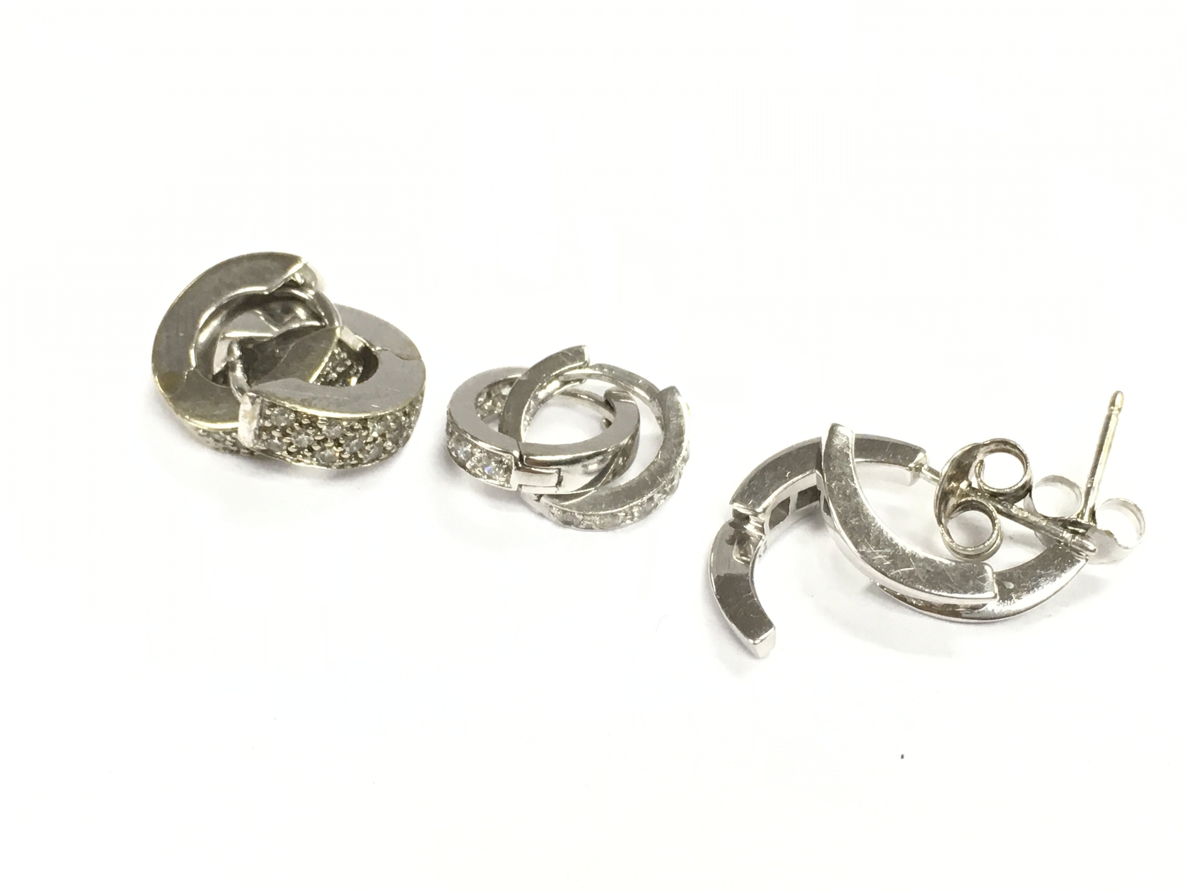 Pairs of 9ct white gold diamond set hoop earrings, 8g total weight. Postage category A