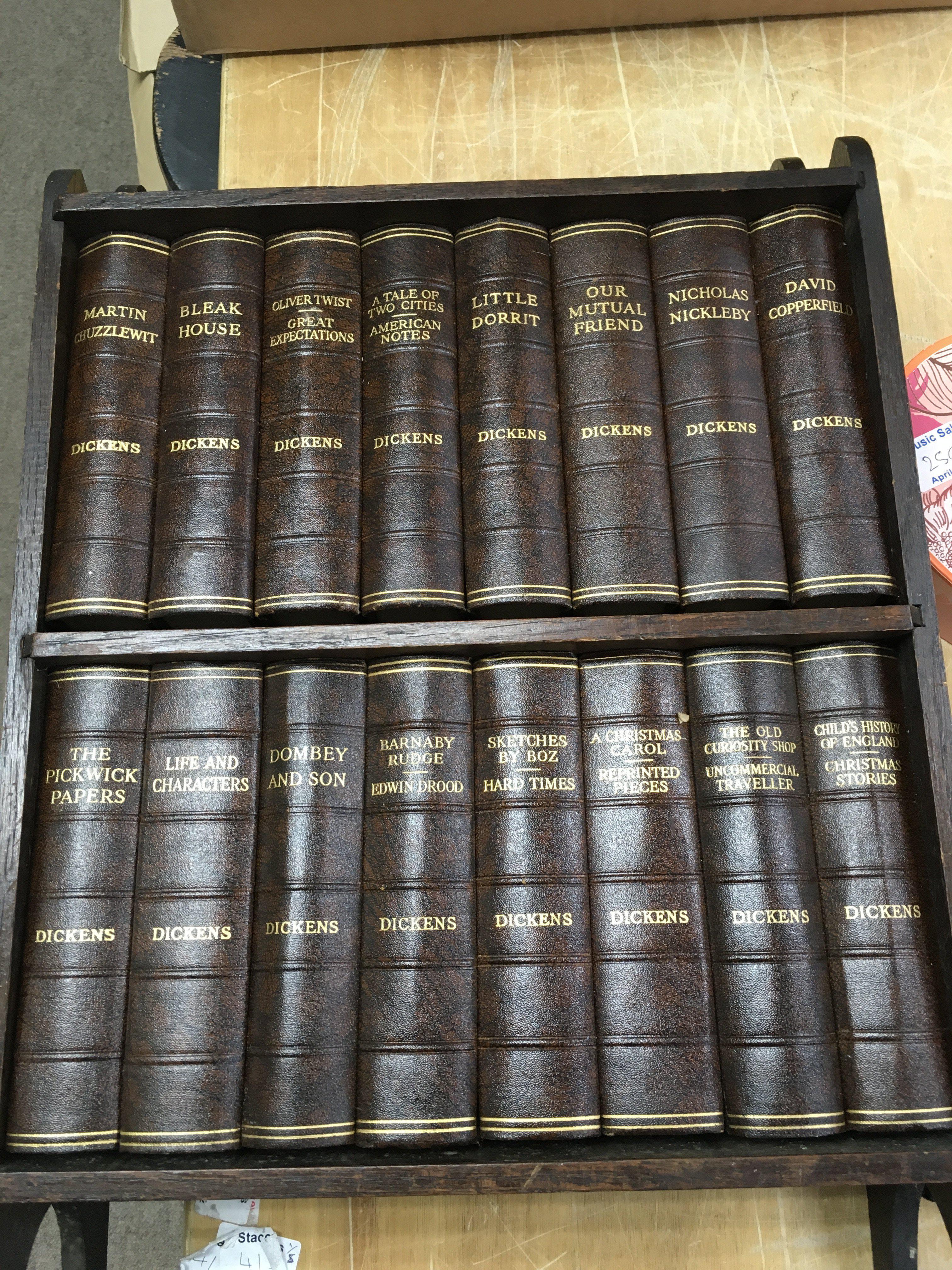 A collection of Charles dickens books in a wooden oak book case including Martin Chuzzlewit, Bleak House, Oliver Twist etc. Published by Odhams press .this lot cannot be posted