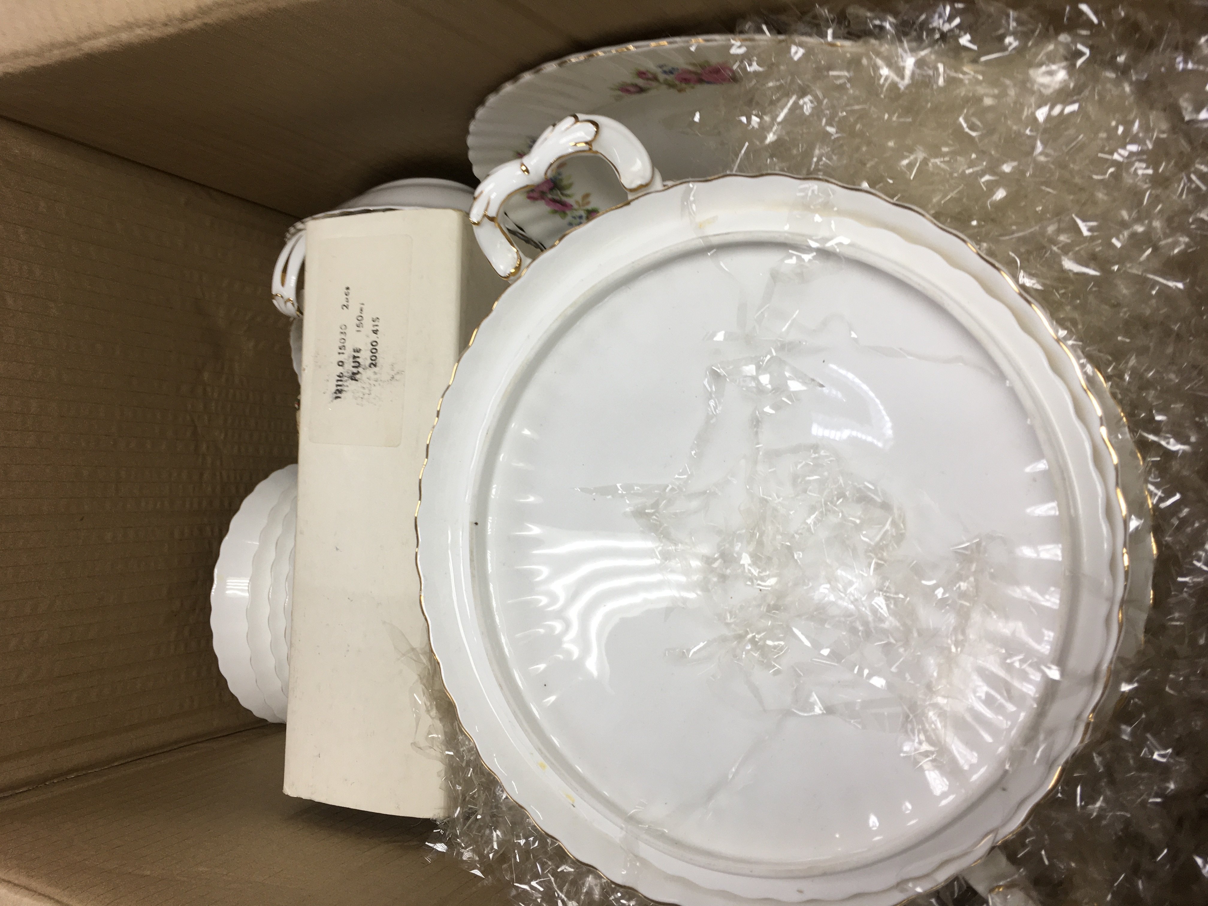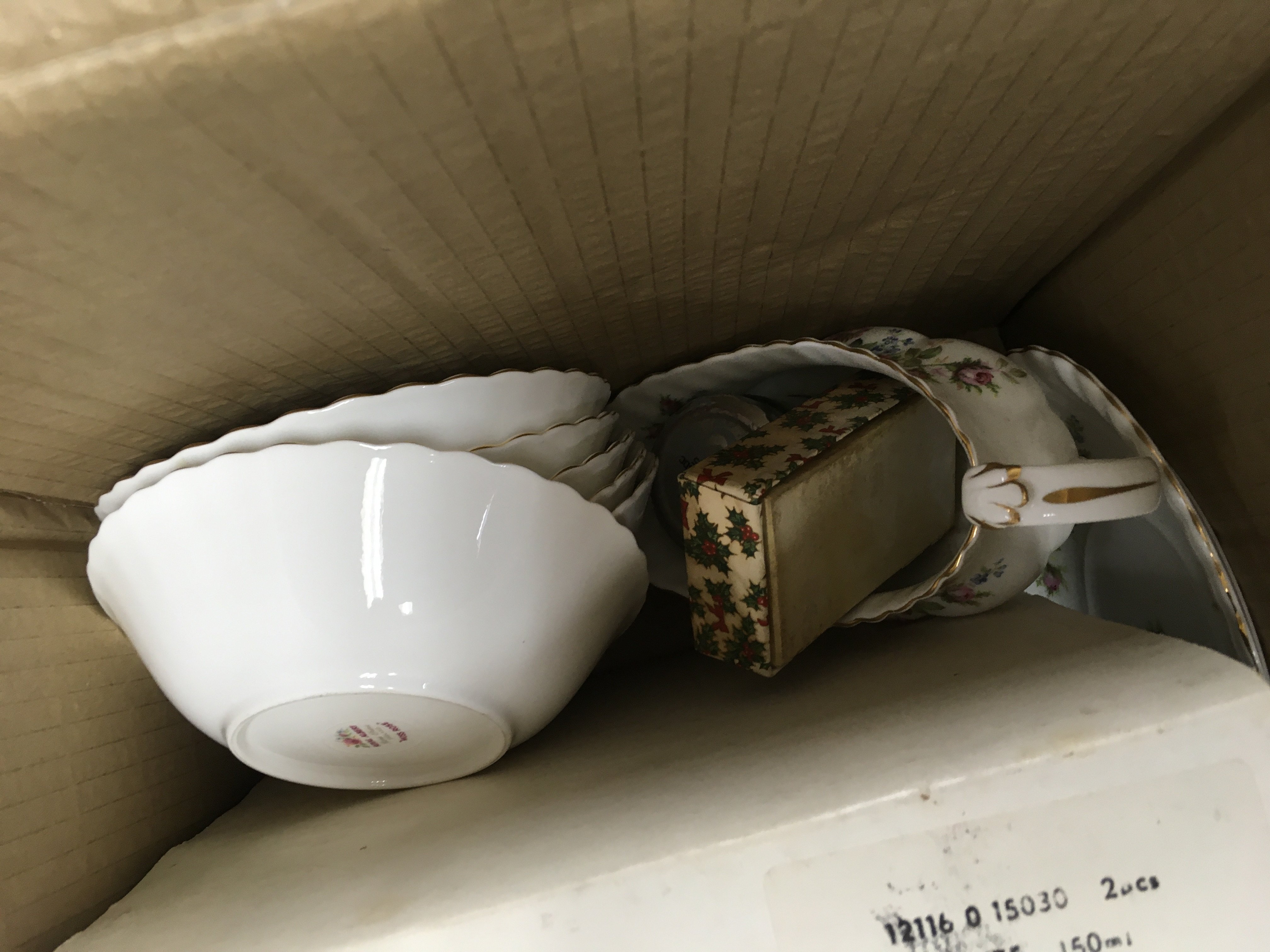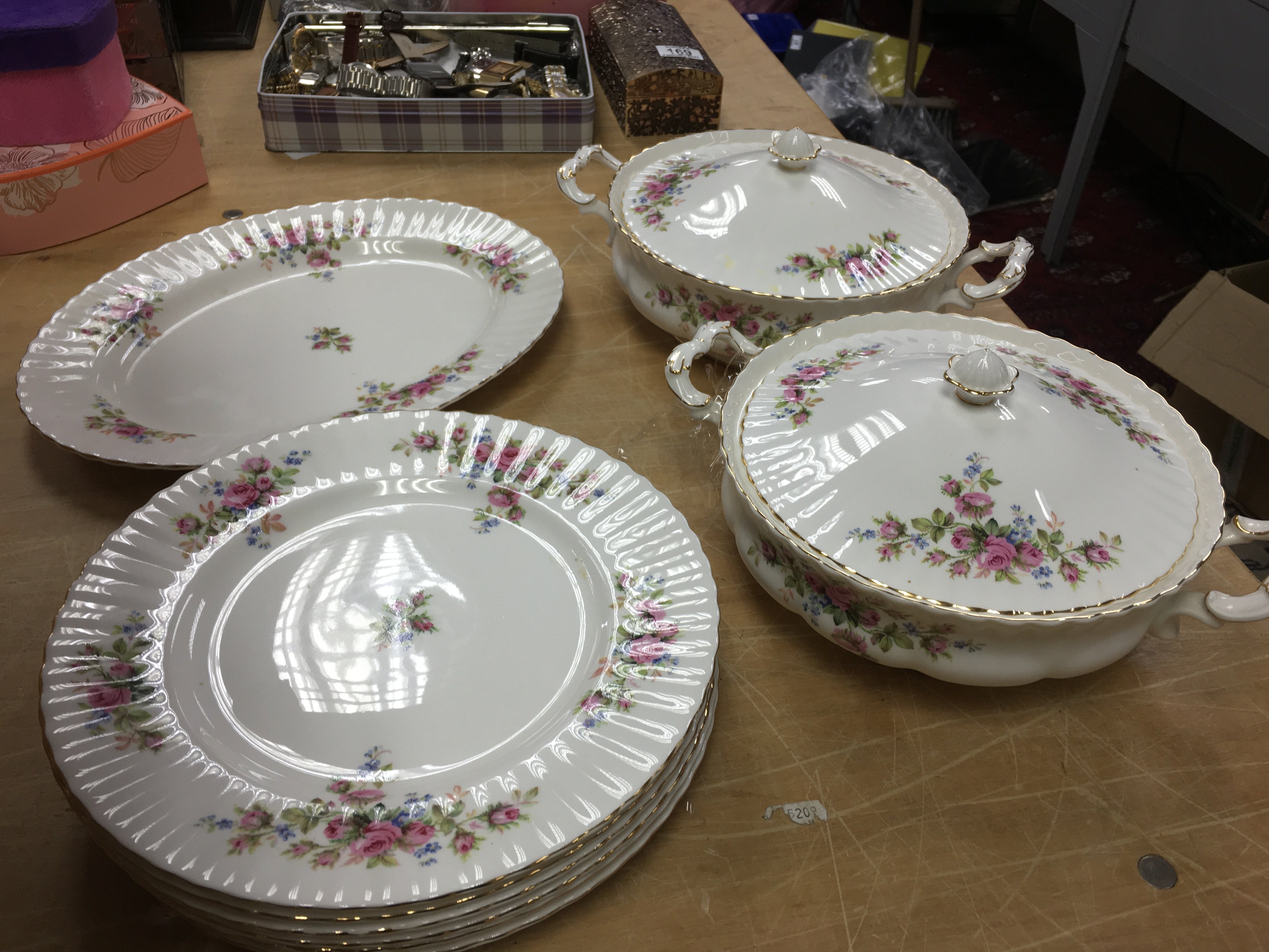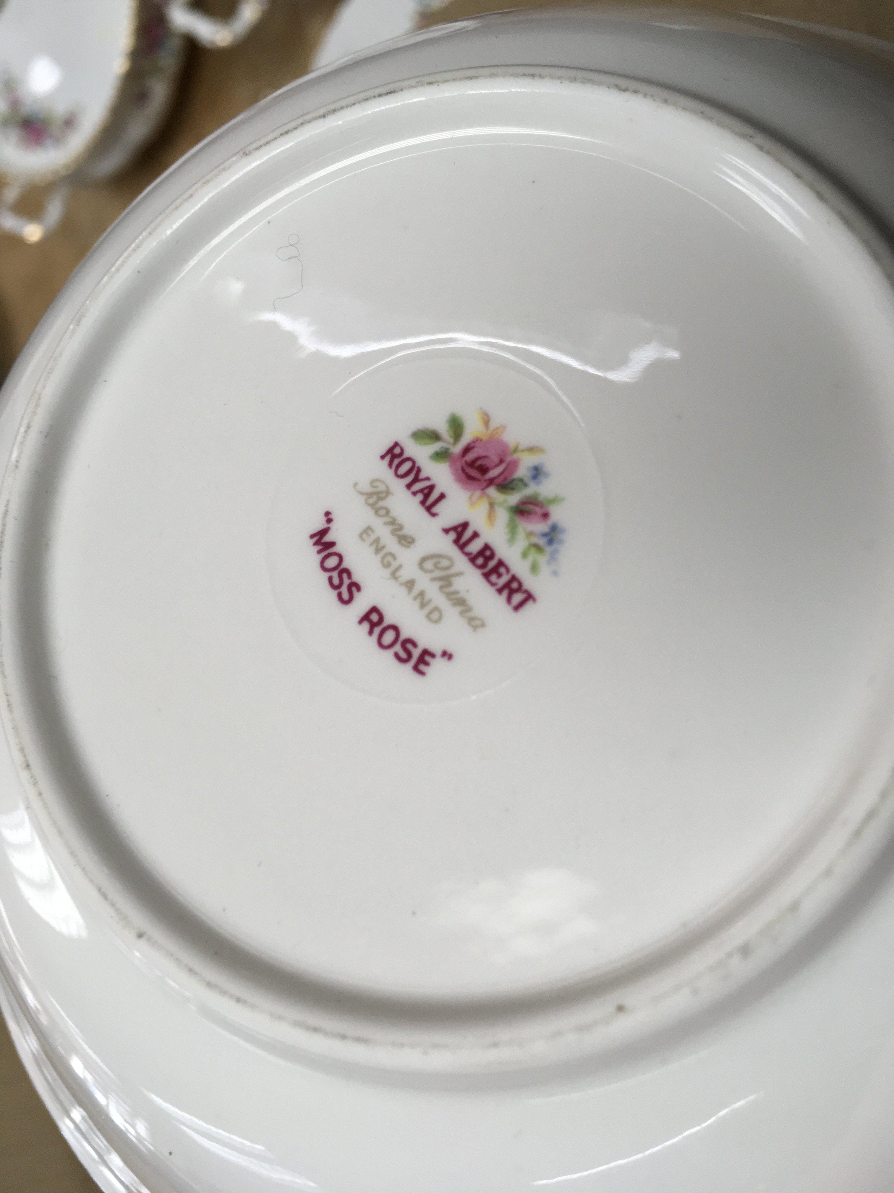 A box including Royal Albert Moss Rose plates and dishes etc . This lot canned be posted