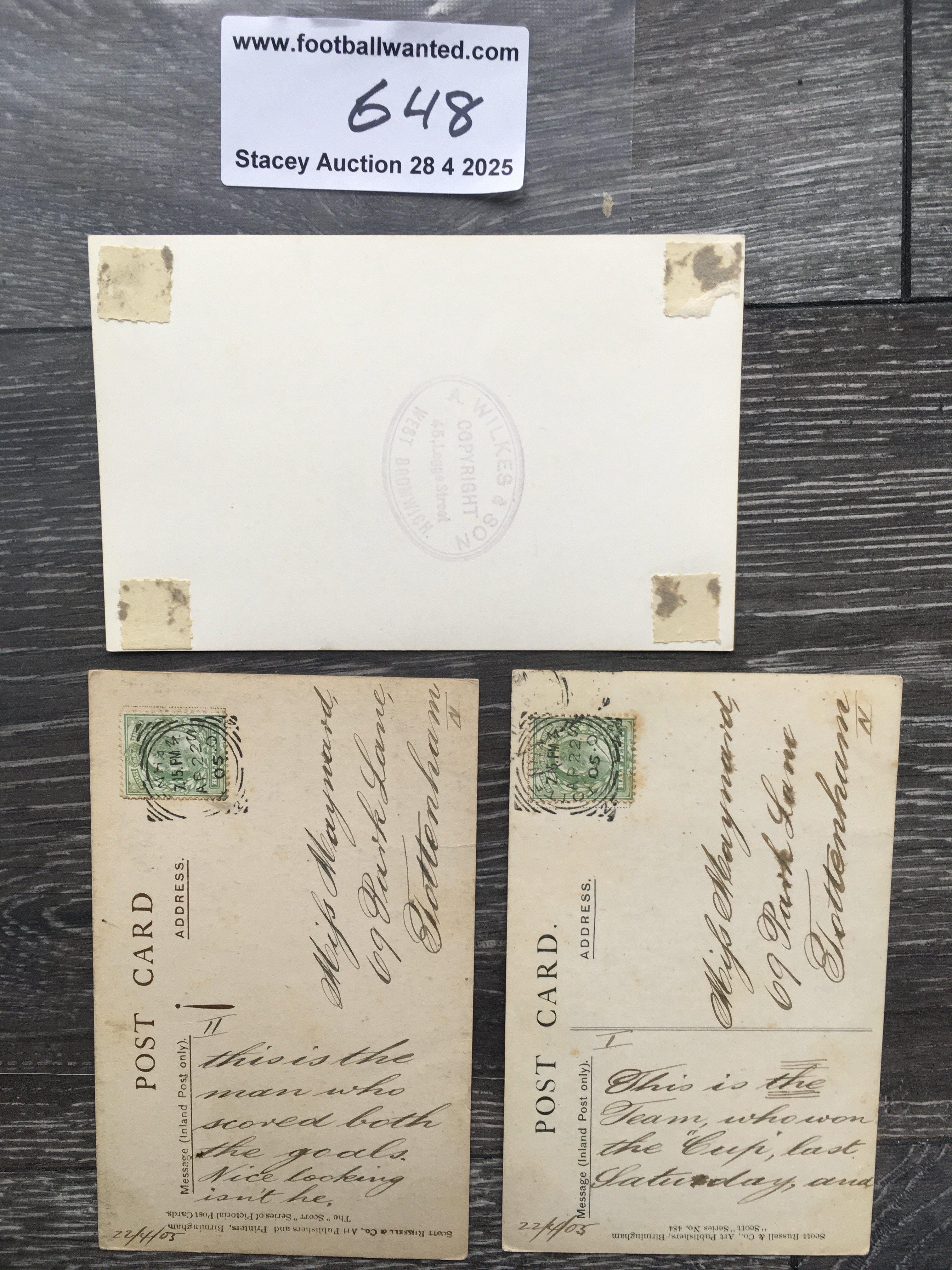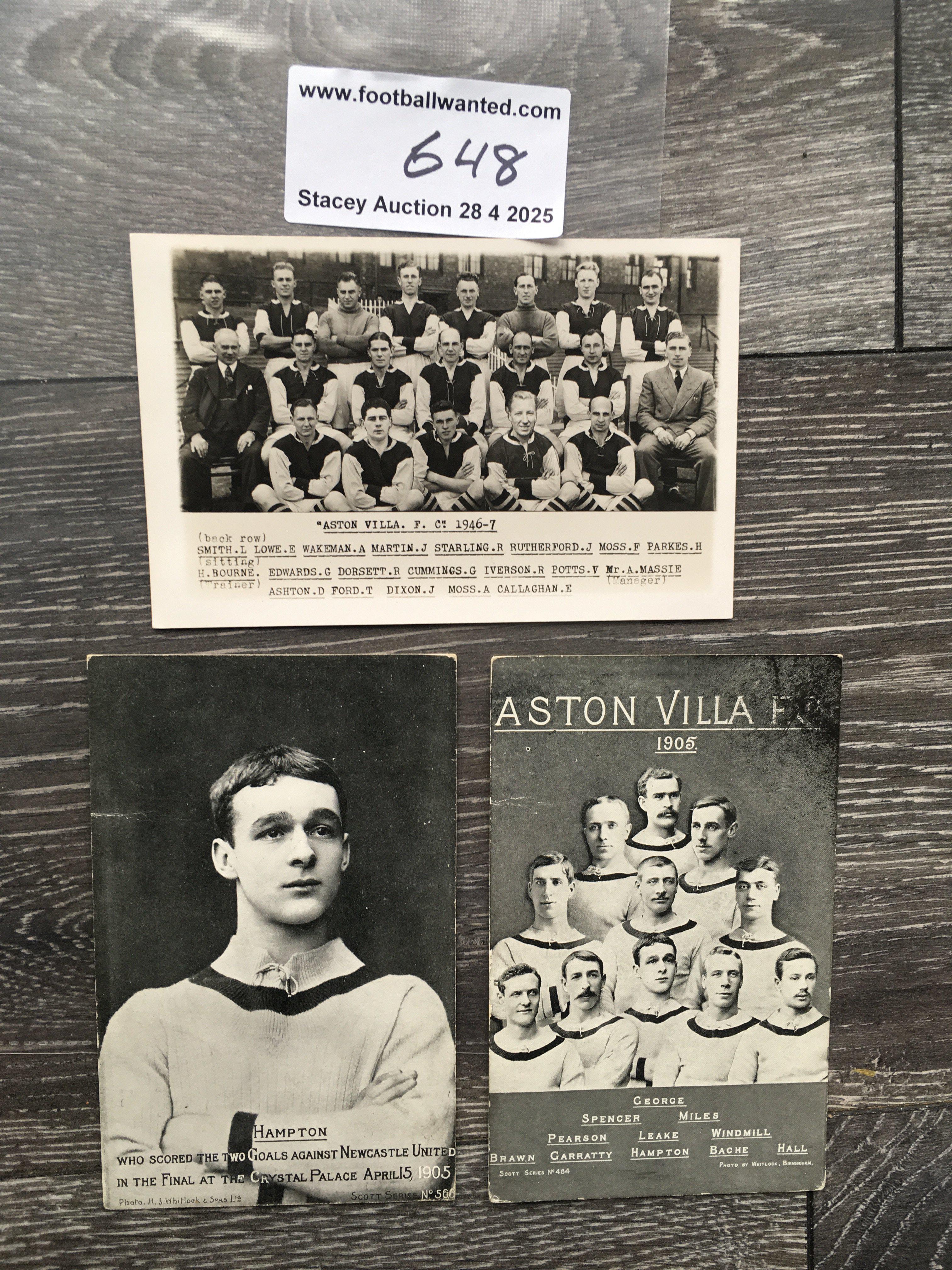 1905 Aston Villa FA Cup Winners Football Postcards: Team group plus individual player Hampton who scored two goals in the final. C/W 46/47 team group with press stamp that has previously been stuck down. (3)