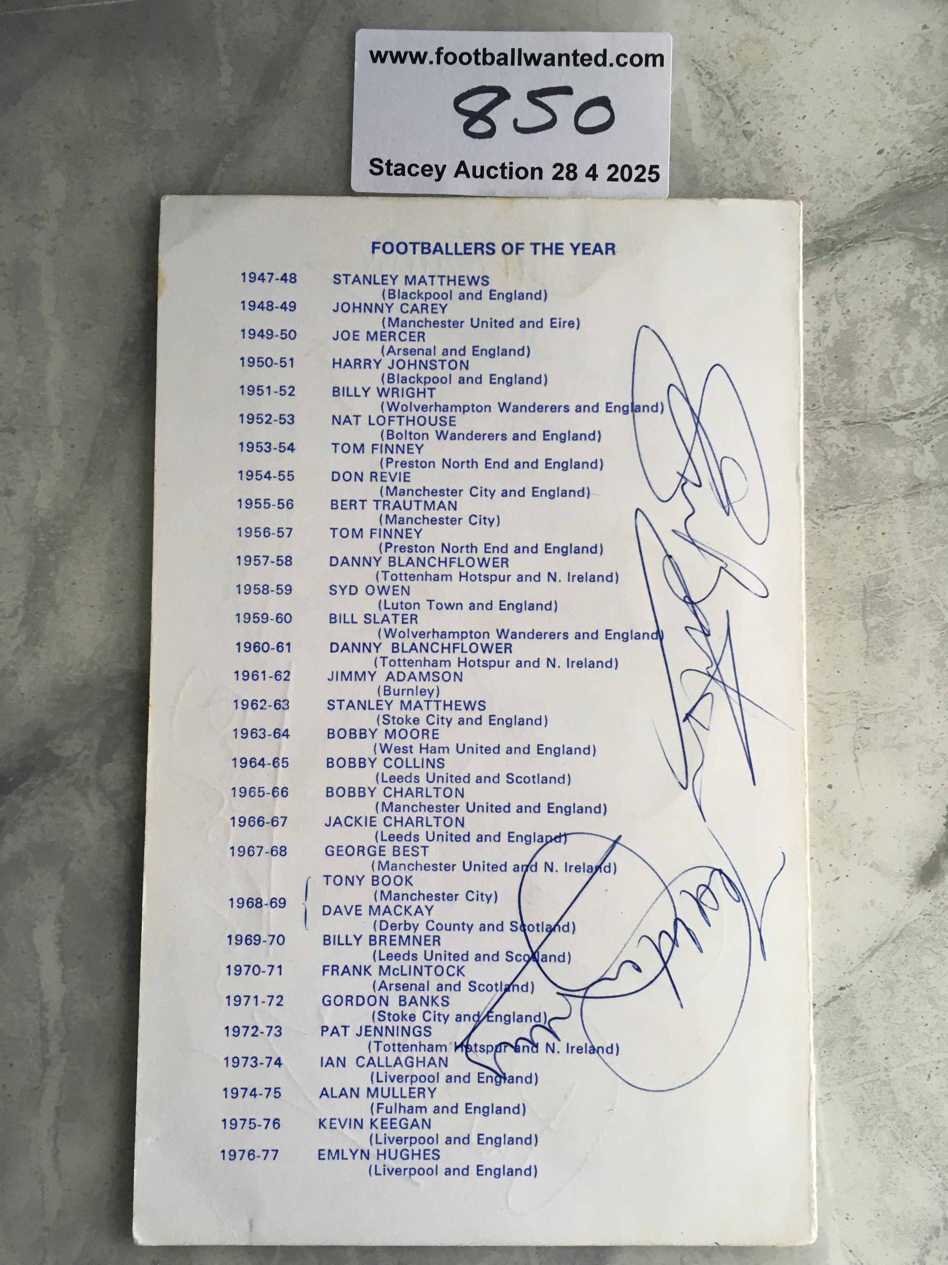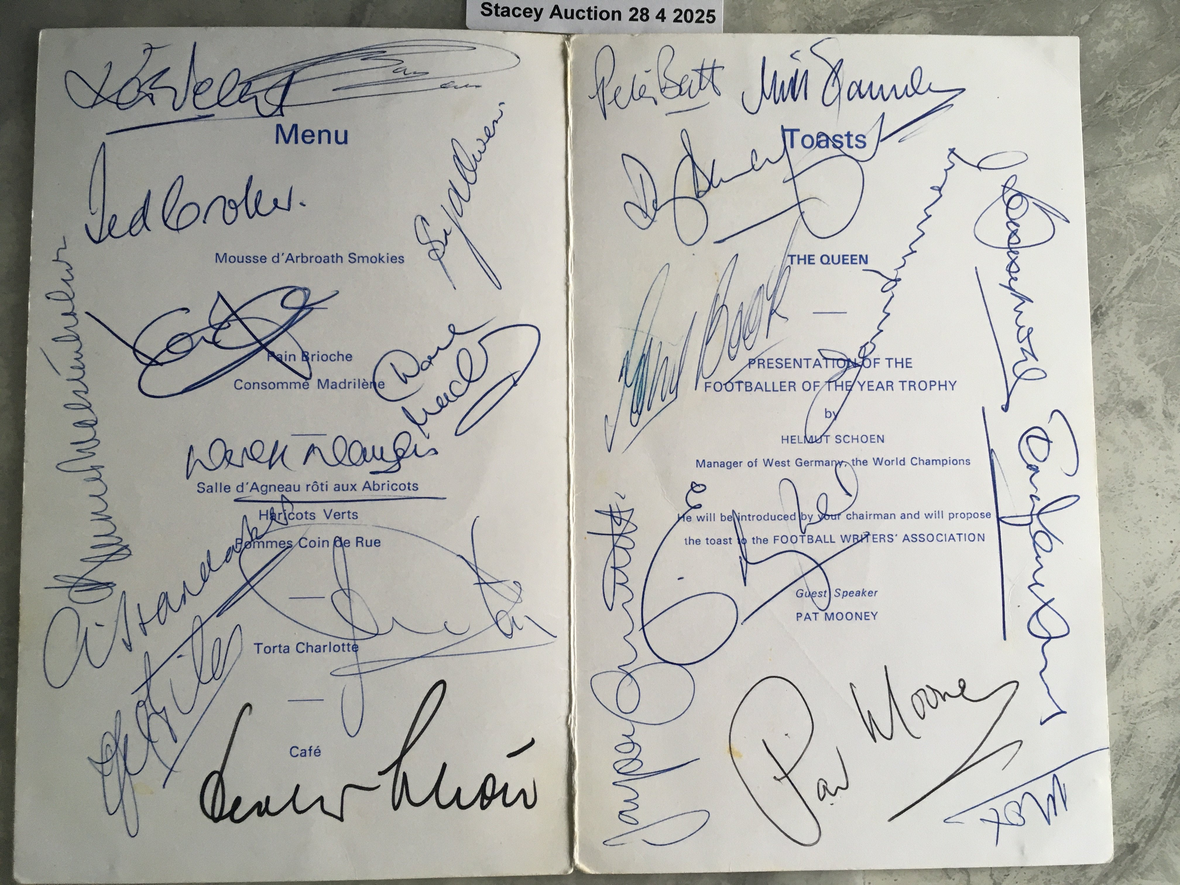 1977 Player Of The Year Multi Signed Football Menu: Football Writers annual event at the Cafe Royal London. Signed by winners Emlyn Hughes of Liverpool and England. List of previous winners who famously attend this event with autographs to include Bobby Moore Joe Mercer Danny Blanchflower Syd Owen Tony Book Tom Finney Jack Charlton Dave Mackay Terry Venables Ted Croker Derek Dougan Bob Paisley Brian Kidd Geoff Hurst and many more. Small tear at base of spine.