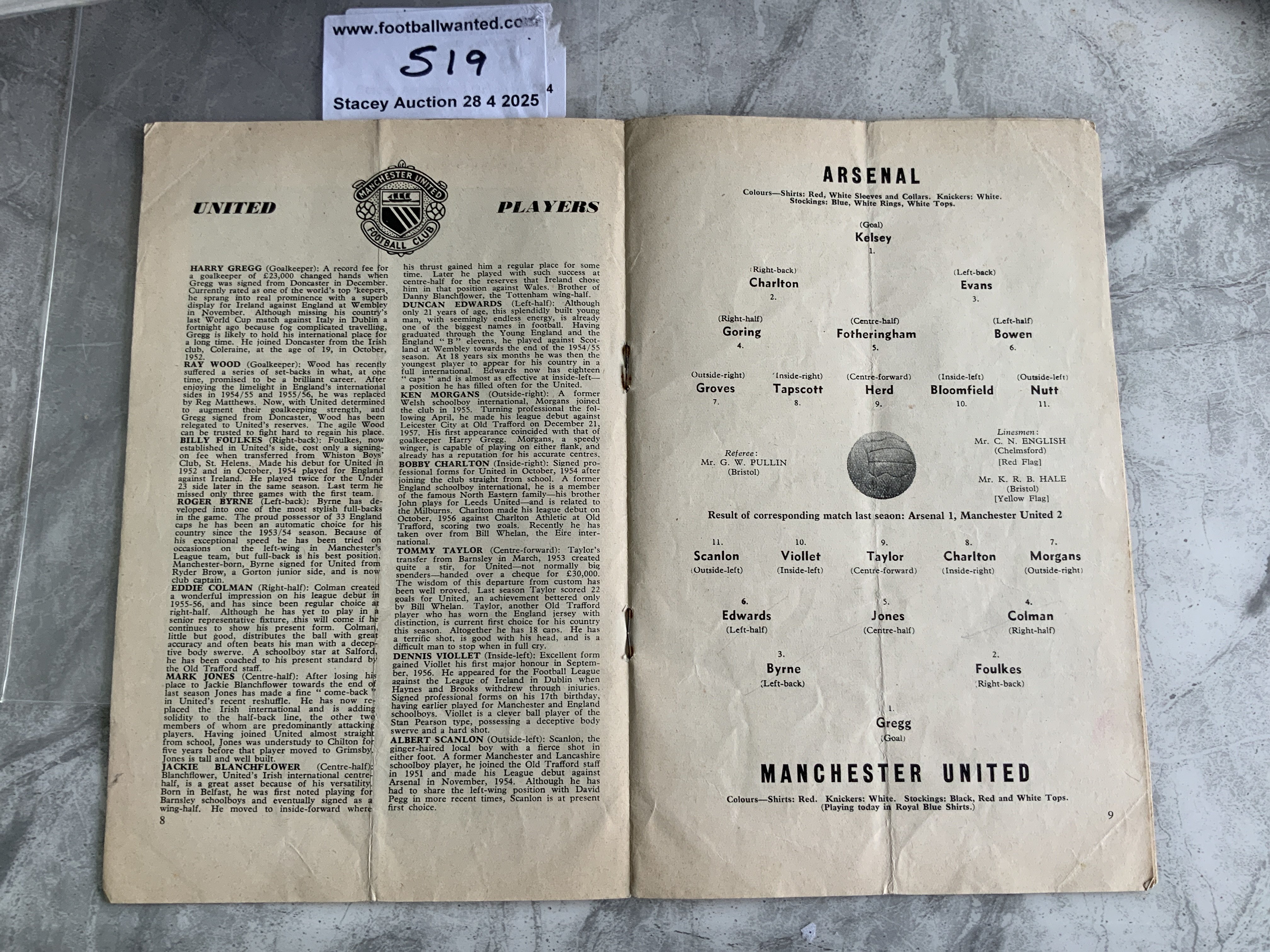 57/58 Arsenal v Manchester United Football Programme: Infamous last match in England before the Munich Tragedy sadly killing many of the Busby Babes. On a happier note thought to be the most exciting match at Highbury a 4-5 win for the Babes. No writing but only in fair condition due to a couple of tiny nicks to edge and a fold. Instructions to sell.
