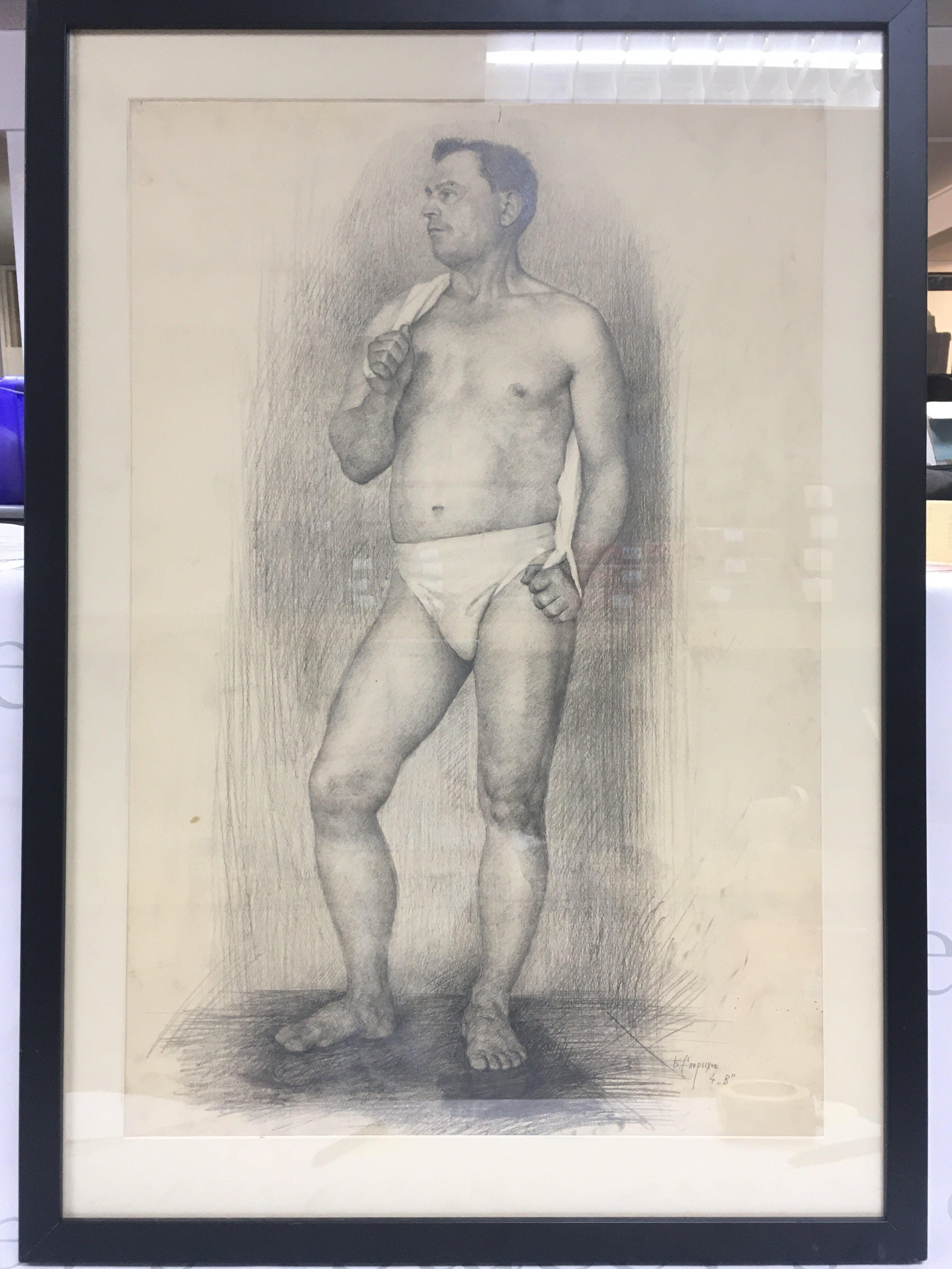 A framed sketch by Boris Sporykhin (1928-2020) or a standing male model circa 1950s. Dimensions 50x71cm.