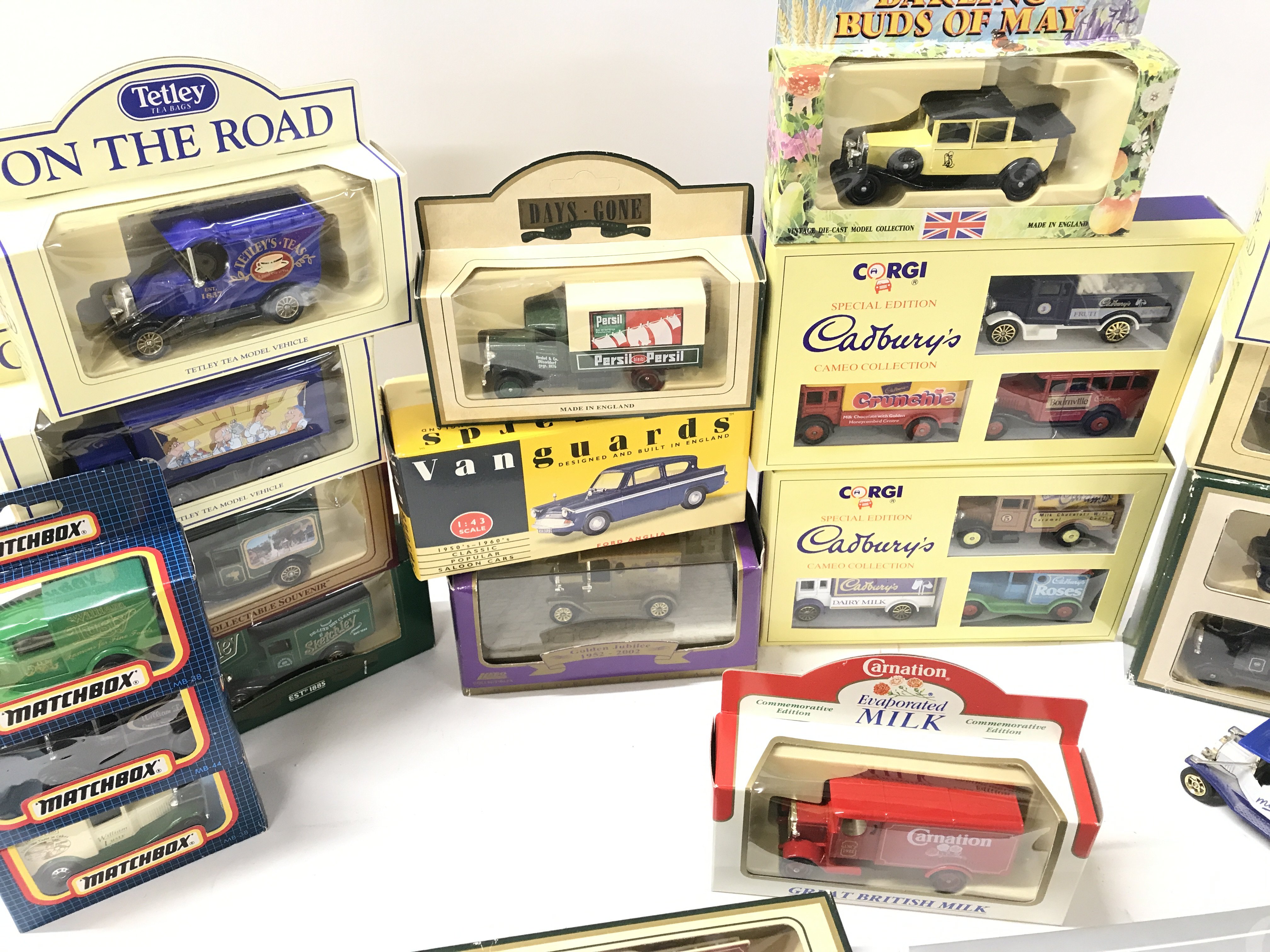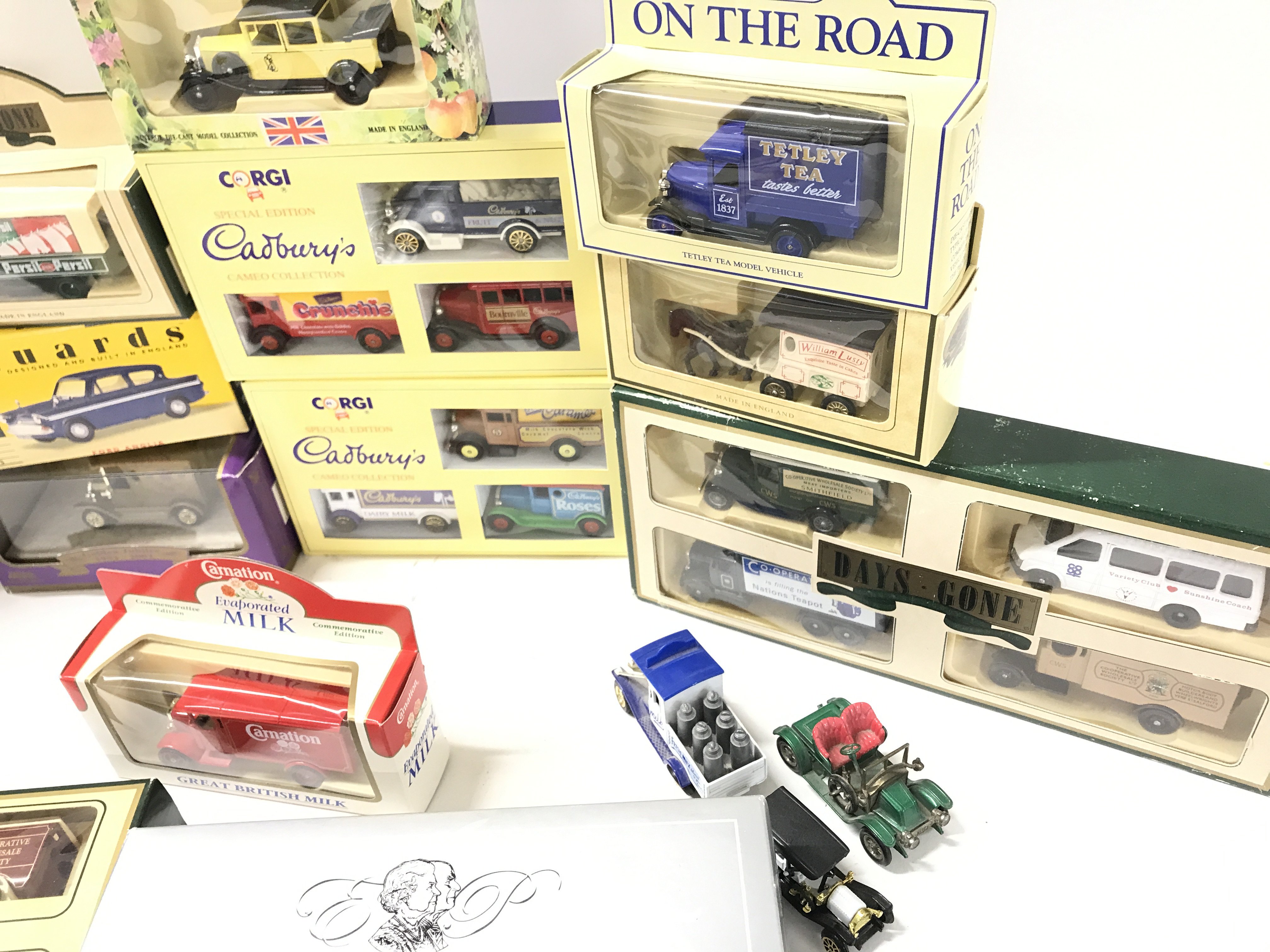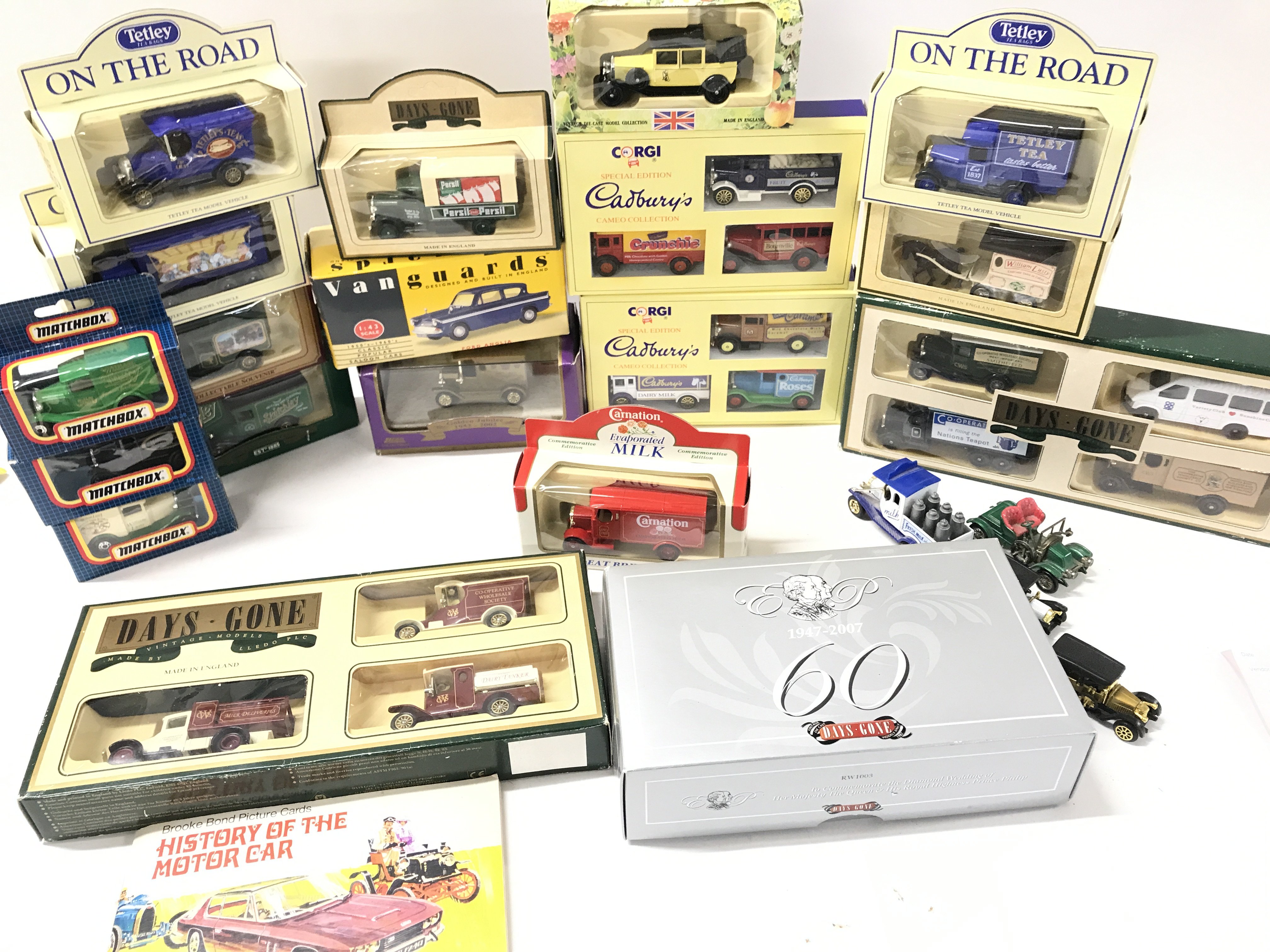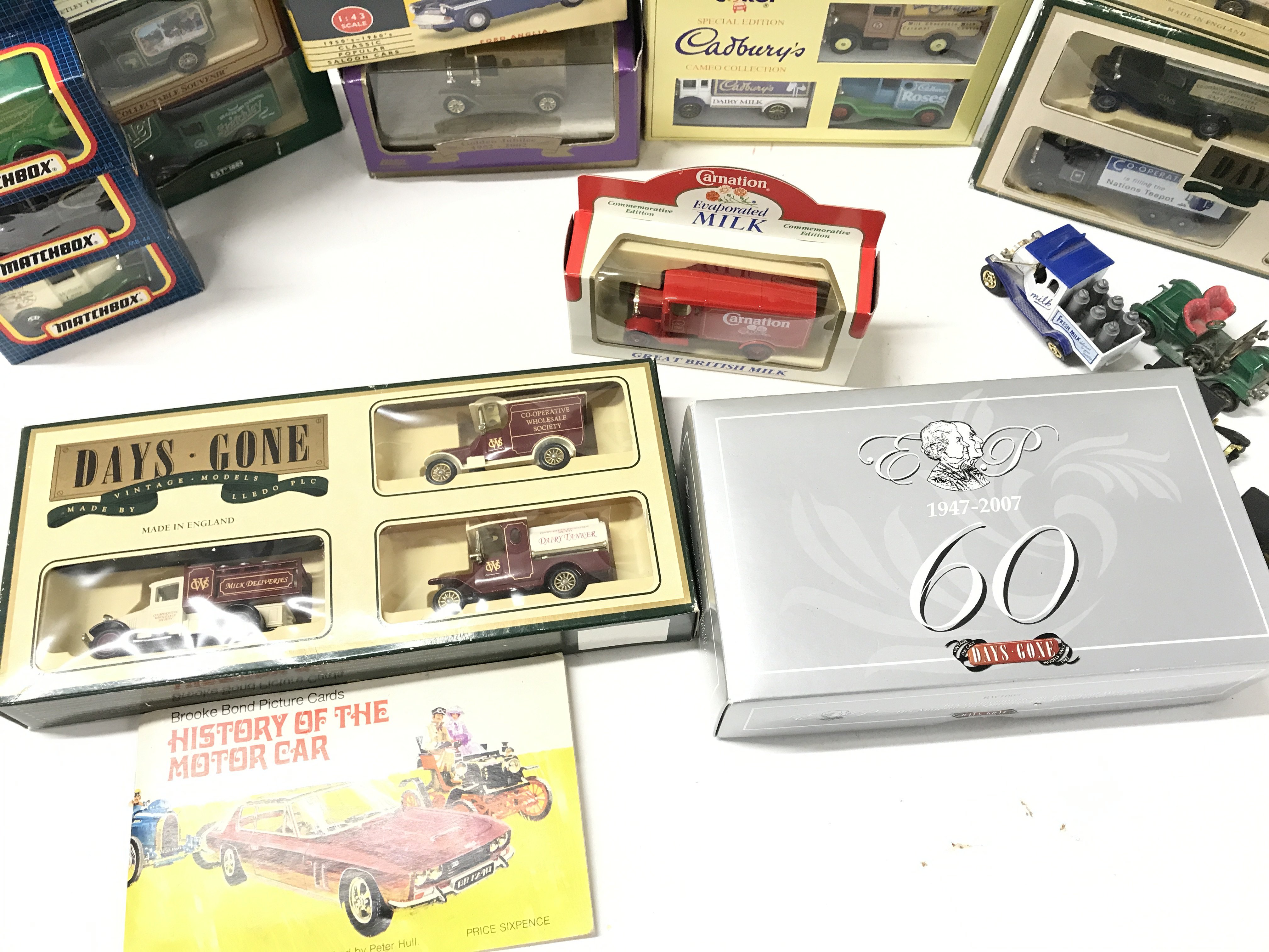 A Small Collection of Boxed Diecast Including Lledo.Corgi. Matchbox Etc and a Brooke Bond History Of Motor Car Card Collection.