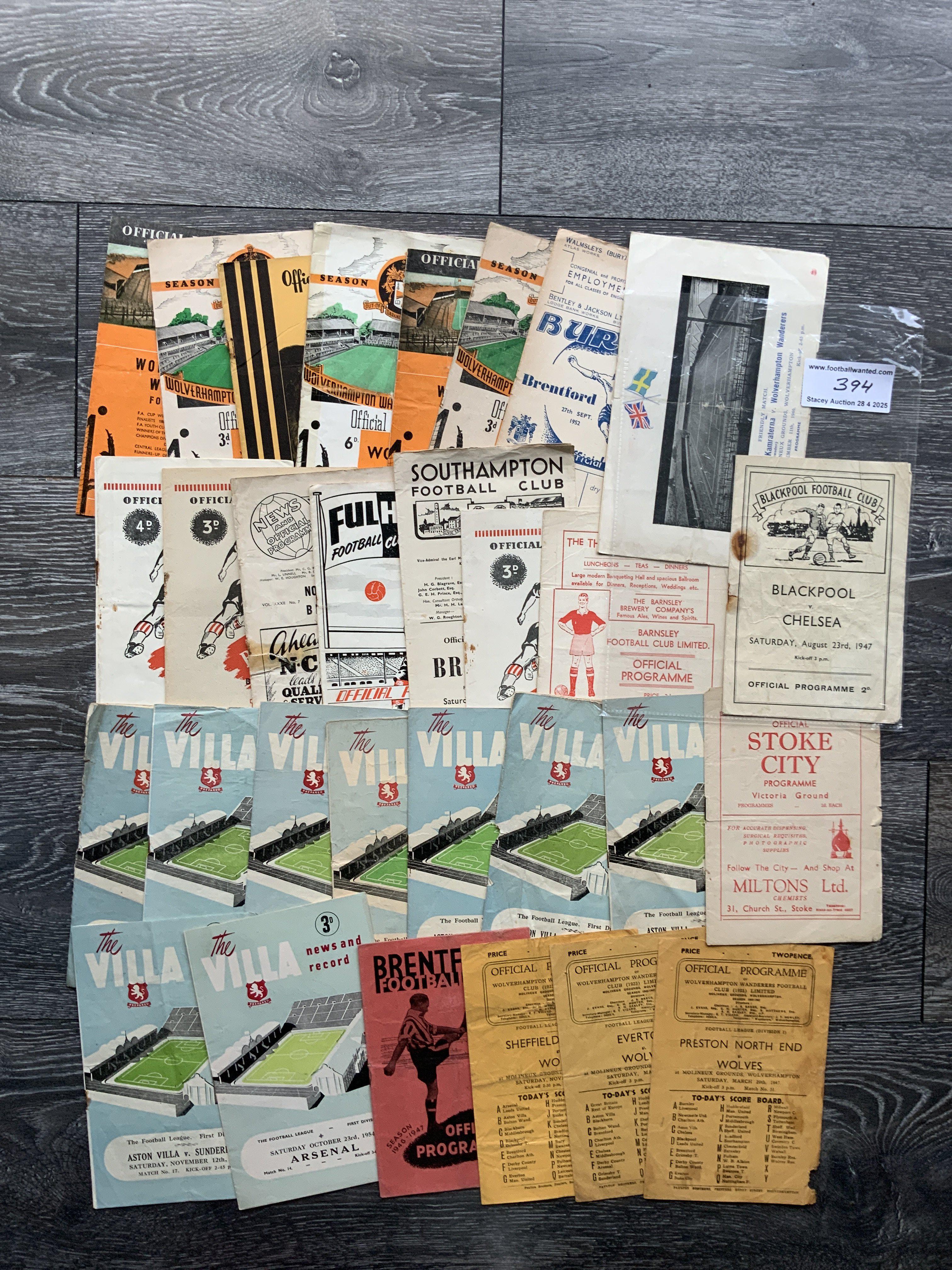 1940s + 1950s Football Programmes: Some nice programmes to include 46/47 Stoke v Aston Villa, Brentford v Derby, 47/48 Blackpool v Chelsea, 3 x Wolves 46/47 homes, 8 x 49/50 Aston Villa homes. A further 15 mainly early 50s homes. Mixed conditions. (30)