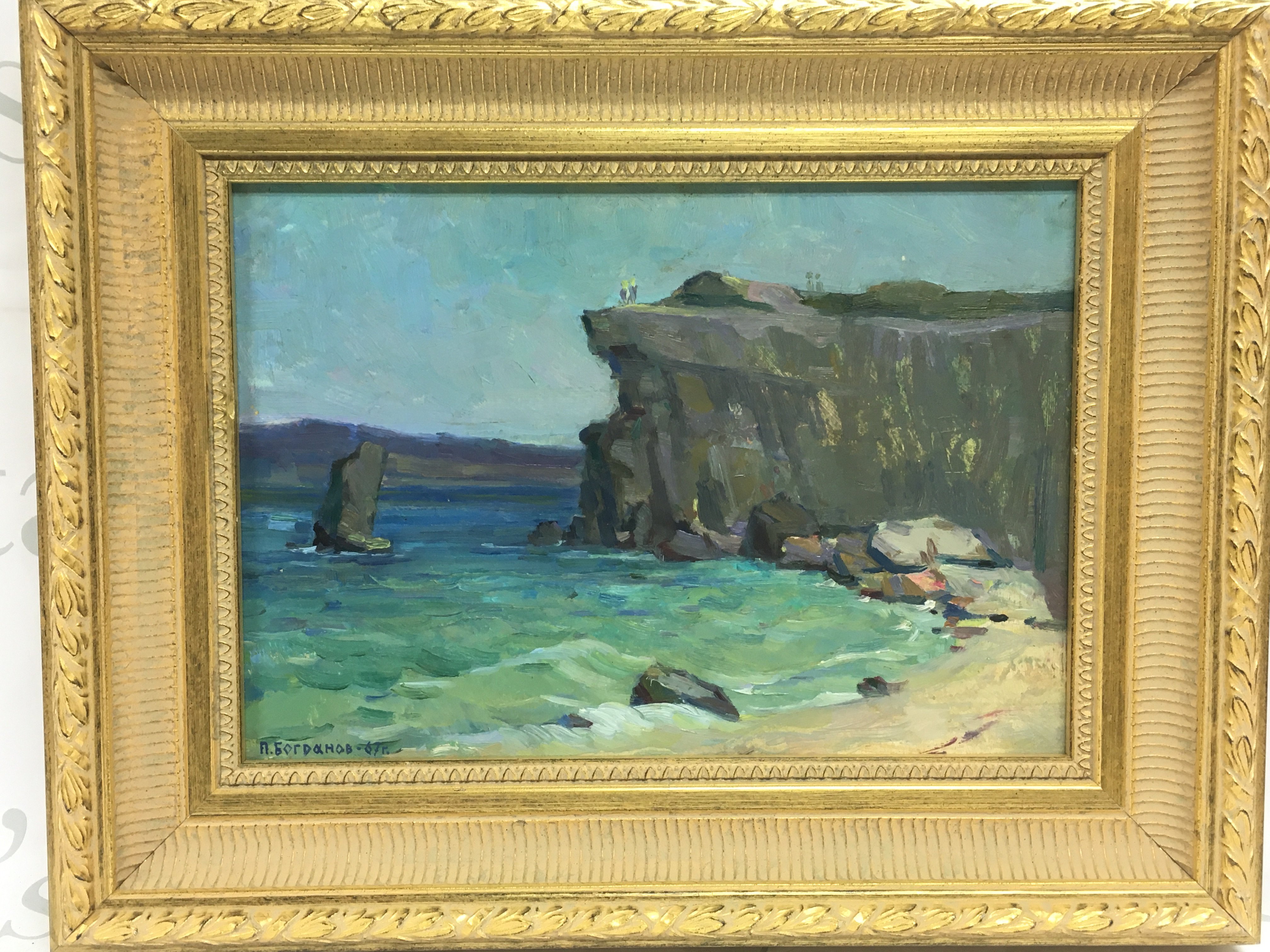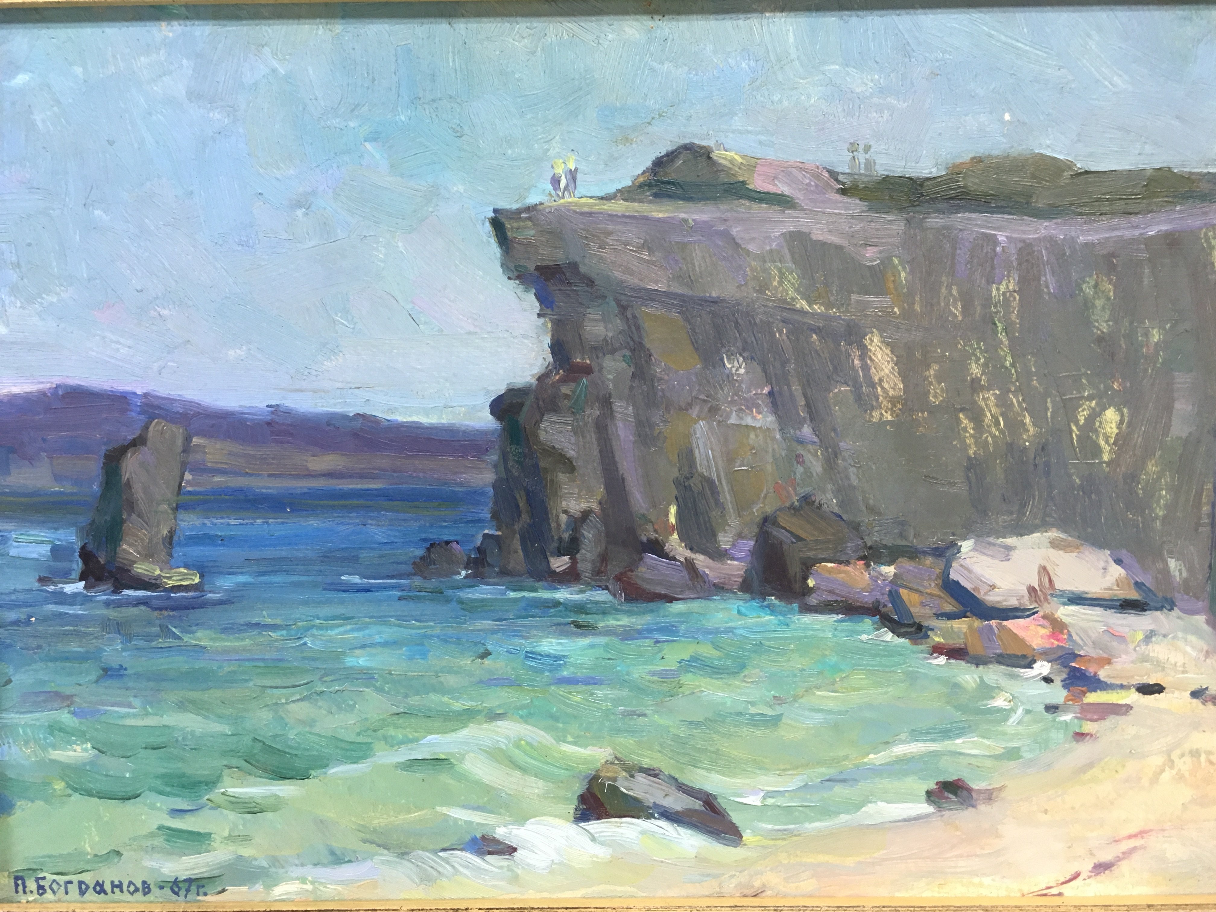 An oil painting by Pavel Bogdanov (1912-1996) depicting a Sea Cliff. Dimensions 46x36cm